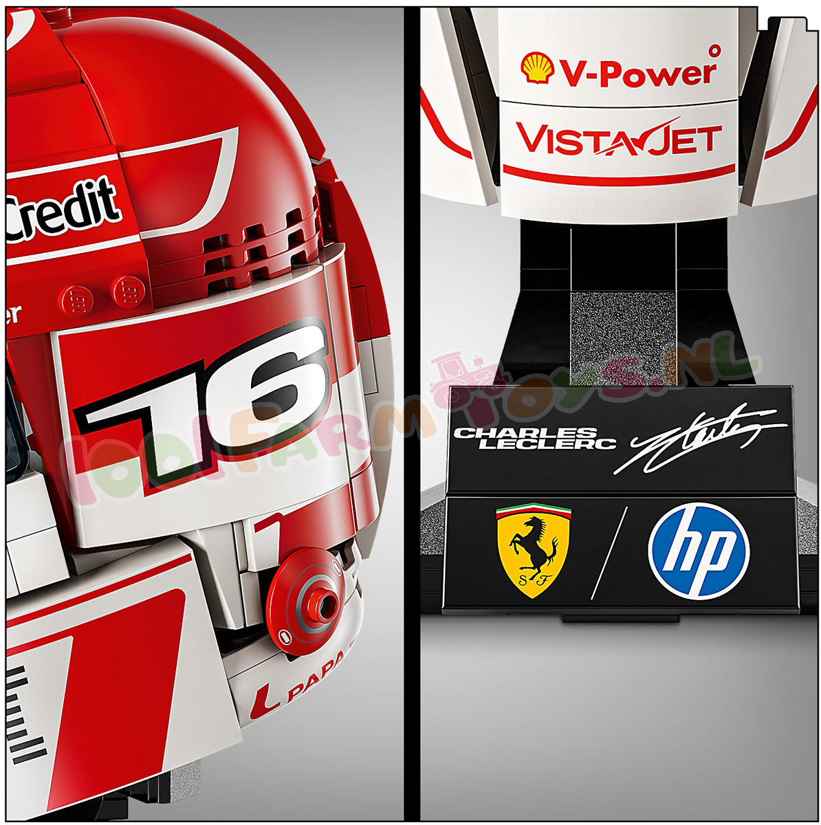 INCLUSIEF F1® MINIFIGUUR – de minifiguur van Charles Leclerc brengt deze F1®set tot leven en er is ook een bedrukt plaatje met zijn handtekening