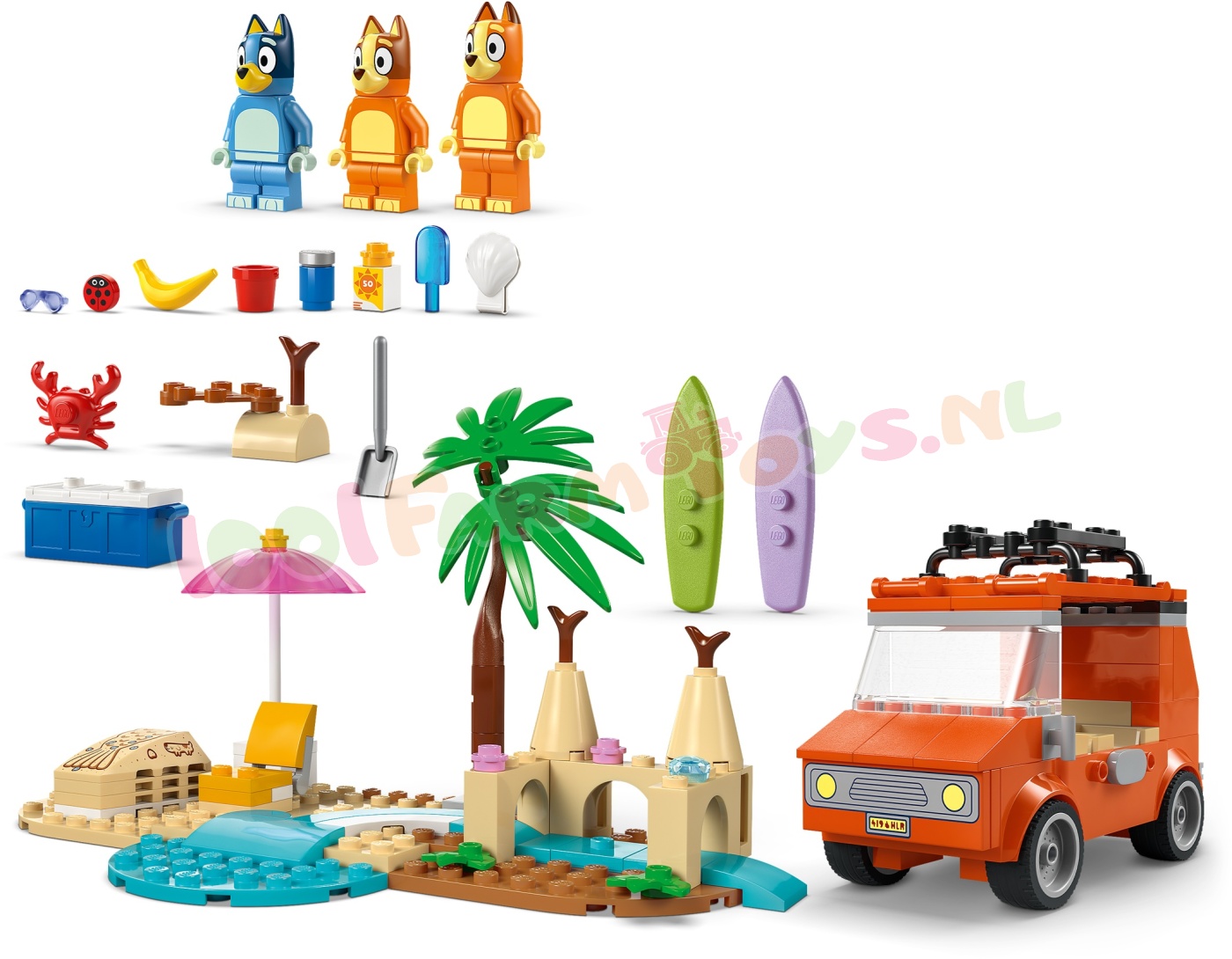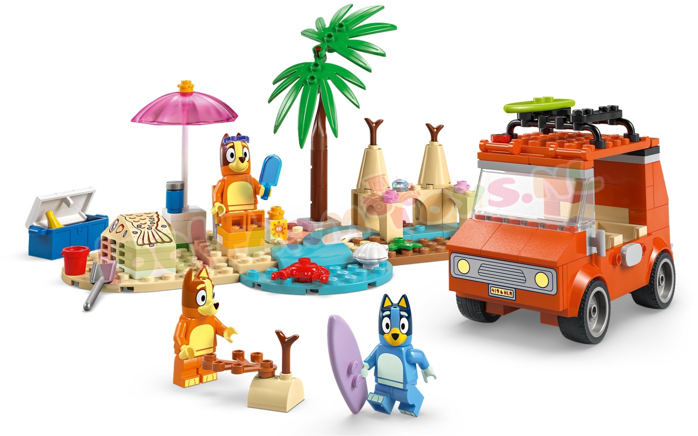 Dit LEGO® speelgoed bevat de bekende auto uit de tv-serie Bluey. met 2 surfplanken bovenop en een kofferbak aan de achterkant om de koelbox in op te bergen. Het dak kan open en er zijn zitplaatsen voor de minifiguren van Bluey. Bingo en Chilli (Bluey's moeder). Een indrukwekkend zandkasteel. een zandmeerminstaart waar een minifiguur in past. een strandstoel. een parasol en een palmboom zorgen voor fantasierijk speelplezier. Accessoires zijn onder andere een krab. een ijsje. een zonnebril en zonnebrandcrème.
