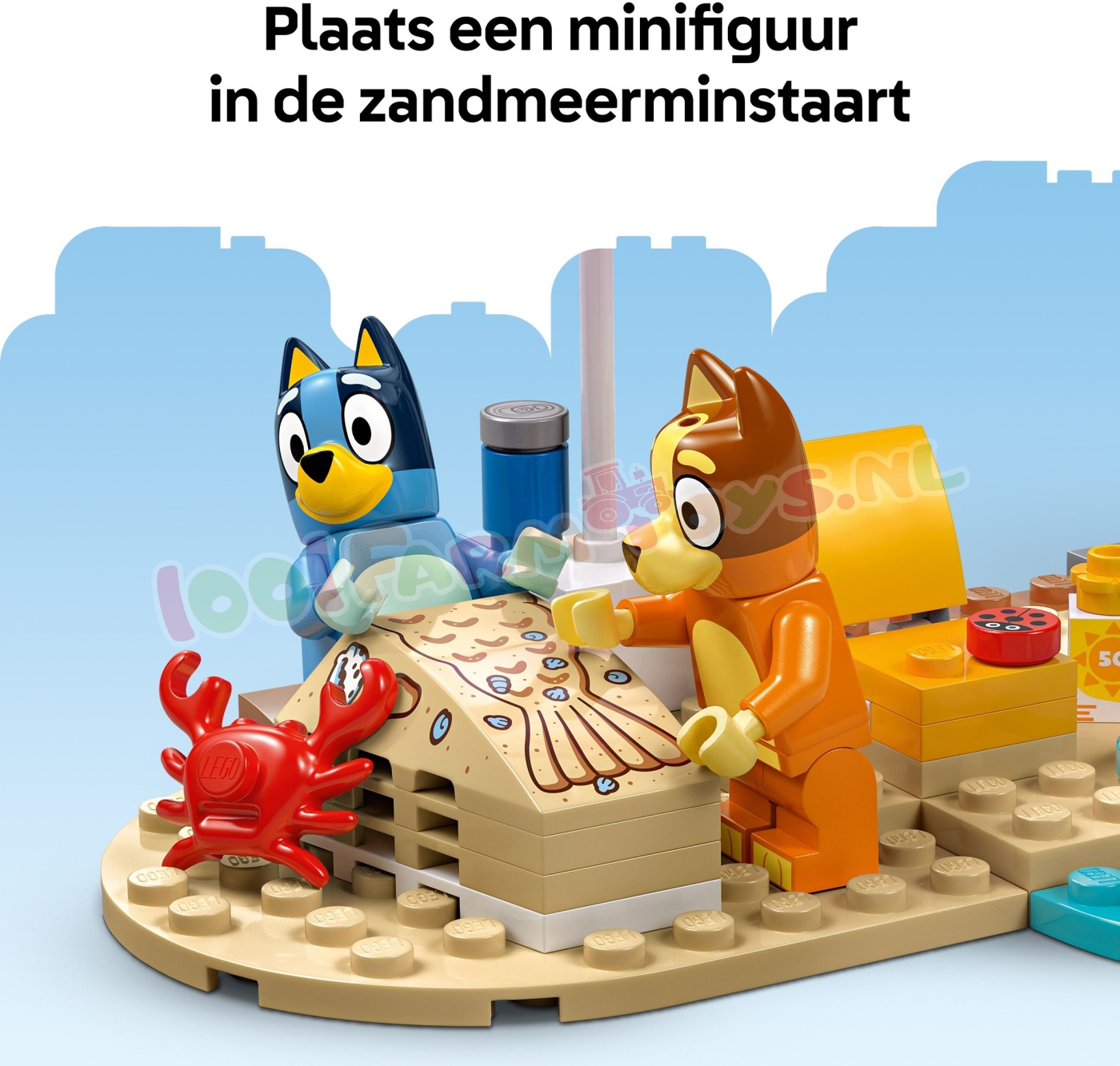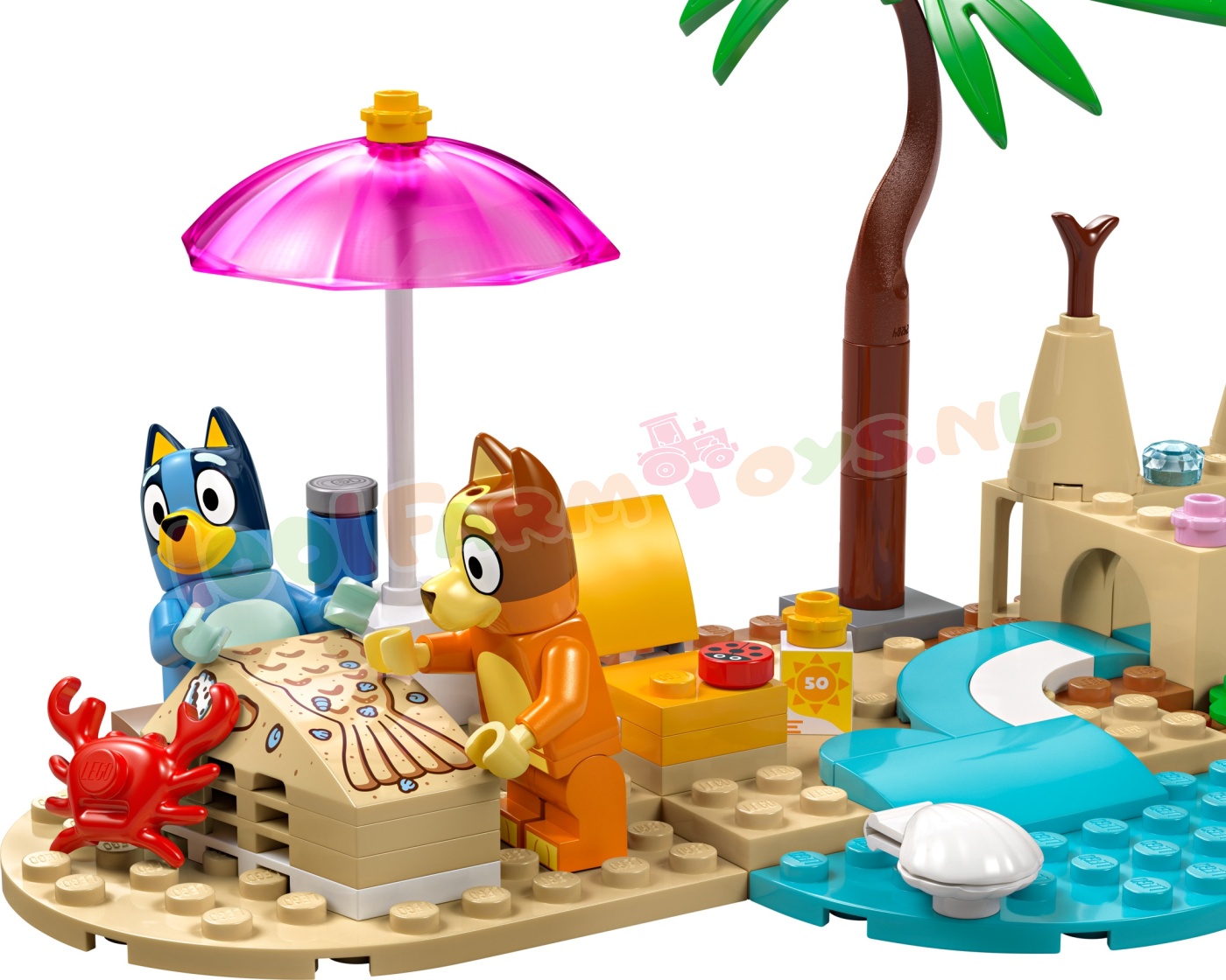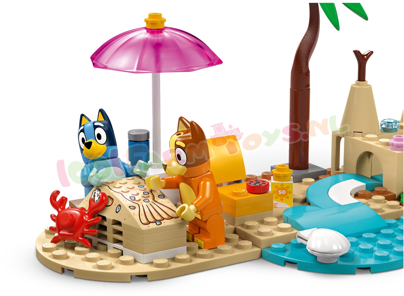 Fantasierijk speelplezier met Bluey op het strand – inclusief een zandkasteel. een zandmeerminstaart (waar een minifiguur in past). een ligstoel.een parasol. een palmboom. een krab. een ijsje. een zonnebril en zonnebrandcrème