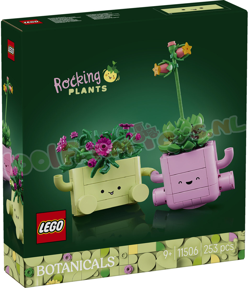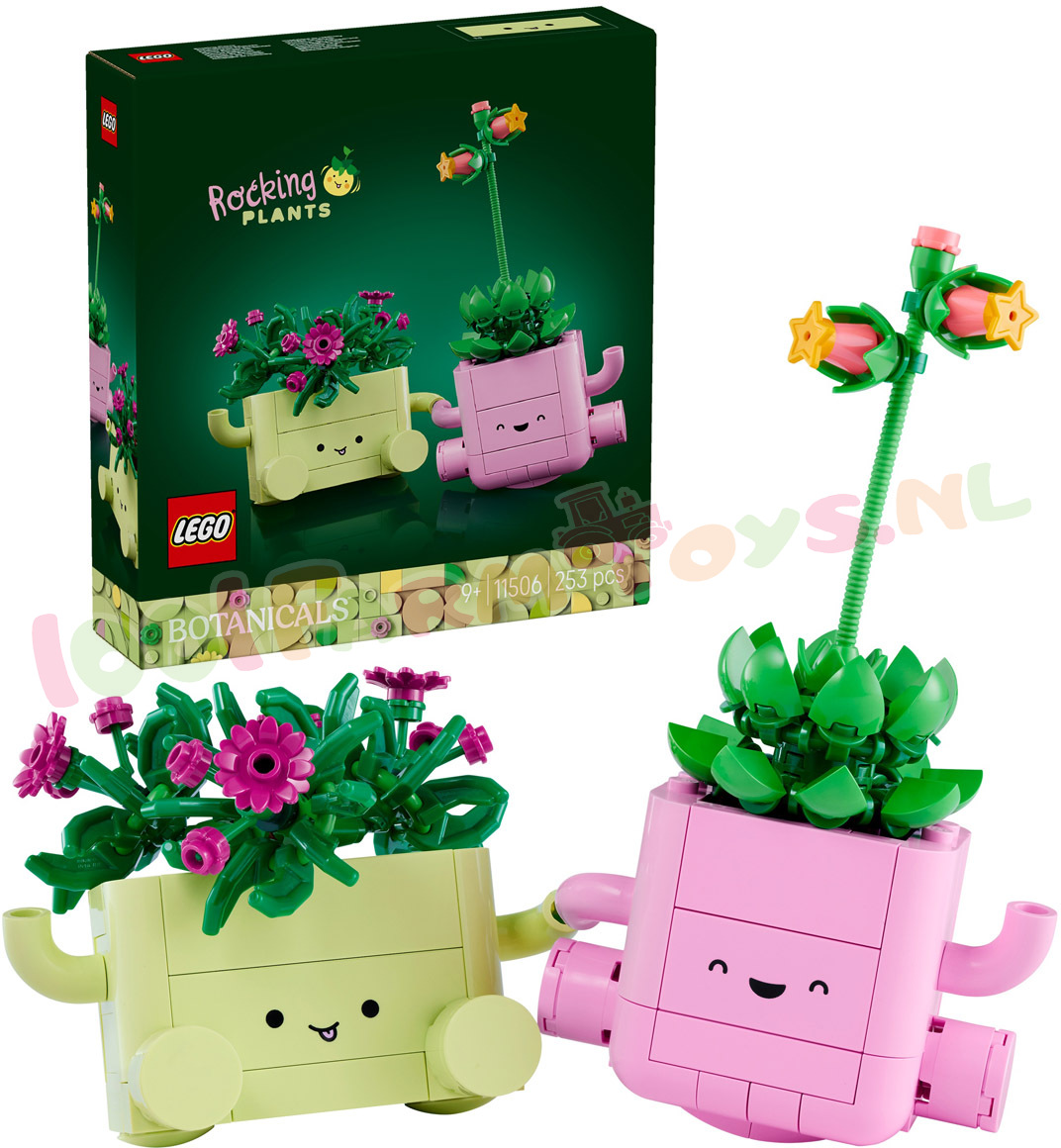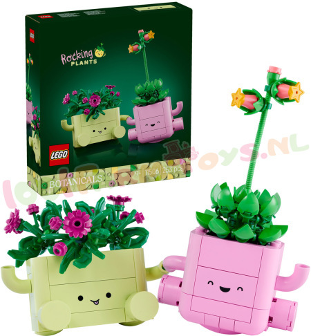 Bouw een leuk stukje plantendecoratie met deze LEGO® Botanicals Schommelende plantjes (11506) set voor meisjes. jongens en natuurliefhebbers vanaf 9 jaar. Geef je kamer een gezellig tintje door 2 vrolijke LEGO plantenmodellen te bouwen in pastelkleurige potjes: een delosperma (ijsbloem) genaamd Lumi met paarse knoppen en een echeveria genaamd Ellie met een lange stengel en koraalrode knoppen. De potten hebben schattige smileys en ronde bodems. zodat ze heen en weer schommelen als je ze een duwtje geeft – de lichtgroene plantenpot schommelt van voren naar achteren en de lichtroze plantenpot wiebelt van links naar rechts. Extra leuk: beide LEGO plantjes passen in beide potten en kunnen zelfs worden verwisseld met de potten in de set Vrolijke plantjes (10349). apart verkrijgbaar. Dit stimuleert kinderen om creatief te zijn en een persoonlijke plantendisplay te bouwen om in hun kamer neer te zetten. Deze bloemenbouwset is een geweldige cadeautip voor plantenliefhebbers. dus geef deze schattige modellen cadeau voor een verjaardag of de feestdagen – of hou ze lekker zelf. De set bevat 253 onderdelen.