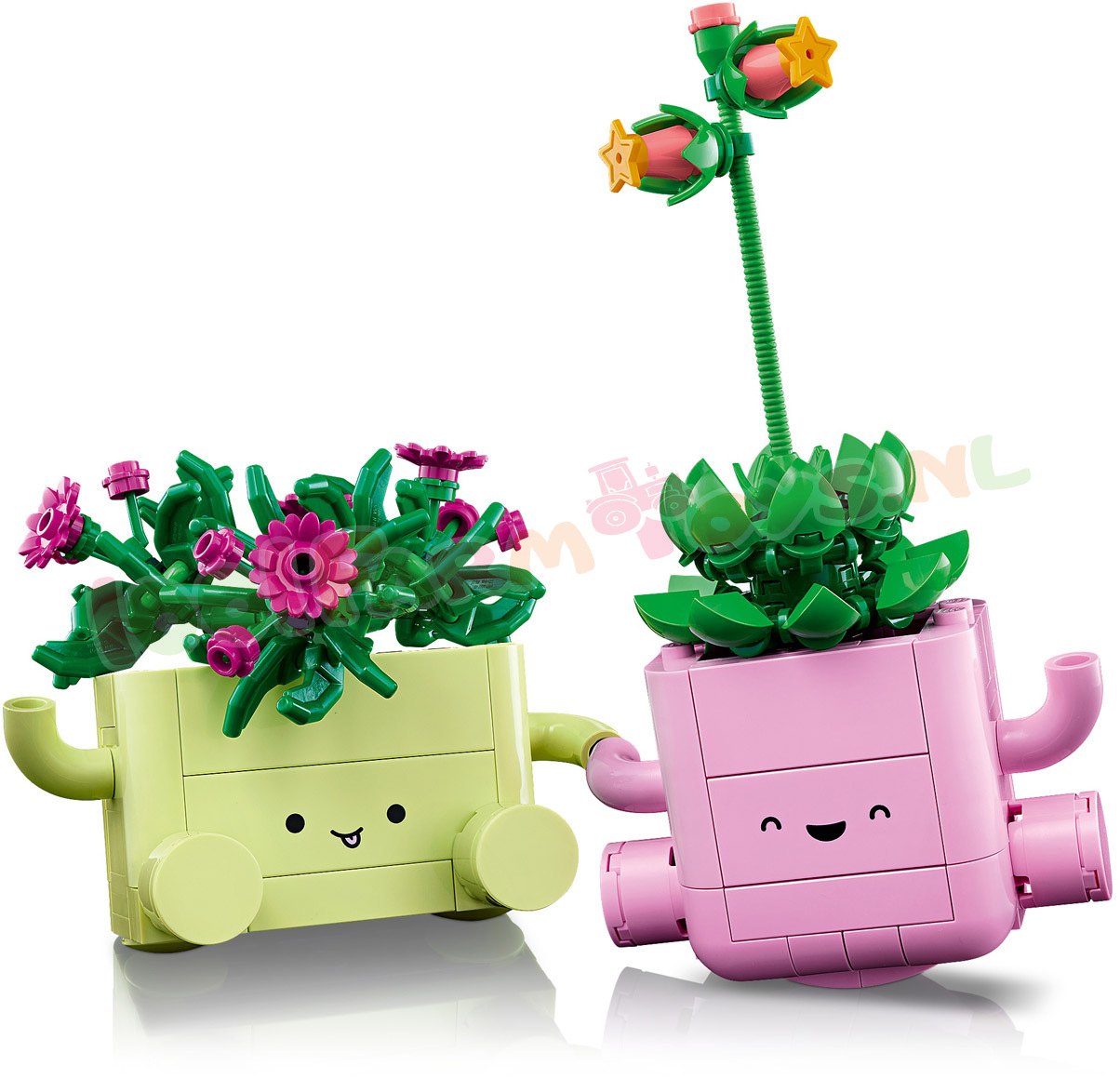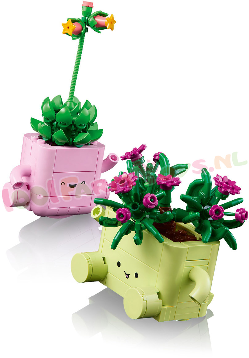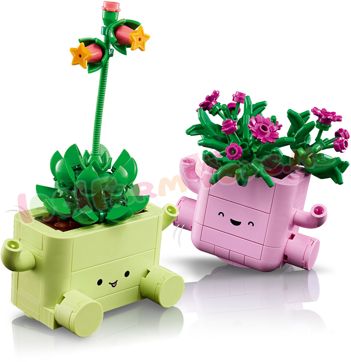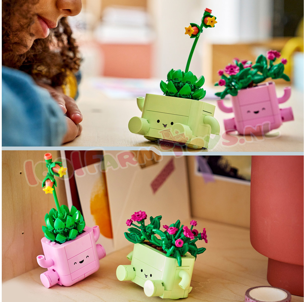 2 LEGO® PLANTJES – bouw een delosperma (ijsbloem) genaamd Lumi met paarse knoppen en een echeveria genaamd Ellie met een lange stengel en koraalrode knoppen. plus 2 plantenpotten met armen. benen en smileygezichtjes
