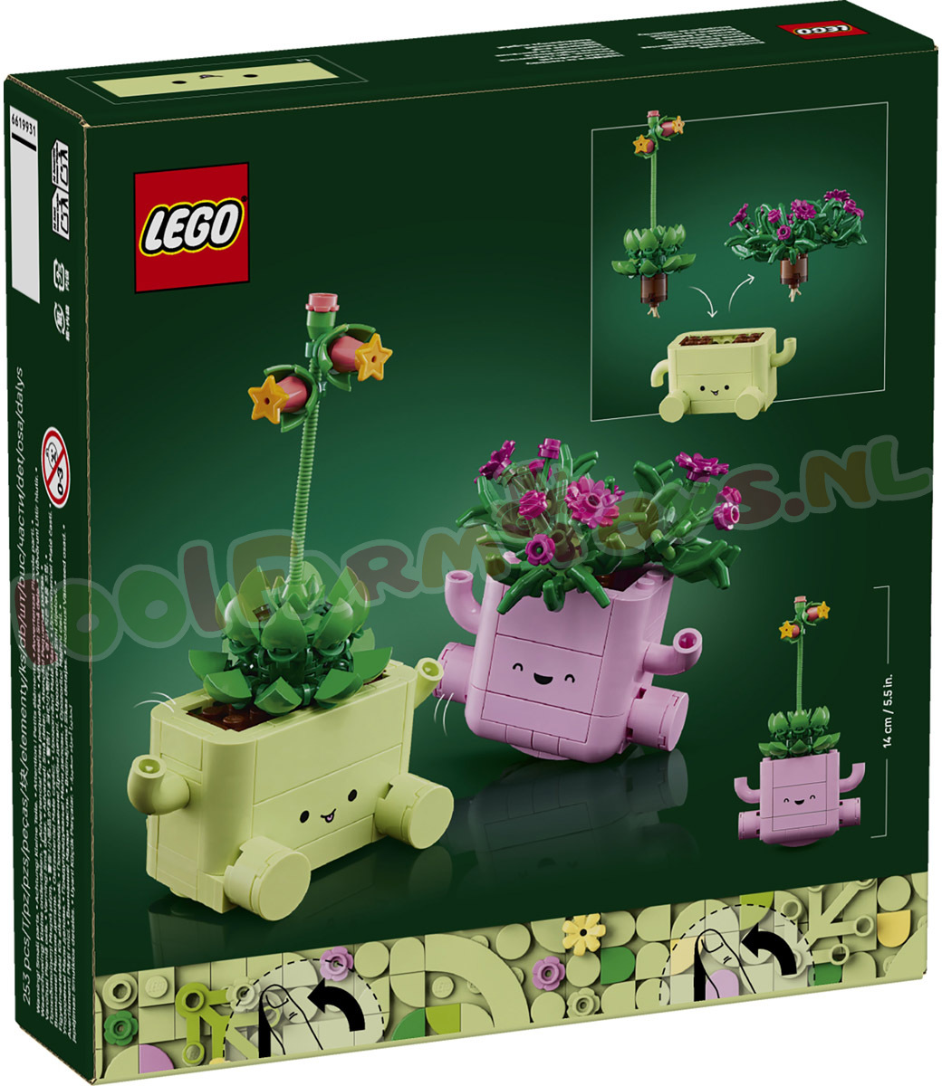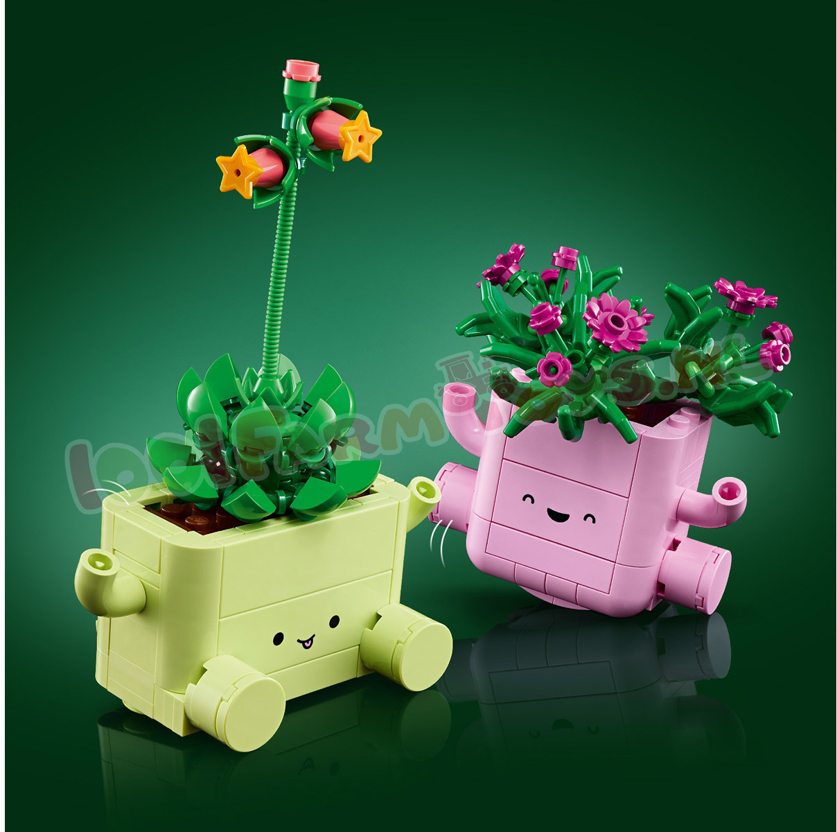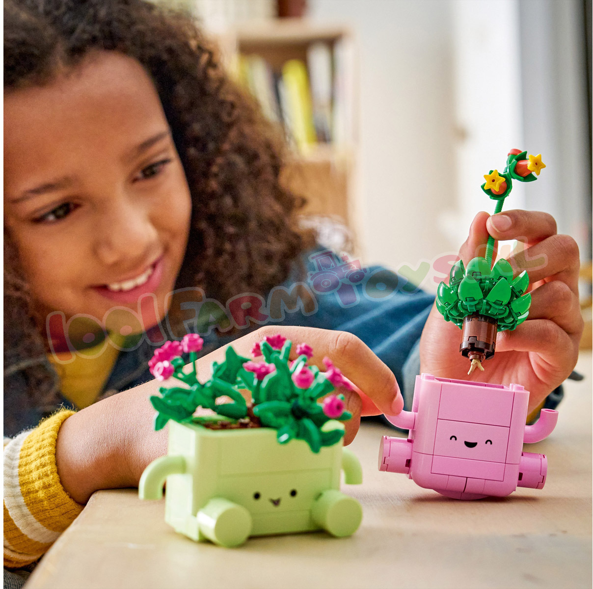 2 LEGO® PLANTJES – bouw een delosperma (ijsbloem) genaamd Lumi met paarse knoppen en een echeveria genaamd Ellie met een lange stengel en koraalrode knoppen. plus 2 plantenpotten met armen. benen en smileygezichtjes
