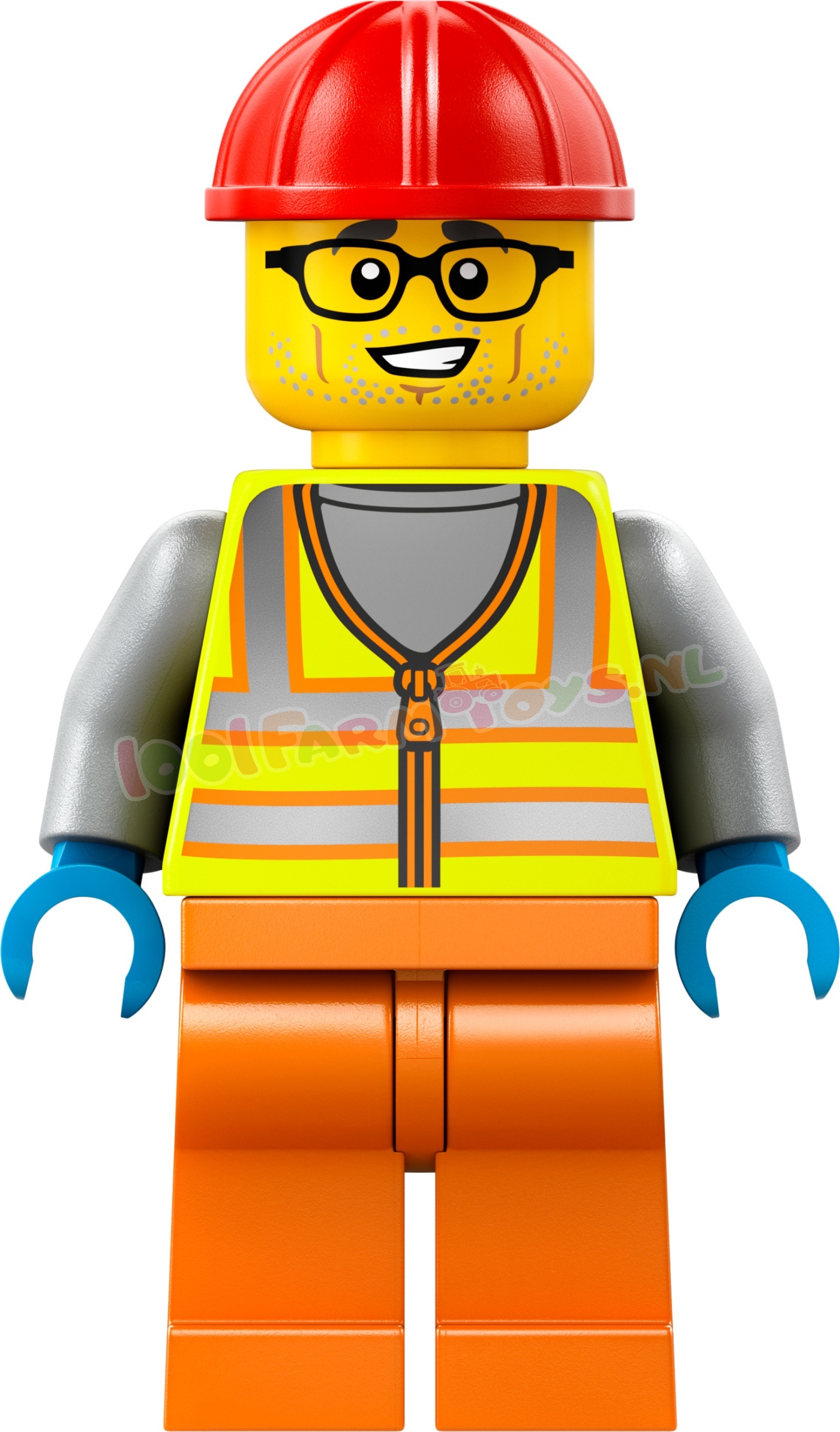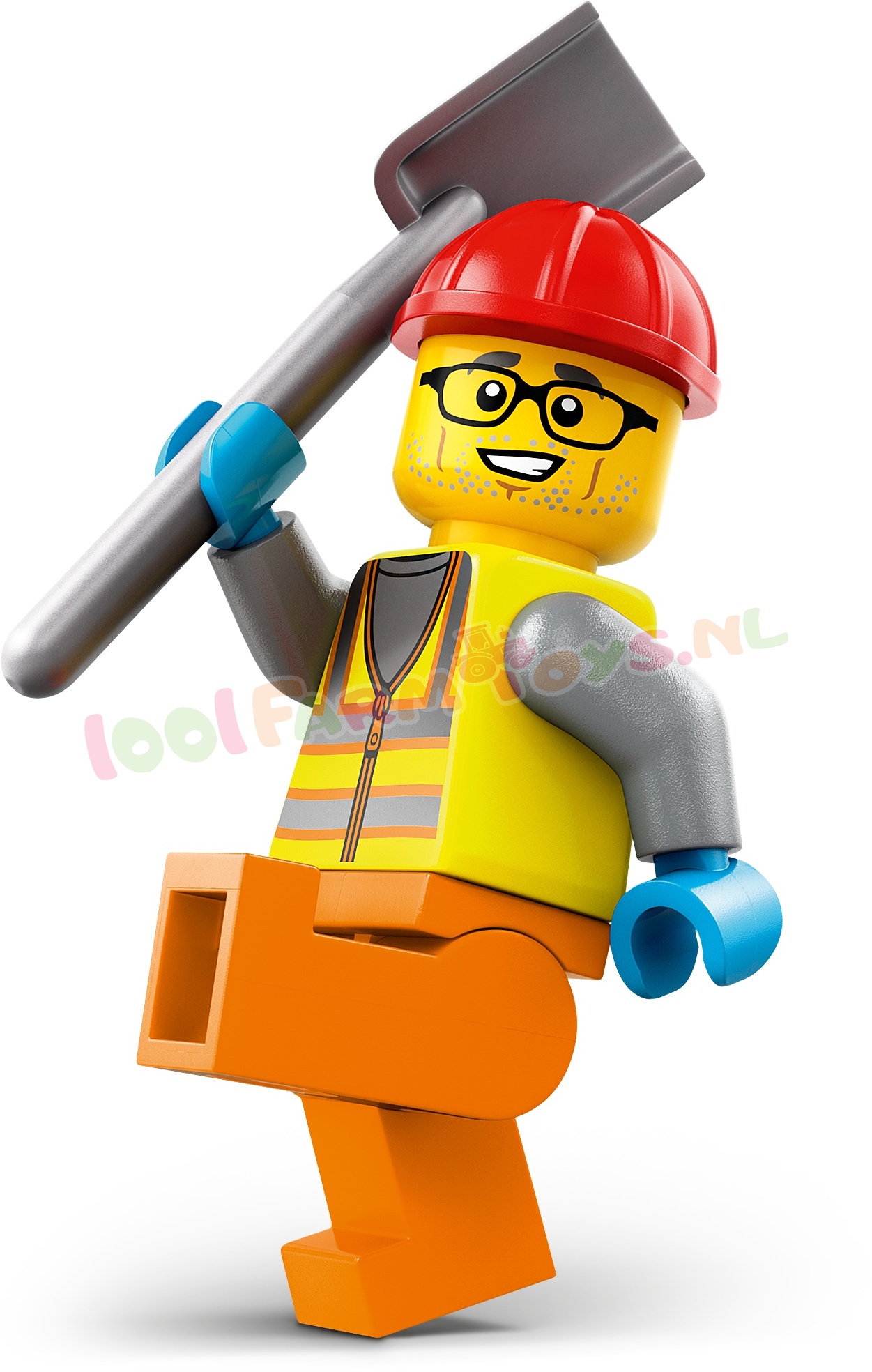 Wat zit er in de doos? – alles wat kinderen nodig hebben om een stoomwals te bouwen met eenbestuurderscabine en een 'zwaailicht'. plus een minifiguur van een bouwvakker met een schep en een veiligheidshelm