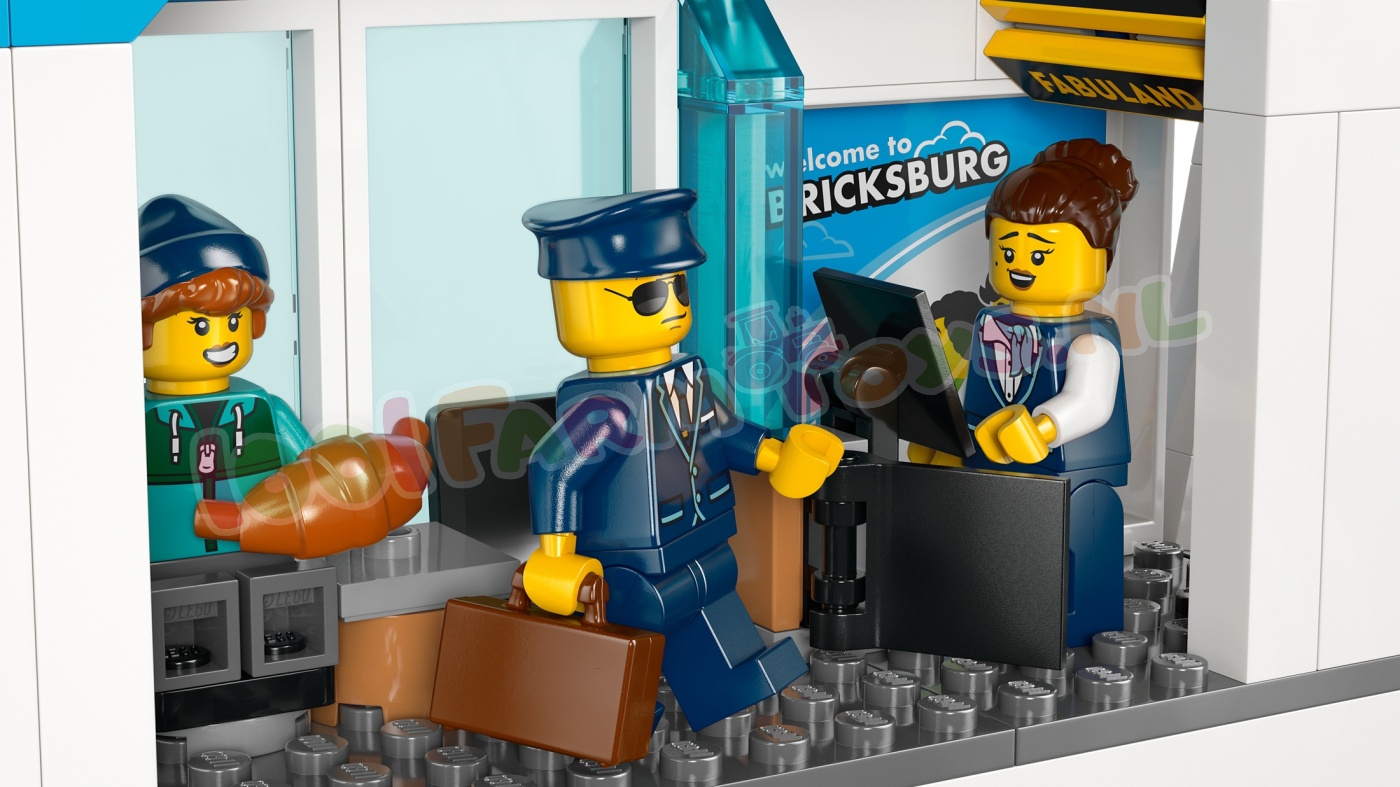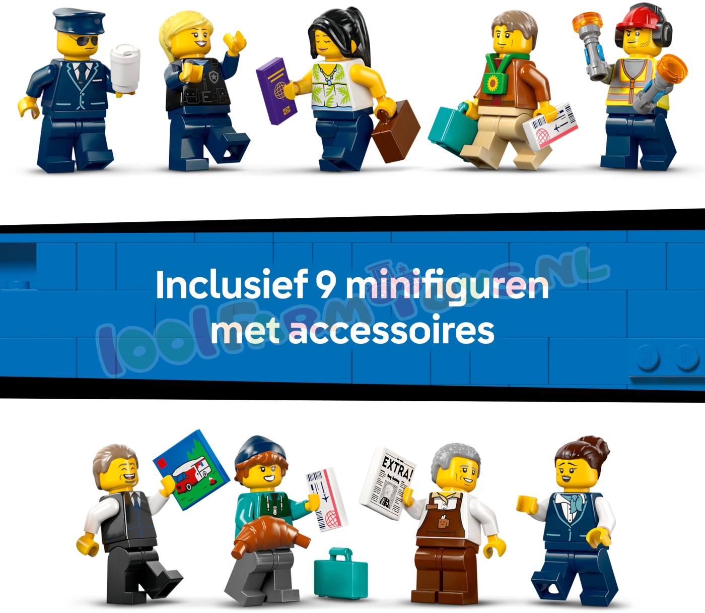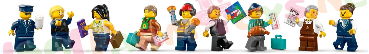 MINIFIGUURACCESSOIRES – deze speelgoedluchthavenset wordt geleverd met LEGO® accessoires. waaronder 3 koffers. 2 instapkaarten. stokken voor het marshallen. een zonnebloemkoord. paspoort. krant. kaart en croissant