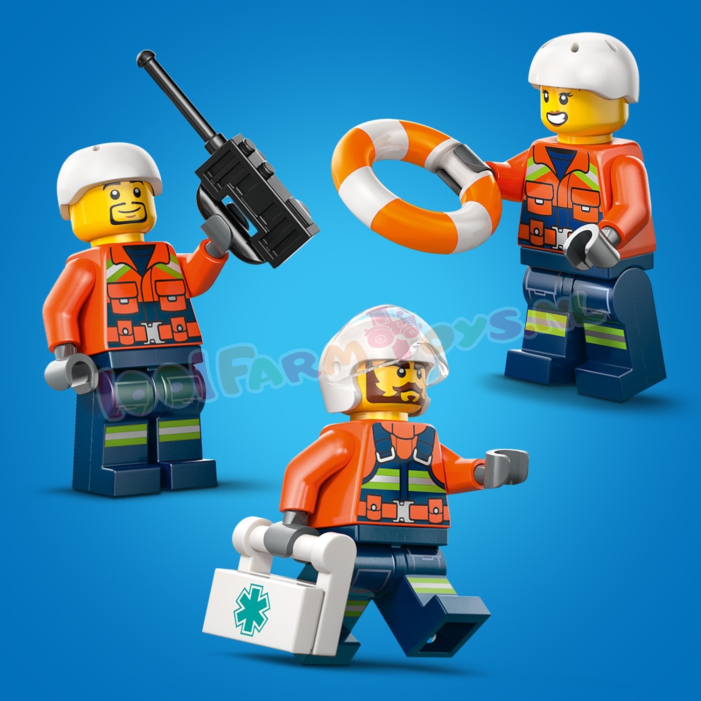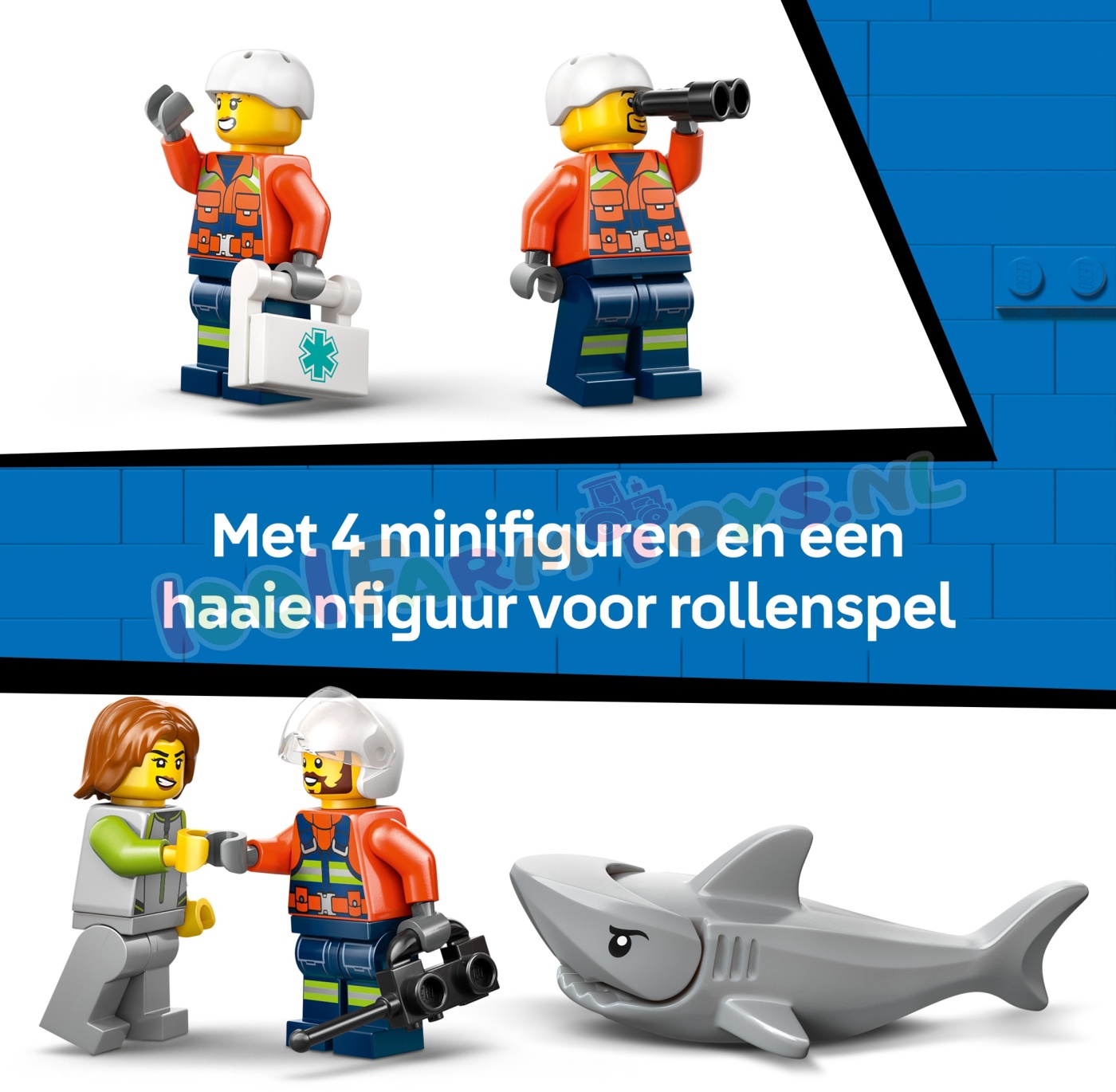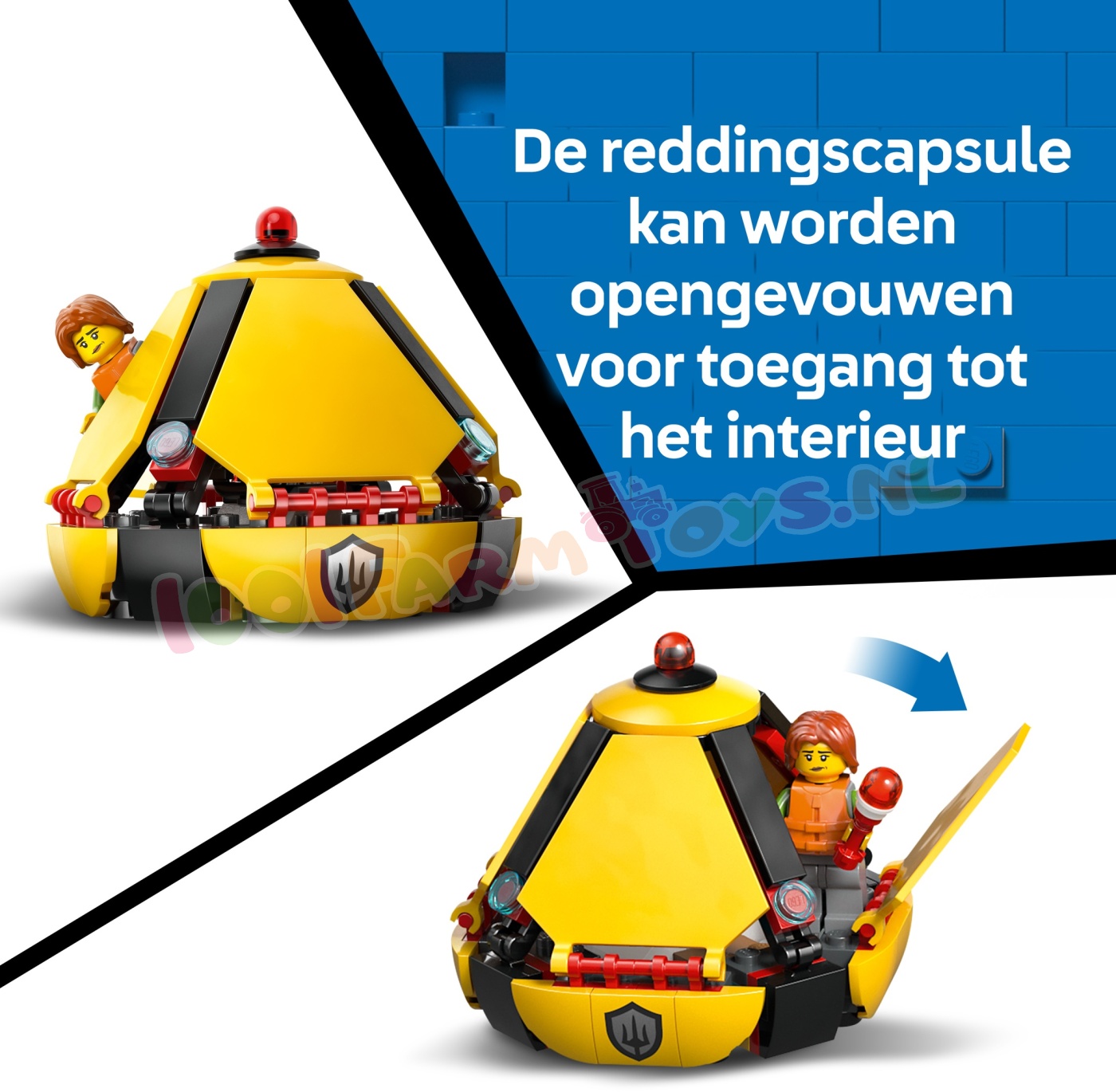 WAT ZIT ER IN DE DOOS – alles wat kinderen nodig hebben om een gedetailleerde reddingshelikopter en reddingscapsule te bouwen. plus minifiguren van een piloot. een burger en 2 mederwerkers van de kustwacht en een haaienfiguur