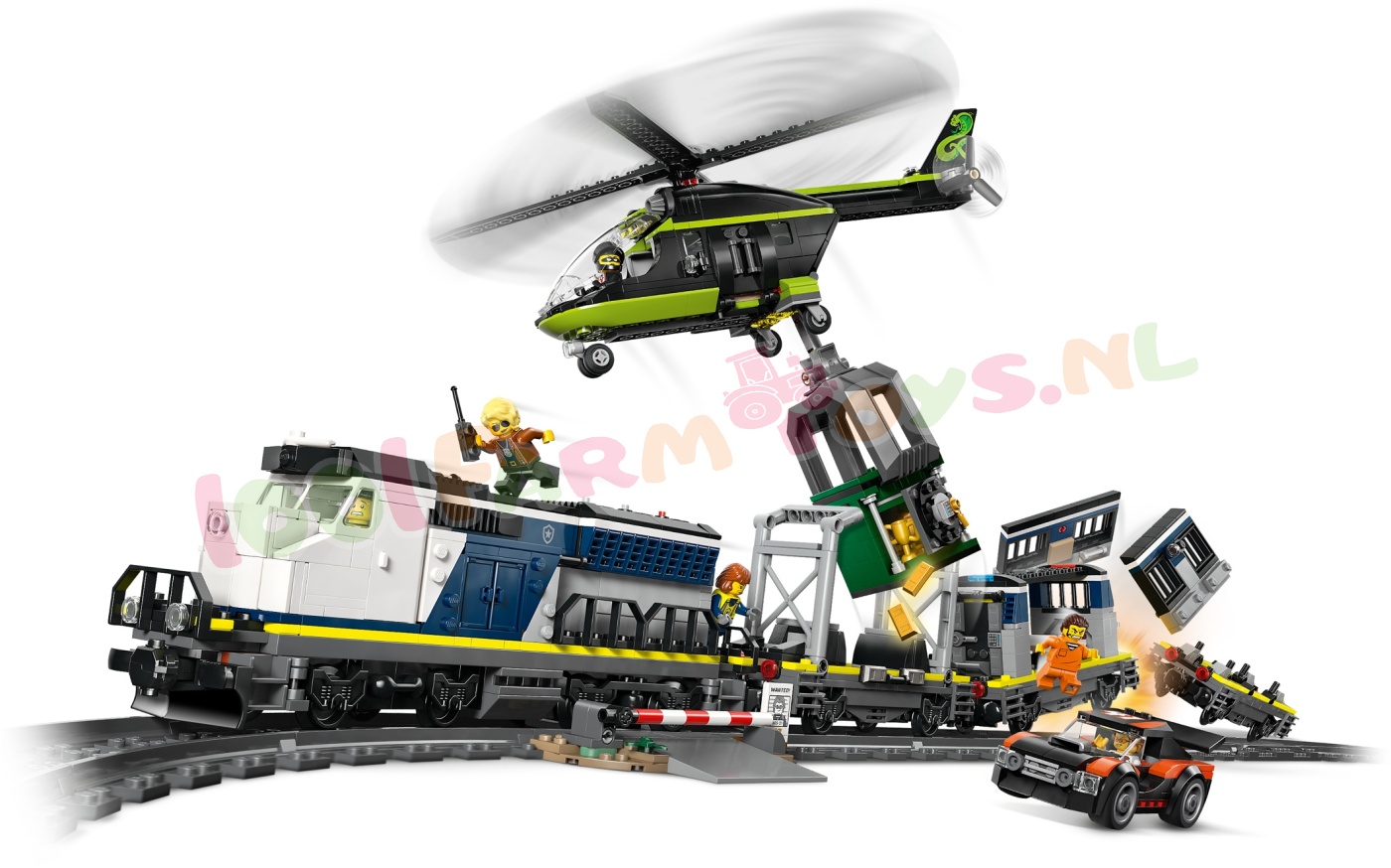 Kom aan boord en beleef non-stop actie met de LEGO® City Overval op politietrein (60508) speelgoedtreinset voor kinderen vanaf 7 jaar. Deze Powered Up elektrische treinset bevat een werkende locomotief en 3 platte wagons met daarop een gevangeniscel. een bankkluis en een rallyauto. De set bevat ook een ovaal treinspoor met een spoorwegovergang en een stuk rails om treinen terug op het spoor te zetten. Voeg de helikopter met werkende grijpklauw en de minifiguren van een detective. politieagent. treinmachinist en 3 boeven toe voor urenlange fantasierijke verhalen. Deze speelgoedtreinset is een geweldige verrassing of verjaardagscadeau voor jongens. meisjes en kinderen van 7 jaar en ouder die dol zijn op modeltreinen en LEGO bouwsets. Combineer met andere sets uit het LEGO City assortiment (apart verkrijgbaar) voor nog meer spannende avonturen. Kinderen kunnen deze LEGO City Overval op politietrein set intuïtief bouwen met de LEGO Builder app. waar ze kunnen inzoomen en draaien met 3D-instructies en hun voortgang kunnen bijhouden. De set bevat 1313 onderdelen.