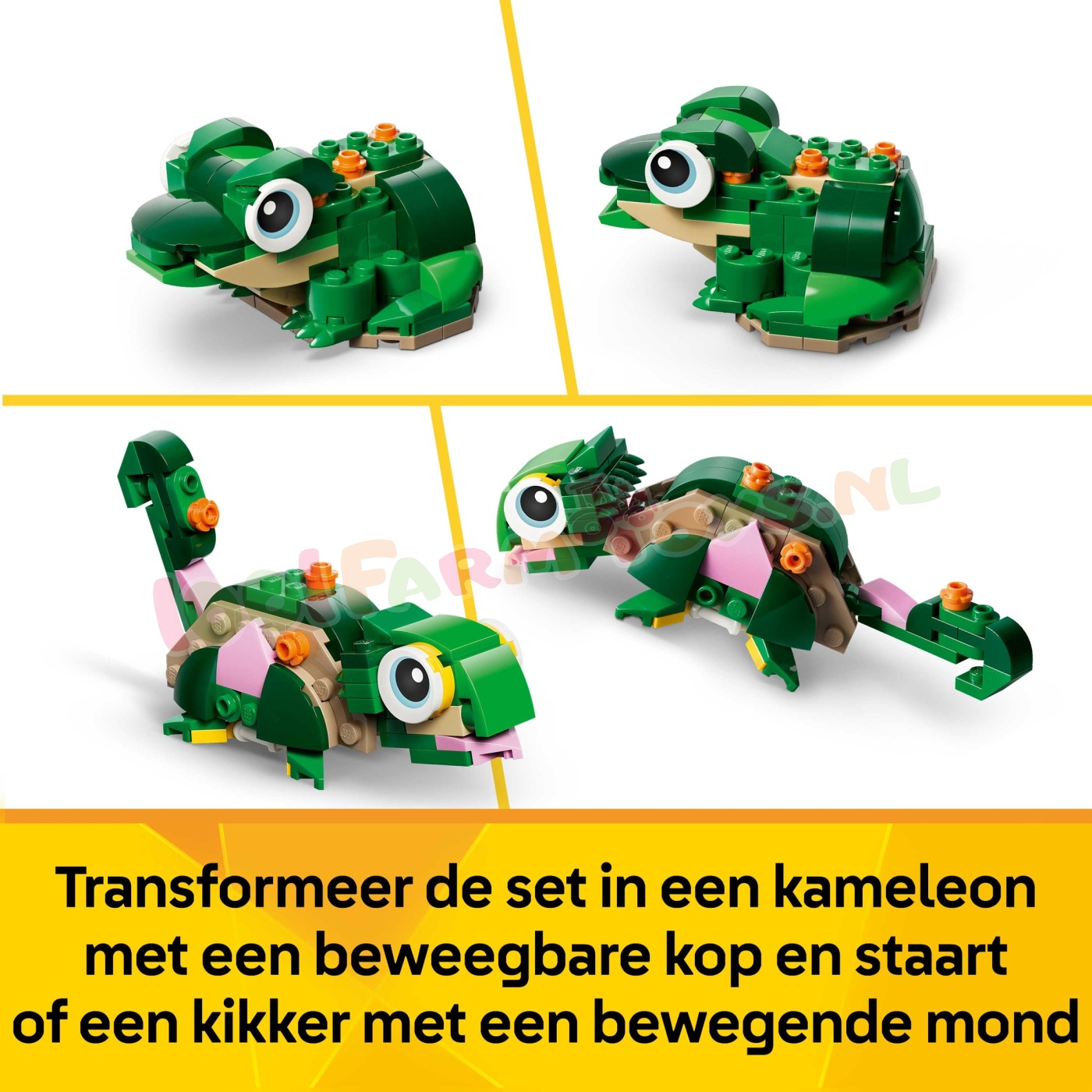 EINDELOOS DOEN ALSOF – kinderen kunnen leuke verhalen bedenken met 3 wilde dieren (de modellen kunnen niet tegelijkertijd worden gebouwd): een schildpad met een roze bloem. een kameleon of een kikker