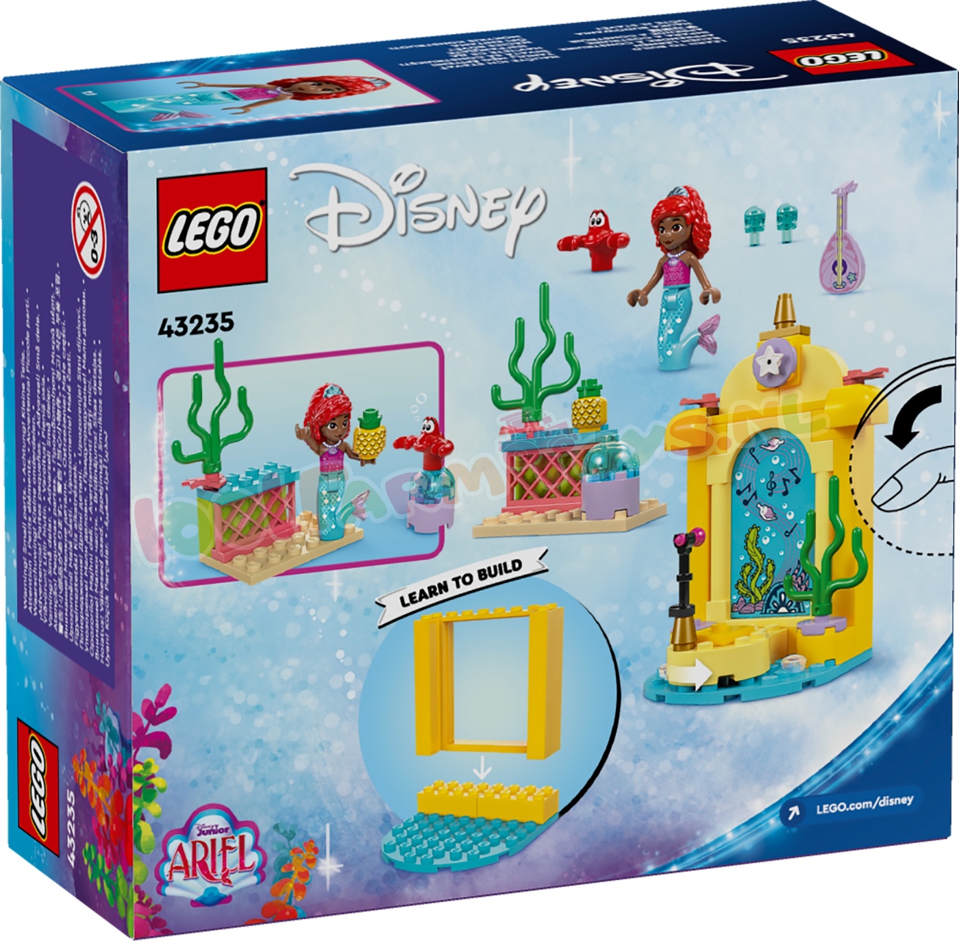 Dit bouwspeelgoed bevat een LEGO | Disney Ariël minipoppetje en een LEGO | Disney Sebastiaan dierenfiguur. Er is ook een podium met een draaiende vloer en een ruimte met een stoel en leuke verhaalideeën. waarondereen gitaar. maracas en een ananas. Een startsteen geeft kinderen een stevige basis. zodat het spelen snel kan beginnen. De intuïtieve instructies in de vorm van een kleurrijk stripverhaal zijn ideaal voor kinderen die nog niet kunnen lezen.