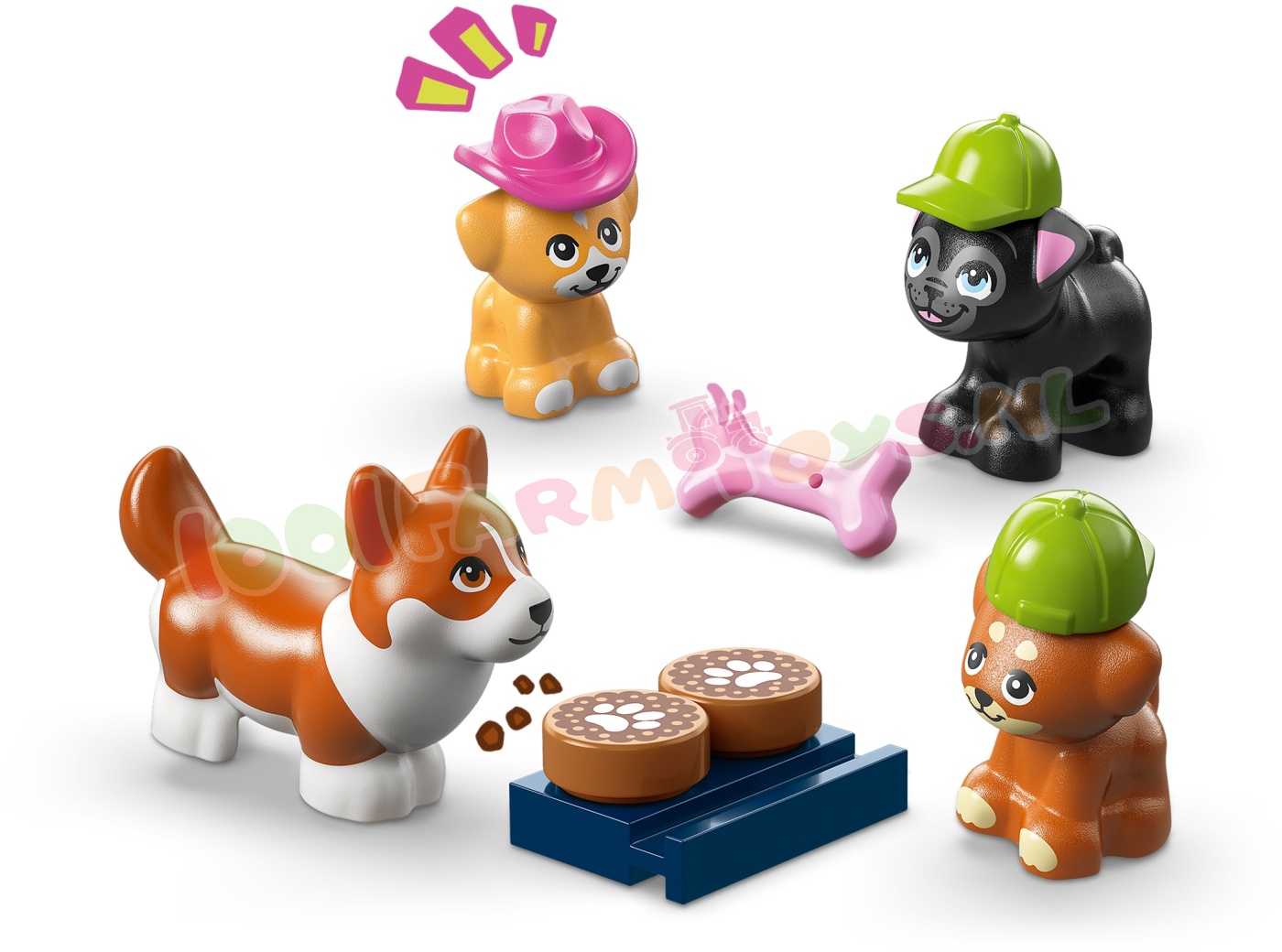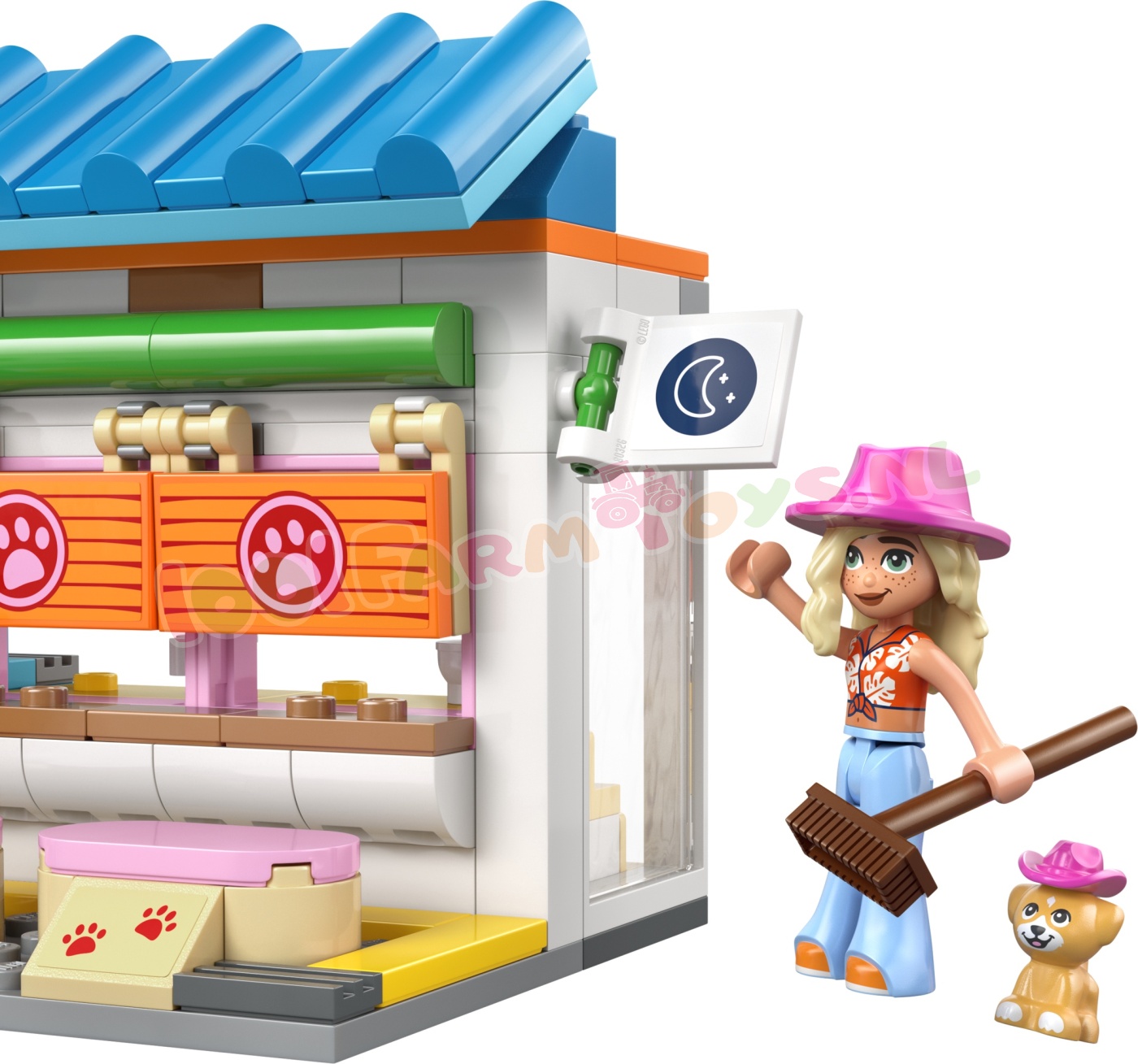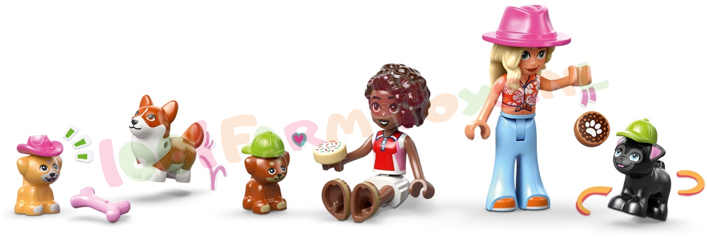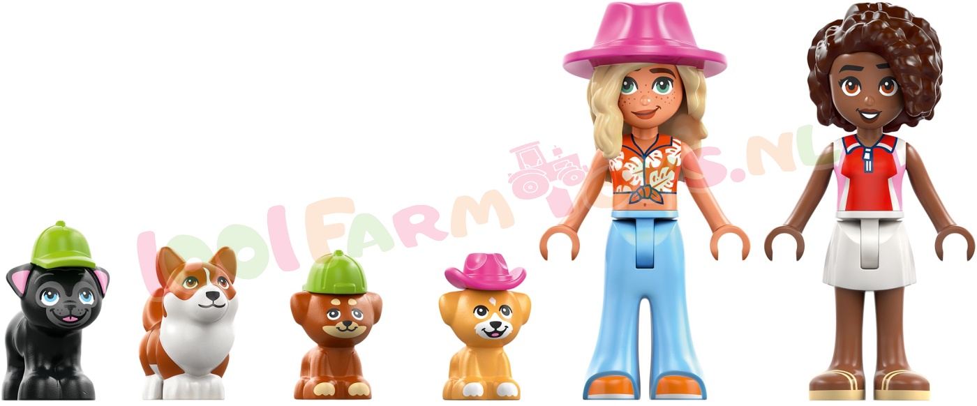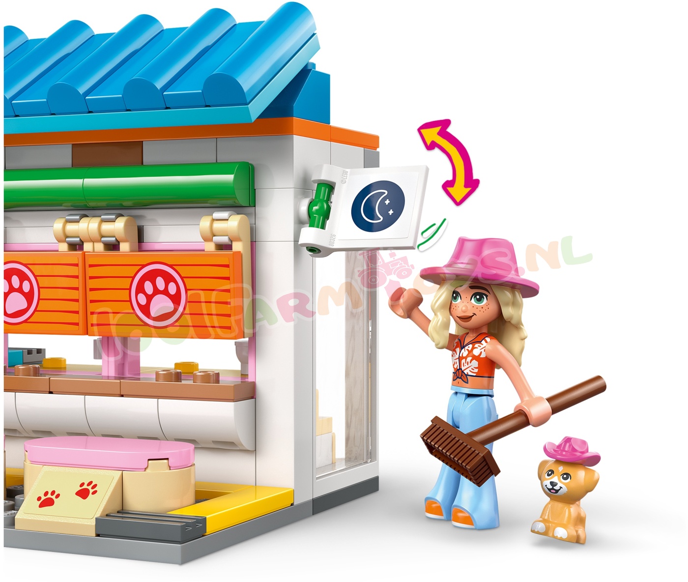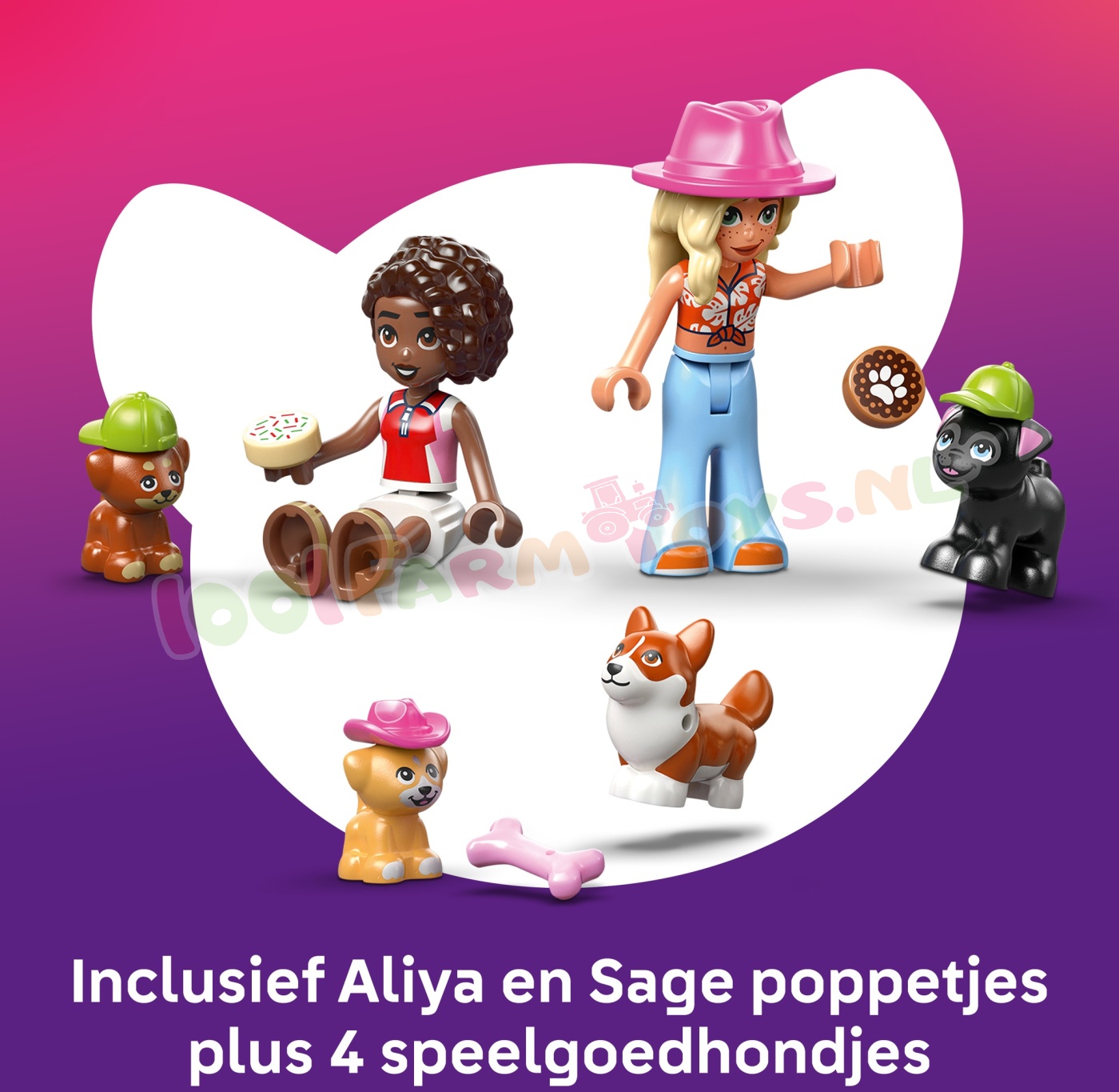 2 LEGO® FRIENDS PERSONAGES – inclusief minipoppetjes van Aliya en Sage. 4 speelgoedhondjes en allerlei leuke. diervriendelijke details. zoals een dierenluik. een helling. snacks. een leuk uithangbord en een reismand