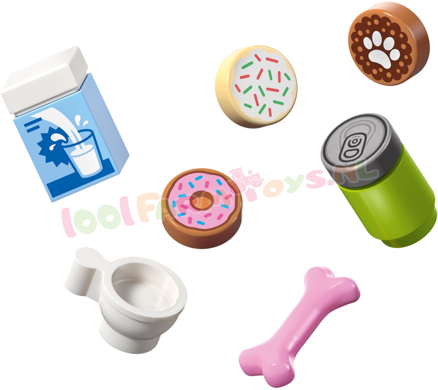 LEUKE BAKKERIJACCESSOIRES – met accessoires om de fantasie van kinderen te prikkelen. zoals een menukaart. donuts. koekjes. melk.kopjes. hondensnacks. een bot. hoedjes voor de personages en hun huisdieren en meer