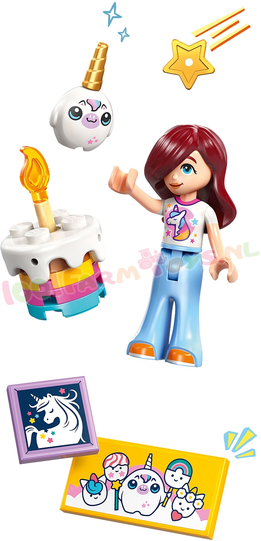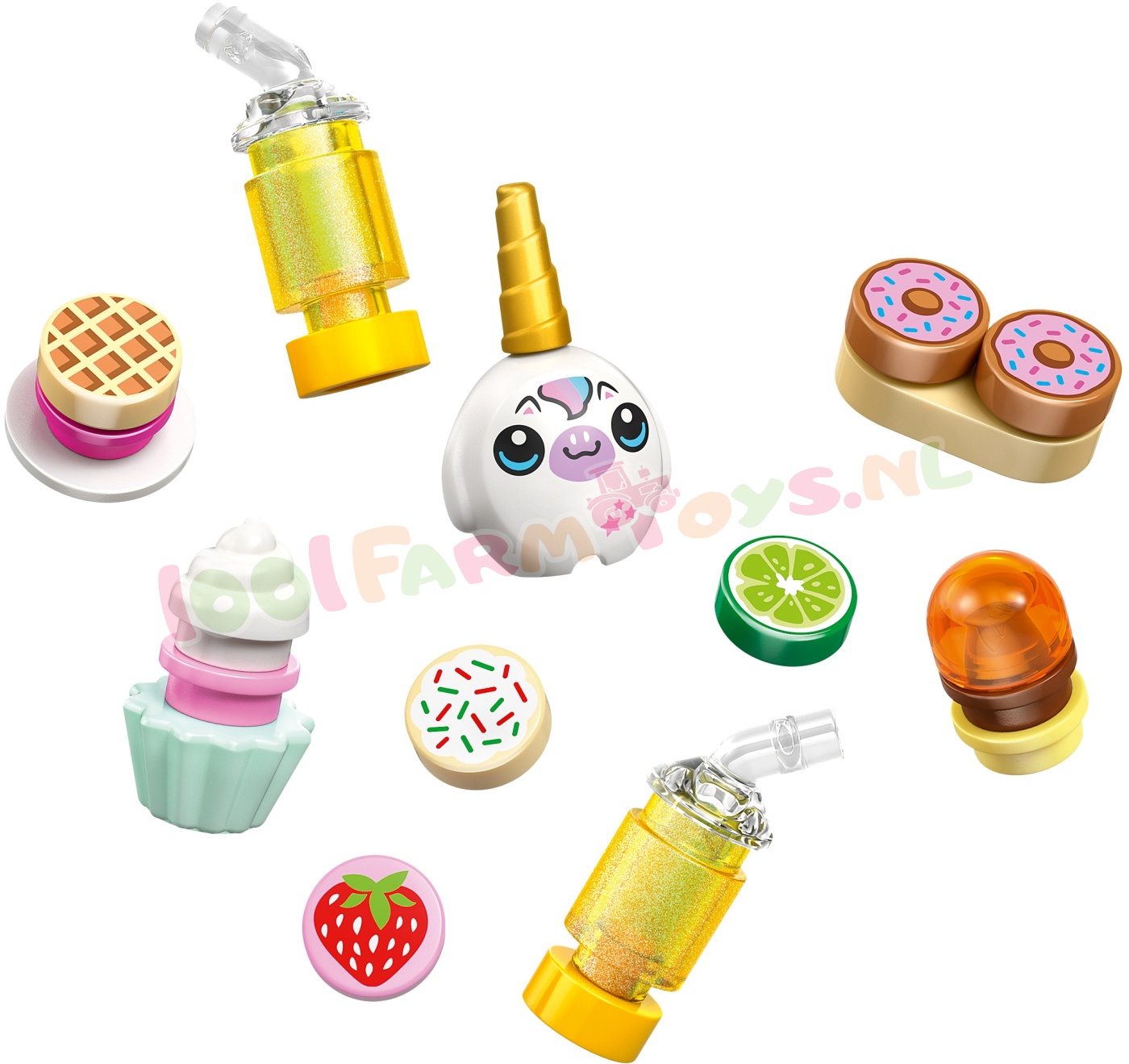 GEDETAILLEERDE ACCESSOIRES – breng het spel tot leven met donuts. wafels. koekjes. cupcakes. taarten. een sap-en milkshakebar. een zitgedeelte. een kassa en een LEGO® eenhoornknuffelaccessoire