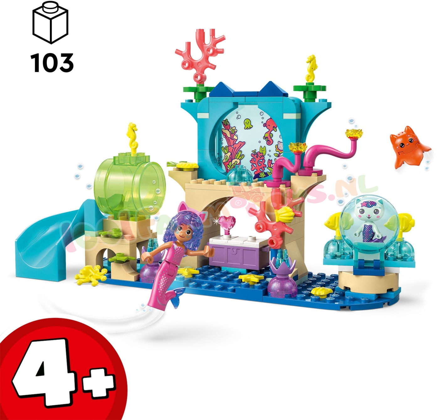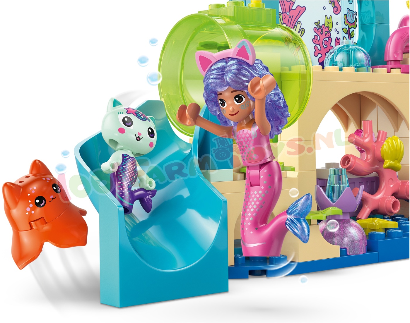 Deze LEGO® Gabby’s poppenhuis set zit boordevol functies en personages. waaronder een minipoppetje van Gabby in haar zeemeerminoutfit en figuren van Meerminkat en Kwalletje. Kinderen kunnen samen met Gabby en haar vriendjes een kleurrijke onderwateromgeving verkennen vol schelpen. planten en zeedieren. Er valt veel te ontdekken. waaronder een glijbaan. een grote bubbel waar Meerminkat in kan 'drijven' en koraal waarachter een schatkist is verborgen. De set wordt geleverd met kleurrijke instructies met afbeeldingen. een grote startsteen en aparte zakjes met 1 bouwbaar model per zakje. zodat kleine bouwers snel aan de slag kunnen gaan.