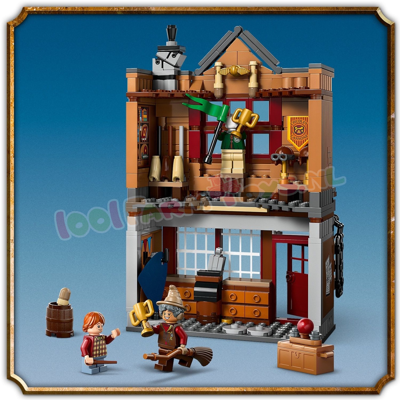 Zwik en Zwachtels Zwerkbalpaleis – de winkel heeft een zwevende bezemsteelfunctie en is gevuld met Zwerkbalspullen. waaronder een Zwadderich™ uniform. Slurk. Beuker. Gouden Snaai™ en trofeeën