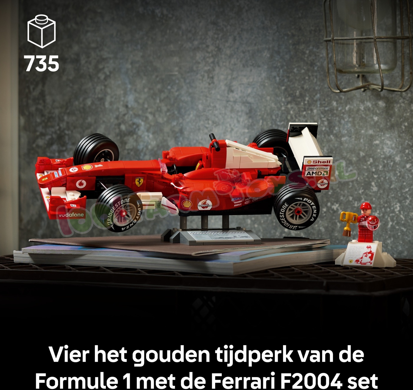 Breng een eerbetoon aan gouden tijden in de Formule 1 met de LEGO® Icons Ferrari F2004 en Michael Schumacher (11375) modelset. Bouw een replica op schaal van de legendarische raceauto waarmee Michael Schumacher het seizoen 2004 domineerde. Het Ferrari model heeft werkende besturing. banden met groeven en een gedetailleerde V10-motor. plus een displaystandaard met informatie en statistieken over de auto. De minifiguur van Michael Schumacher wordt geleverd met een helm. een trofee en een displaystandaard in de vorm van een podium met een afbeelding en een citaat van de zevenvoudig wereldkampioen. Dit hoogwaardige displaymodel is een prachtige blikvanger en een geweldig verjaardags- of kerstcadeau voor racefans en verzamelaars van F1 merchandise. Ontdek het dynamische assortiment LEGO F1 bouwsets (apart verkrijgbaar) voor volwassenen. kinderen en gezinnen. Bouw slimmer met de LEGO Builder app – zoom in. draai het model in 3D. hou je voortgang bij en volg stapsgewijze digitale instructies. De set bevat 735 onderdelen. F1 BOUWSET VOOR VOLWASSEN VERZAMELAARS – breng een eerbetoon aan een legende van het racecircuit met de LEGO® Icons Ferrari F2004 en Michael Schumacher (11375) bouwset voor volwassenen en verzamelaars WAT ZIT ER IN DE DOOS – alles wat je nodig hebt om een gedetailleerde replica van de Ferrari F2004 F1 raceauto te bouwen. plus een minifiguur van Michael Schumacher. een displaystandaard. een displaypodium. een helm en een trofee KENMERKEN EN FUNCTIES – het LEGO® Ferrari F1 model heeft werkende besturing. een gedetailleerde cockpit. een V10-motor en banden met groeven en Bridgestone Potenza opdruk HOOGWAARDIGE DISPLAYDETAILS – inclusief een standaard voor de Formule 1 raceauto met voertuigstatistieken en een displaypodium voor de minifiguur van de coureur met een foto en een citaat van Michael Schumacher CADEAU VOOR FANS VAN FORMULE 1 RACES – vier een verjaardag of speciale gelegenheid met deze LEGO® F1 autobouwset voor volwassen verzamelaars 3D-BOUWINSTRUCTIES – haal alles uit deze Ferrari F1 bouwset met de LEGO® Builder app. waar je het model in 3D kunt bekijken. je voortgang kunt bijhouden en andere bouwsets kunt ontdekken MEER RAZENDSNELLE F1 ACTIE – kijk ook eens naar de andere LEGO® Formule 1 sets (apart verkrijgbaar) om met het hele gezin te bouwen. te racen en te bewonderen AFMETINGEN – de F1 racewagen in deze 735-delige LEGO® Icons Ferrari F2004 bouwset is ca. 7 cm hoog. 32 cm lang en 13 cm breed
