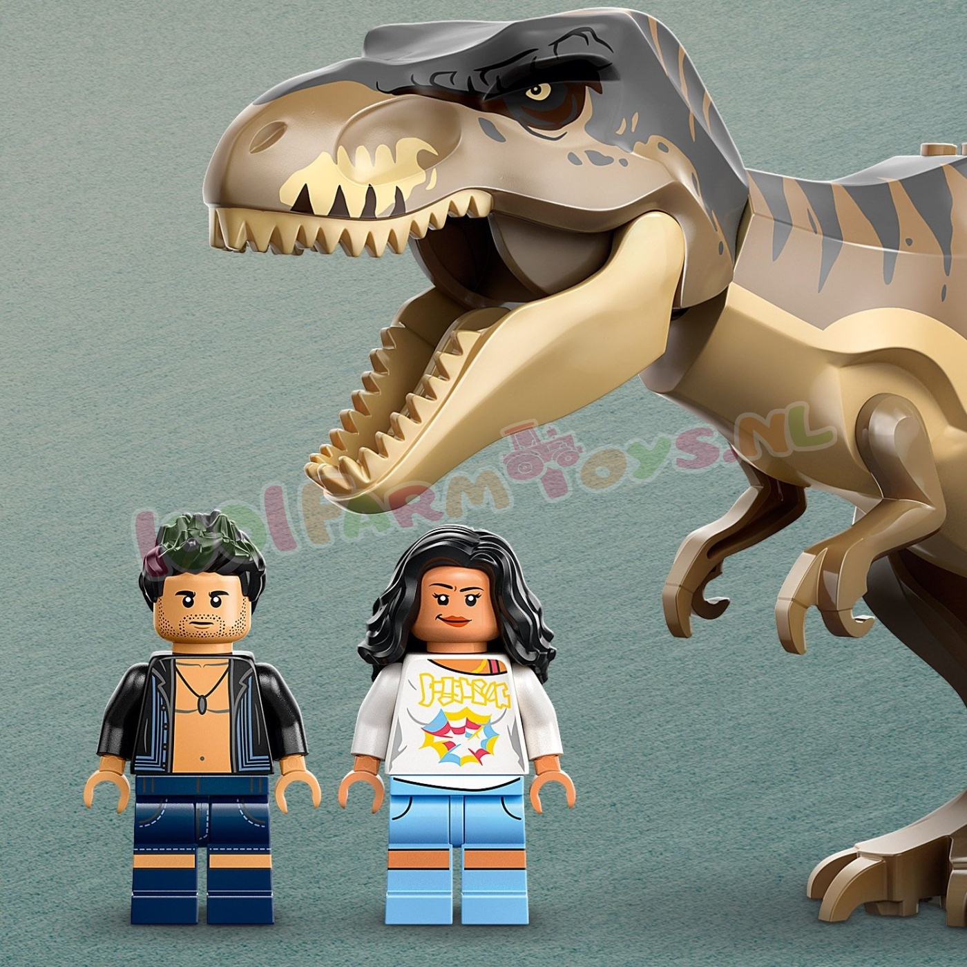 Bouwspeelgoed met dinosaurus – de set bestaat uit een voorgevormde LEGO® Jurassic World T. rex figuur met beweegbare poten. staart. kop en kaak. plus minifiguren van Teresa Delgado en Xavier Dobbs voor leuke avonturen