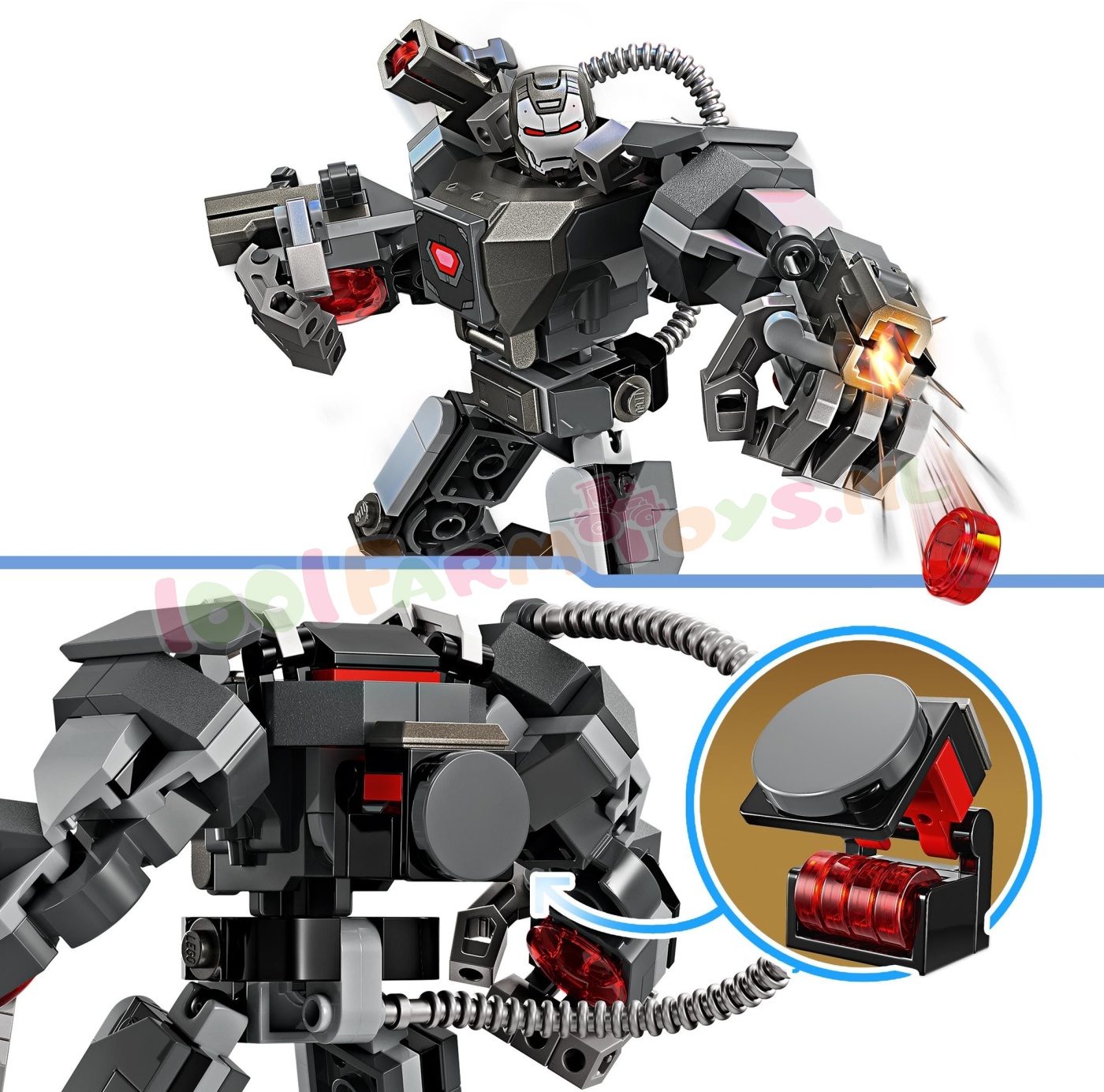 De borstkas van de mecha kan open en biedt ruimte aan de piloot War Machine. Er zijn 3 noppenschieters (1 op de schouder van de mecha en 2 op zijn armen) en een opbergdoos op zijn rug voor extra munitie. De verstelbare Marvel figuur heeft beweegbare armen. benen en handen. zodat fans van War Machine en mecha kunnen genieten van eindeloos actiespel. Kinderen kunnen de speelmogelijkheden nog verder uitbreiden door dit bouwspeelgoed te combineren met andere LEGO Marvel mecha uit het assortiment (apart verkrijgbaar). Voor nog meer digitaal plezier kunnen bouwers inzoomen. modellen draaien in 3D en hun voortgang bijhouden met behulp van de leuke. intuïtieve LEGO Builder app.