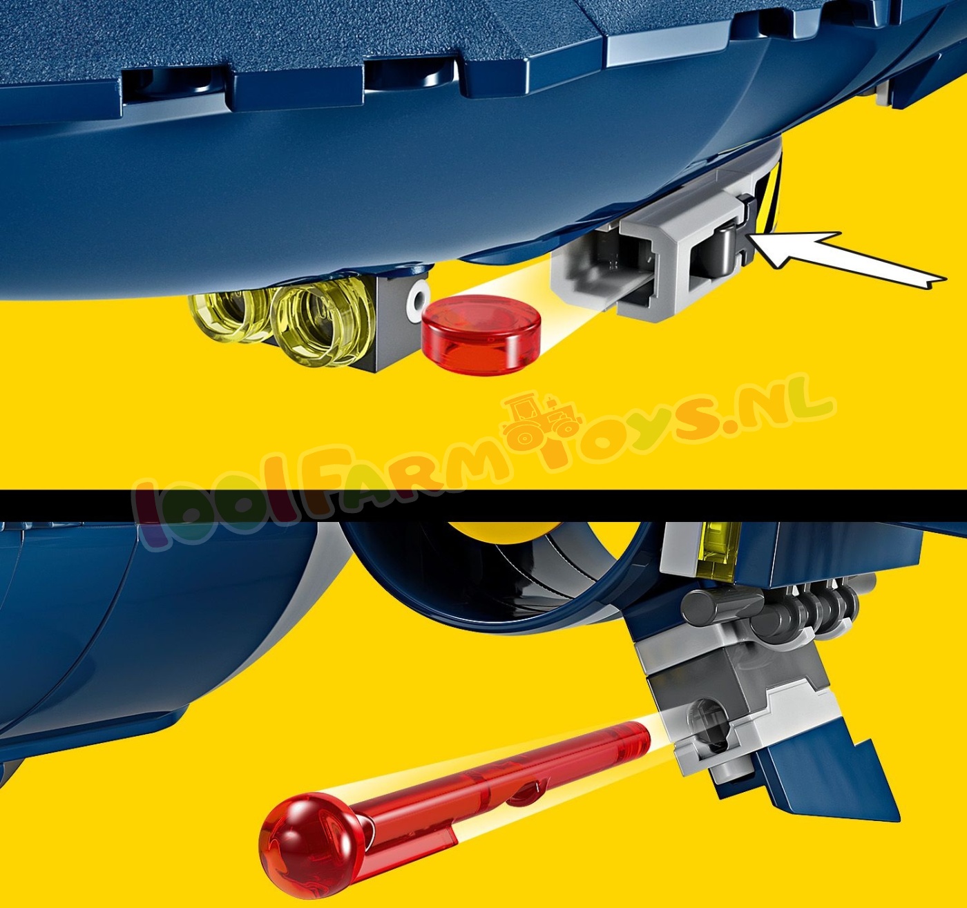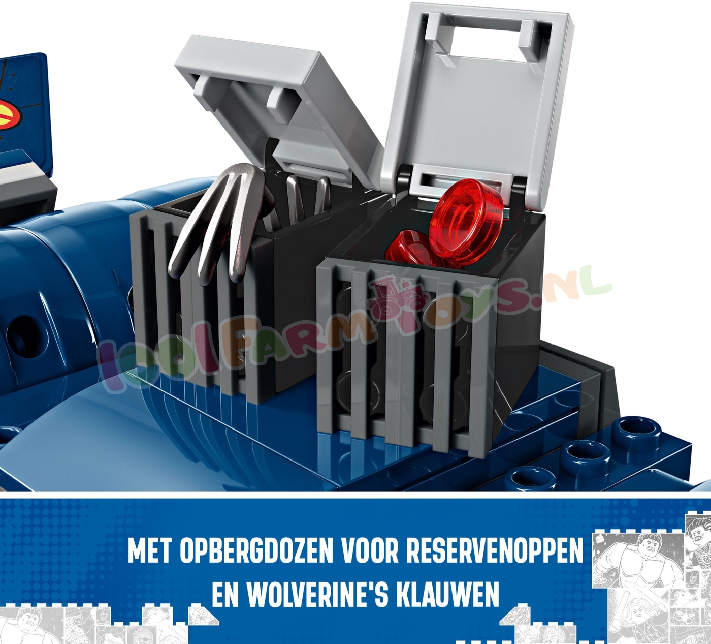 Bouwbaar X-Men speelgoedvliegtuig – de X-Jet heeft 2 noppenschieters aan beide kanten. 2 schieters met veermechanisme en 2 afneembare dozen waarin kinderen noppen en Wolverine's klauwen kunnen opbergen