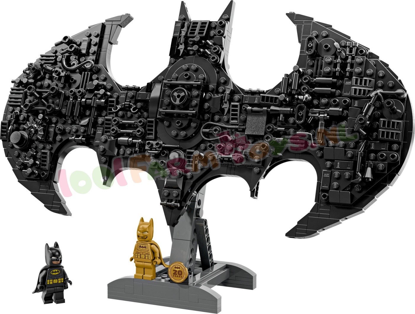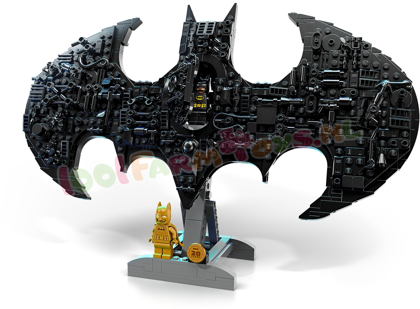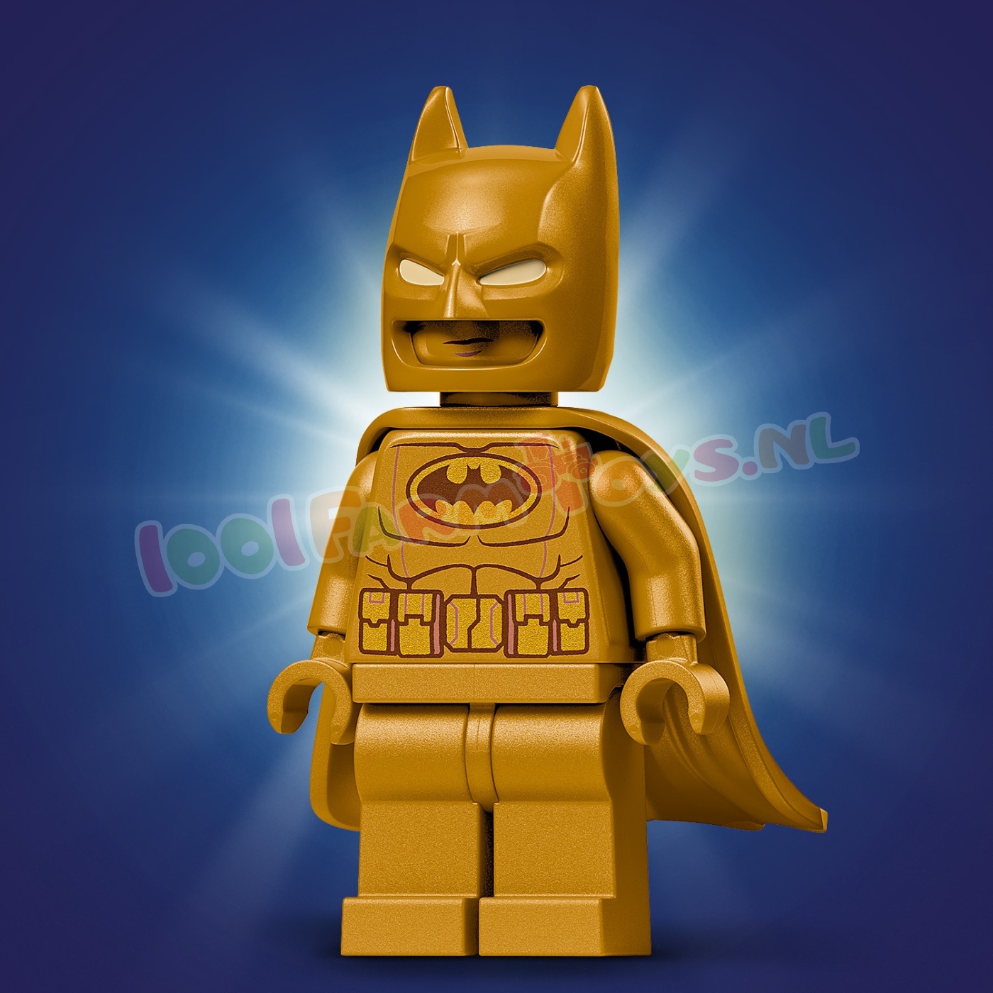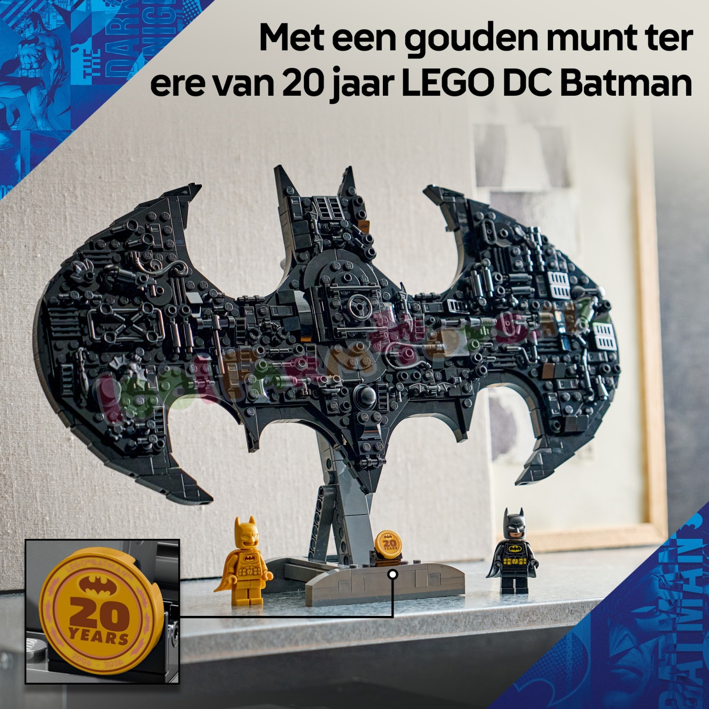 2 BATMAN™ MINIFIGUREN – inclusief een goudkleurige Batman minifiguur . een goudkleurige jubileummunt en een klassieke Batman minifiguur die in een luikje in het midden van het model past