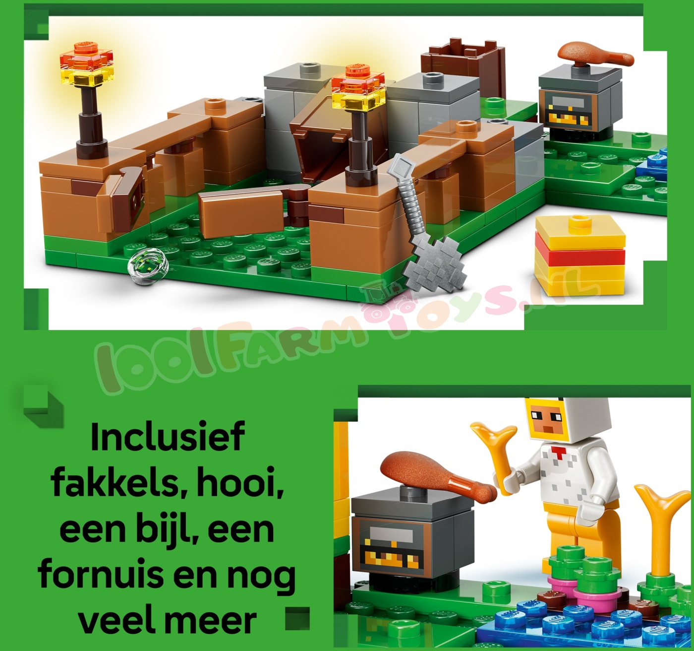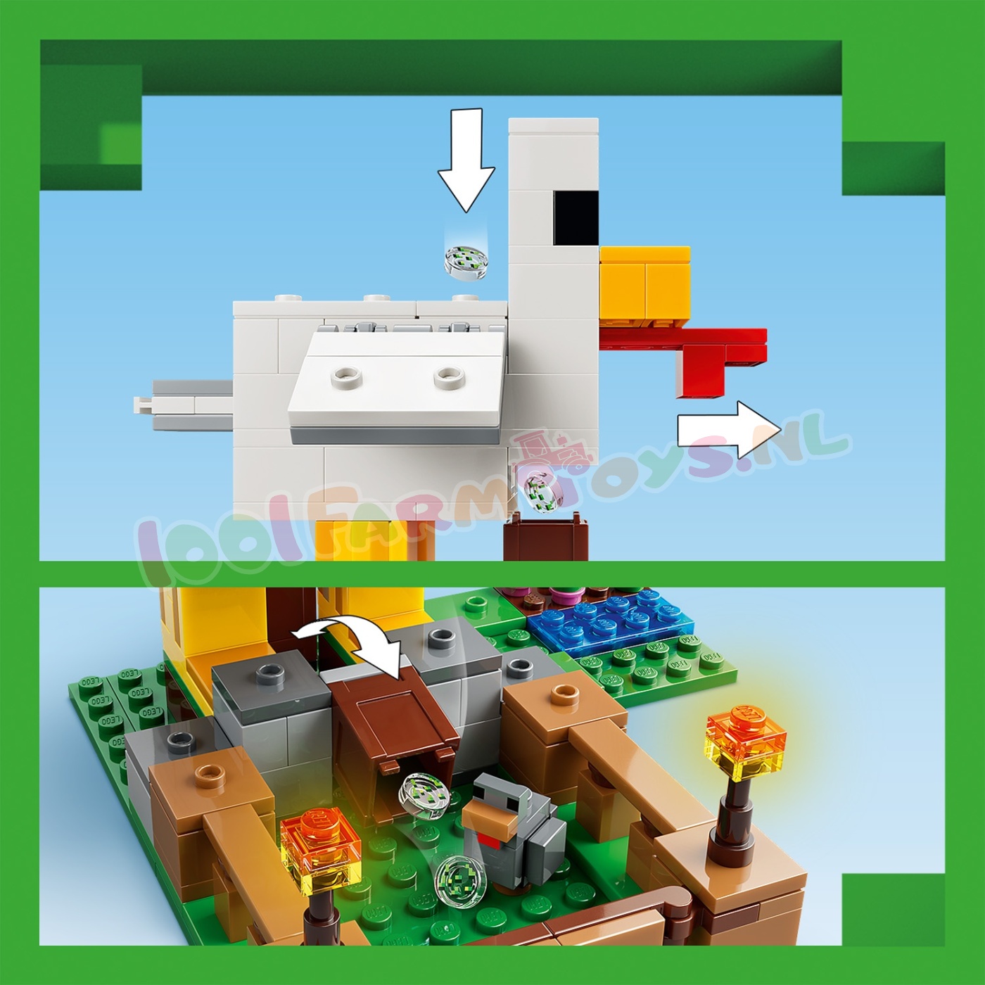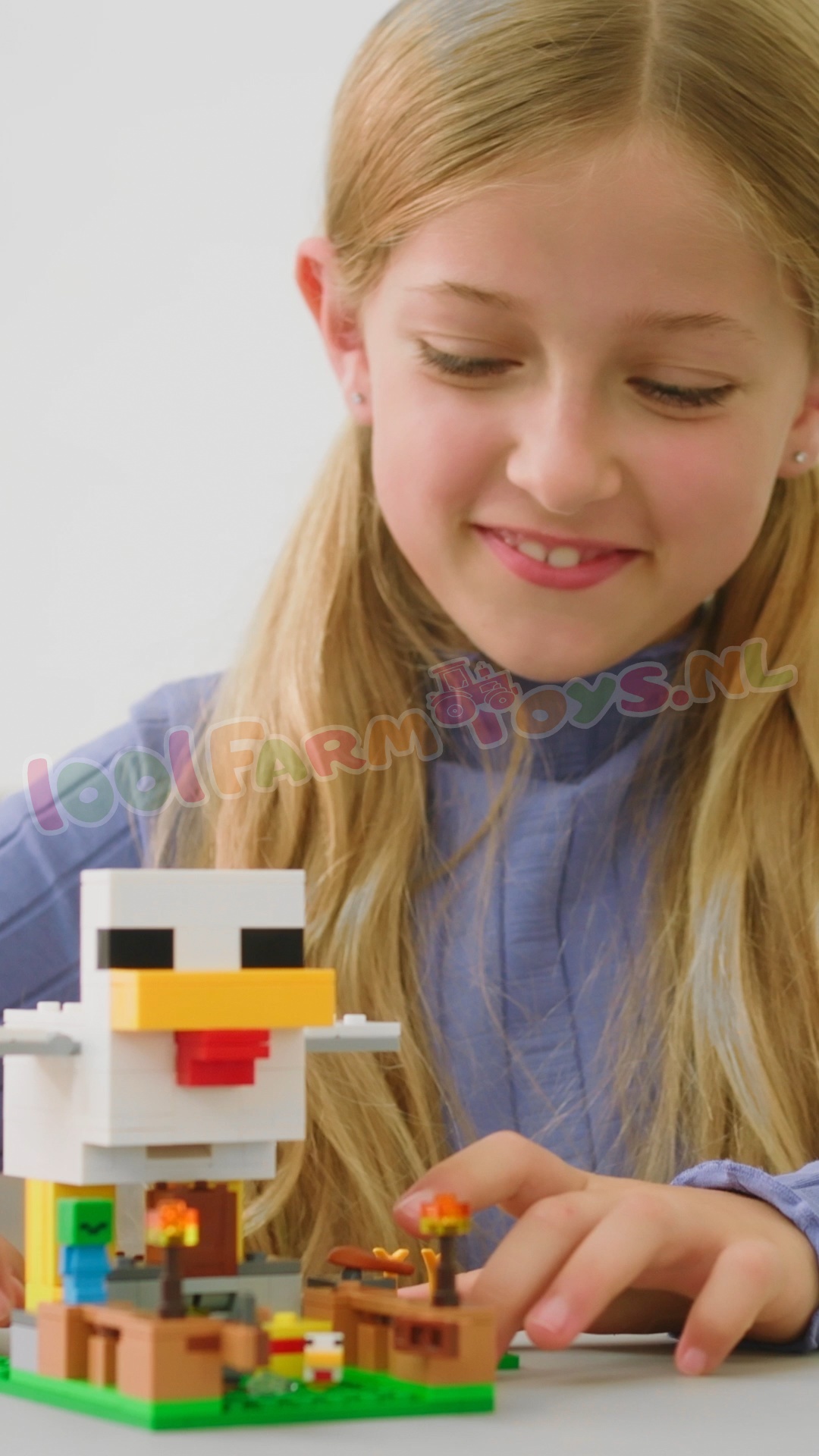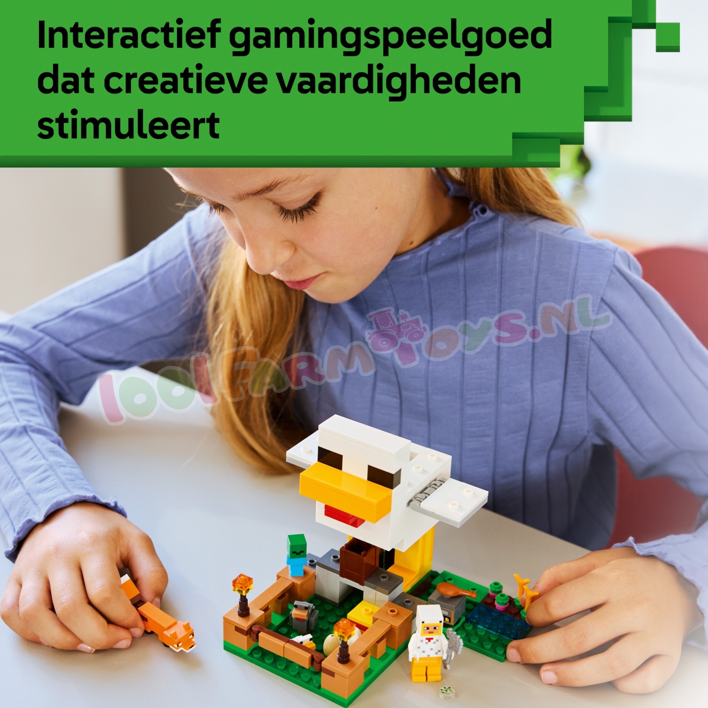 Zorg voor kippen en verbouw gewassen met het LEGO® Minecraft® Kippenboerderij (21585) speelgoed voor gamers. meisjes en jongens vanaf 7 jaar. Deze bouwset voor kinderen daagt spelers uit om voor een koude kip en een babykip te zorgen met een minifiguur van een kippenfan. terwijl ze te maken krijgen met een vos (die graag koude kip eet) en een babyzombie (die graag op de kippen rijdt). Het kippenhok heeft de vorm van een grote kip met beweegbare vleugels en een ren aan de voorkant met een hek dat open kan. De reusachtige kip legt eieren aan de achterkant en er vallen zaden uit zijn snavel in een bak die naar voren kan worden gekanteld als het tijd is om de kippen te voeren. Leuke accessoires zijn onder andere fakkels. hooi. een rookoven. 2 eieren. 2 zaden. een kippenpoot. een veer en een bijl. Dit is een geweldige cadeautip voor Minecraft spelers. LEGO bouwers en fans van gamingdecoratie. De set wordt geleverd met de LEGO Builder app. waarmee kinderen kunnen inzoomen. hun model in 3D kunnen draaien en hun voortgang kunnen bijhouden met eenvoudig te volgen digitale instructies. De set bevat 233 onderdelen.