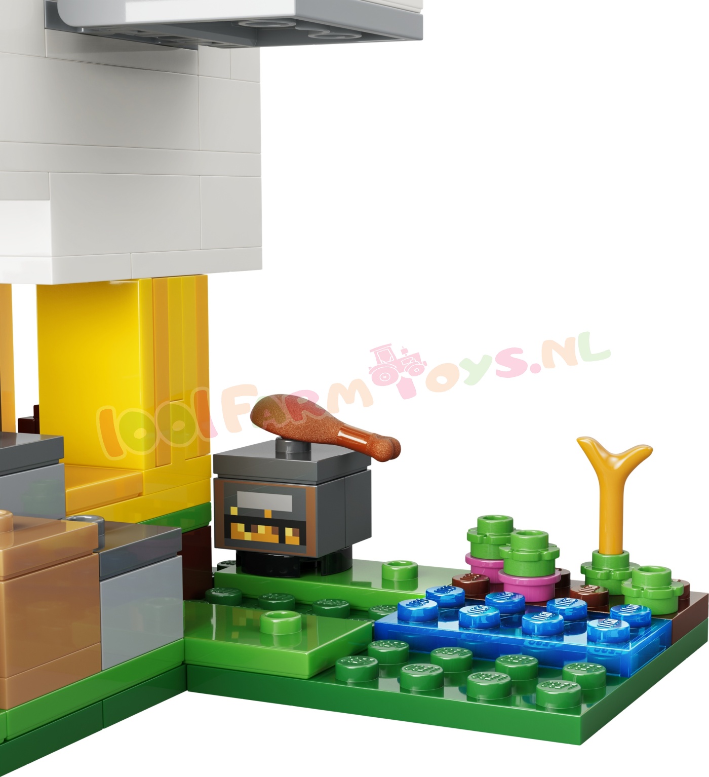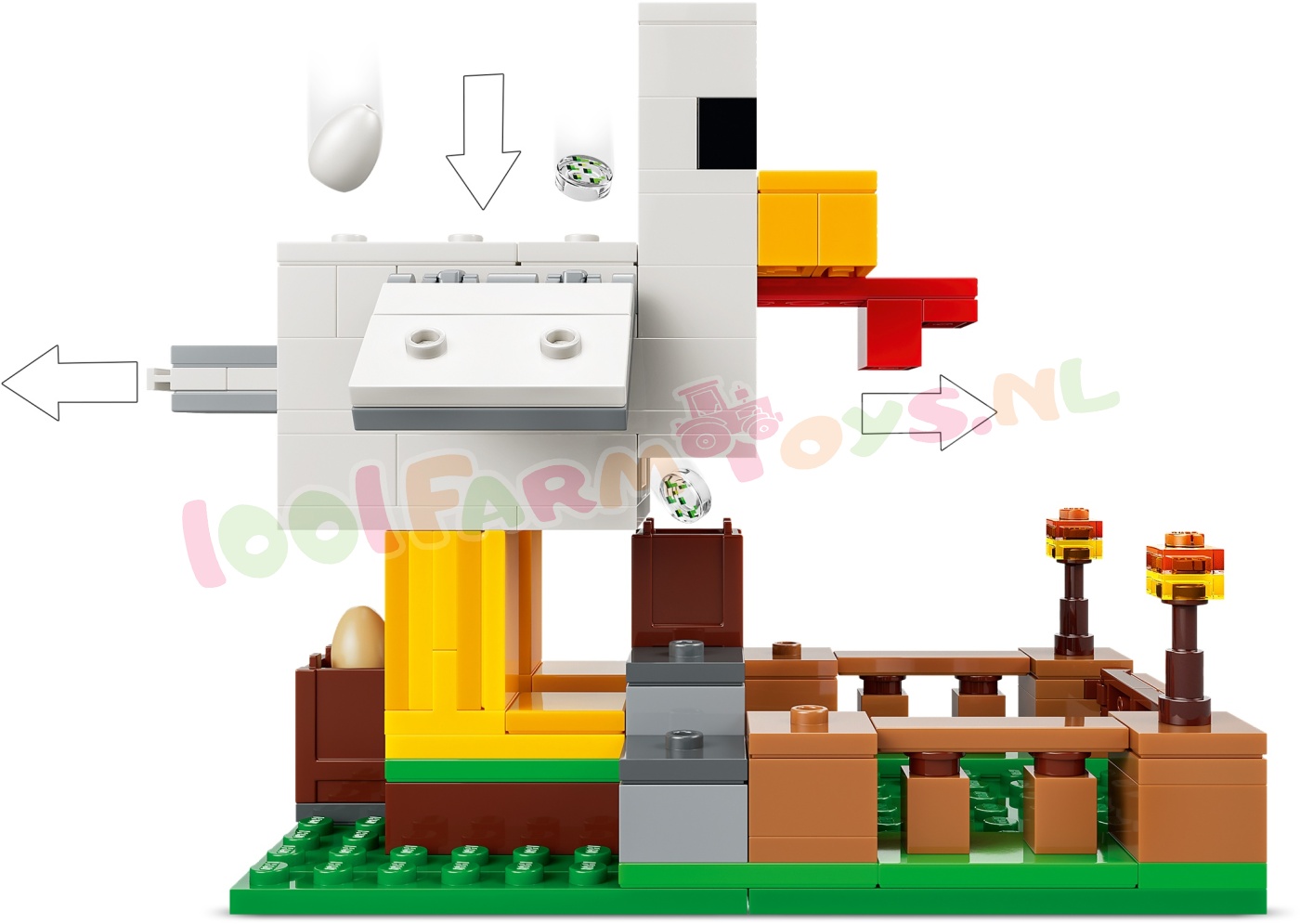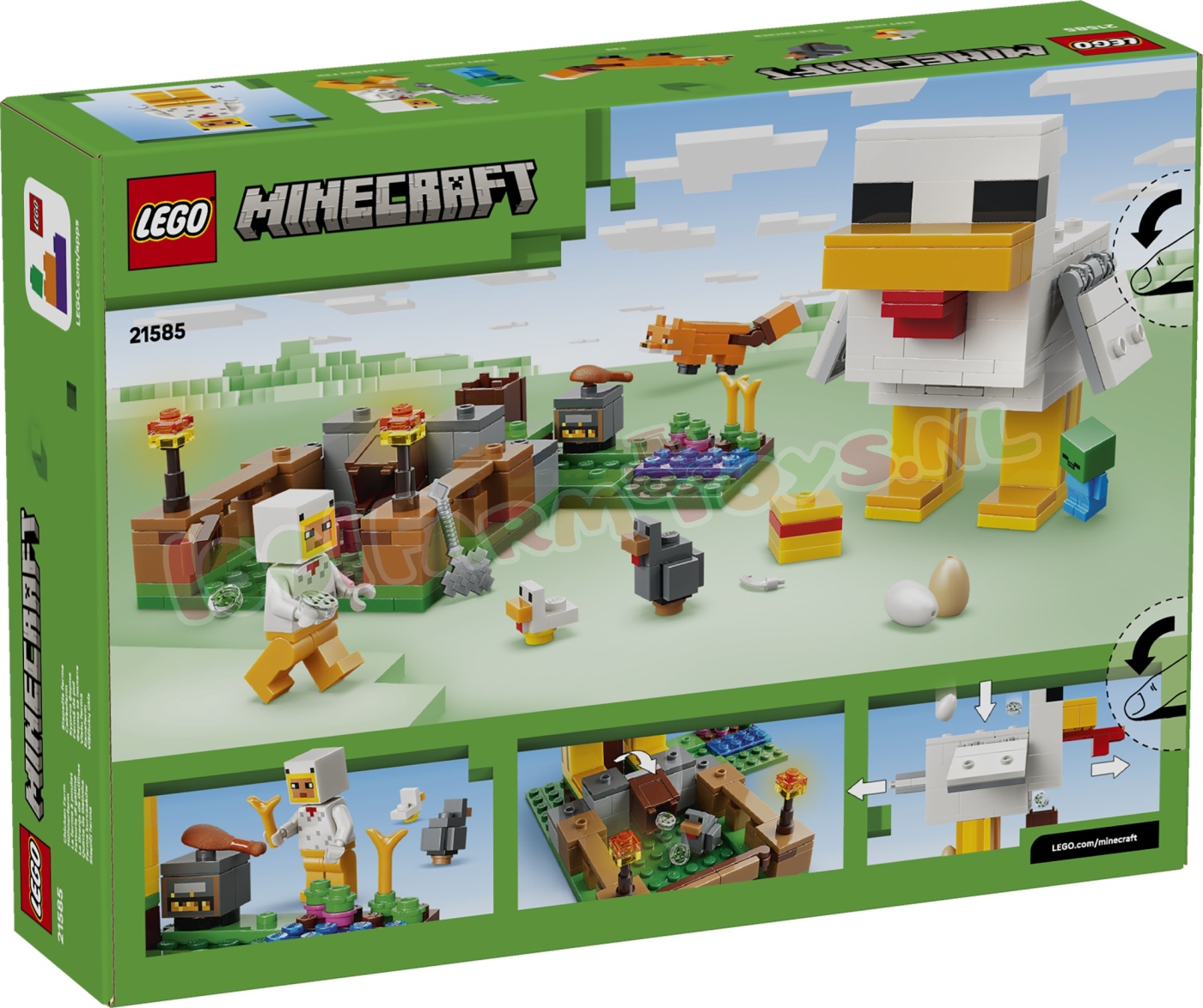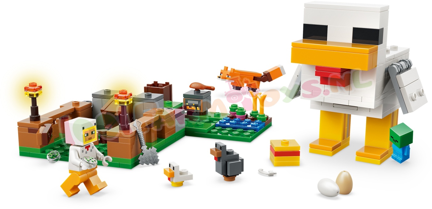Zorg voor kippen en verbouw gewassen met het LEGO® Minecraft® Kippenboerderij (21585) speelgoed voor gamers. meisjes en jongens vanaf 7 jaar. Deze bouwset voor kinderen daagt spelers uit om voor een koude kip en een babykip te zorgen met een minifiguur van een kippenfan. terwijl ze te maken krijgen met een vos (die graag koude kip eet) en een babyzombie (die graag op de kippen rijdt). Het kippenhok heeft de vorm van een grote kip met beweegbare vleugels en een ren aan de voorkant met een hek dat open kan. De reusachtige kip legt eieren aan de achterkant en er vallen zaden uit zijn snavel in een bak die naar voren kan worden gekanteld als het tijd is om de kippen te voeren. Leuke accessoires zijn onder andere fakkels. hooi. een rookoven. 2 eieren. 2 zaden. een kippenpoot. een veer en een bijl. Dit is een geweldige cadeautip voor Minecraft spelers. LEGO bouwers en fans van gamingdecoratie. De set wordt geleverd met de LEGO Builder app. waarmee kinderen kunnen inzoomen. hun model in 3D kunnen draaien en hun voortgang kunnen bijhouden met eenvoudig te volgen digitale instructies. De set bevat 233 onderdelen.