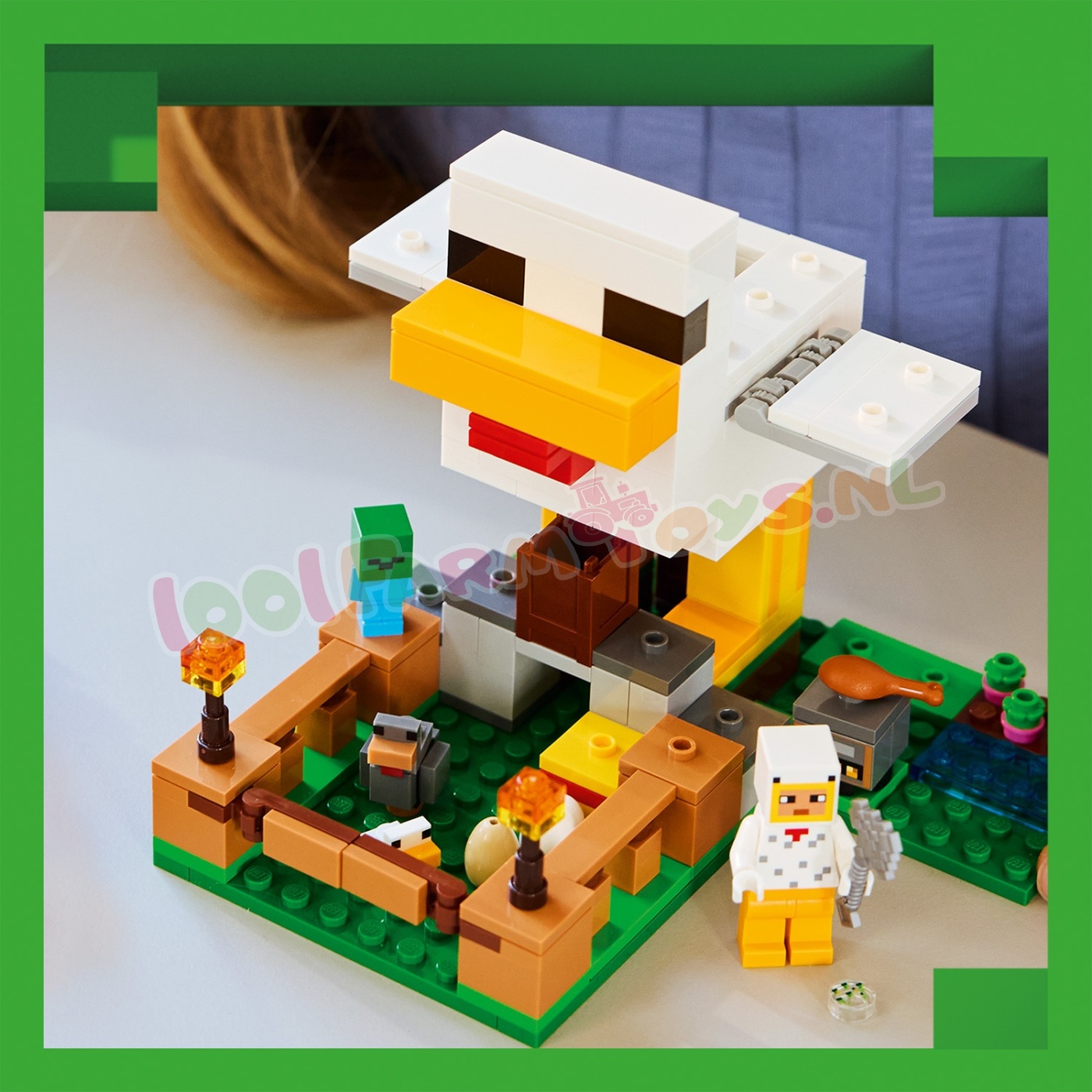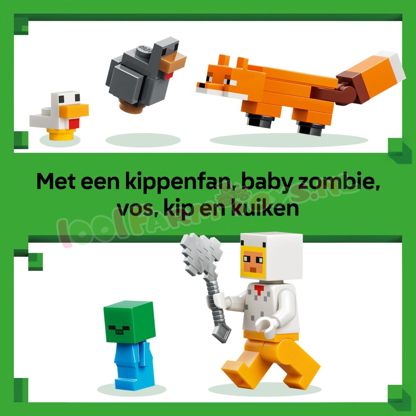 GAMINGSET – doe alsof je voor kippen zorgt met behulp van de leuke functies in het hok terwijl je een babyzombie afweert die een ritje op een kip probeert te maken in deze LEGO® Minecraft® bouwset