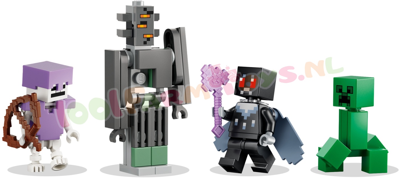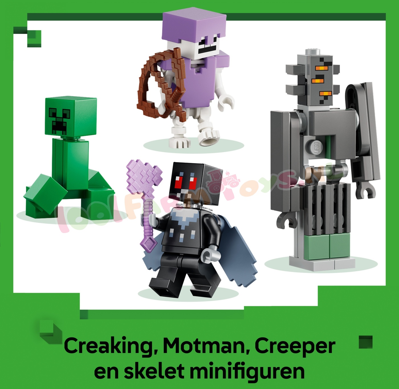 4 LEGO® MINECRAFT® PERSONAGES – een bouwbare Creaking neemt het op tegen deheldhaftige. gevleugelde Motman terwijl een Creeper™ en een skelet ronddwalen in het bleke tuin-bioom