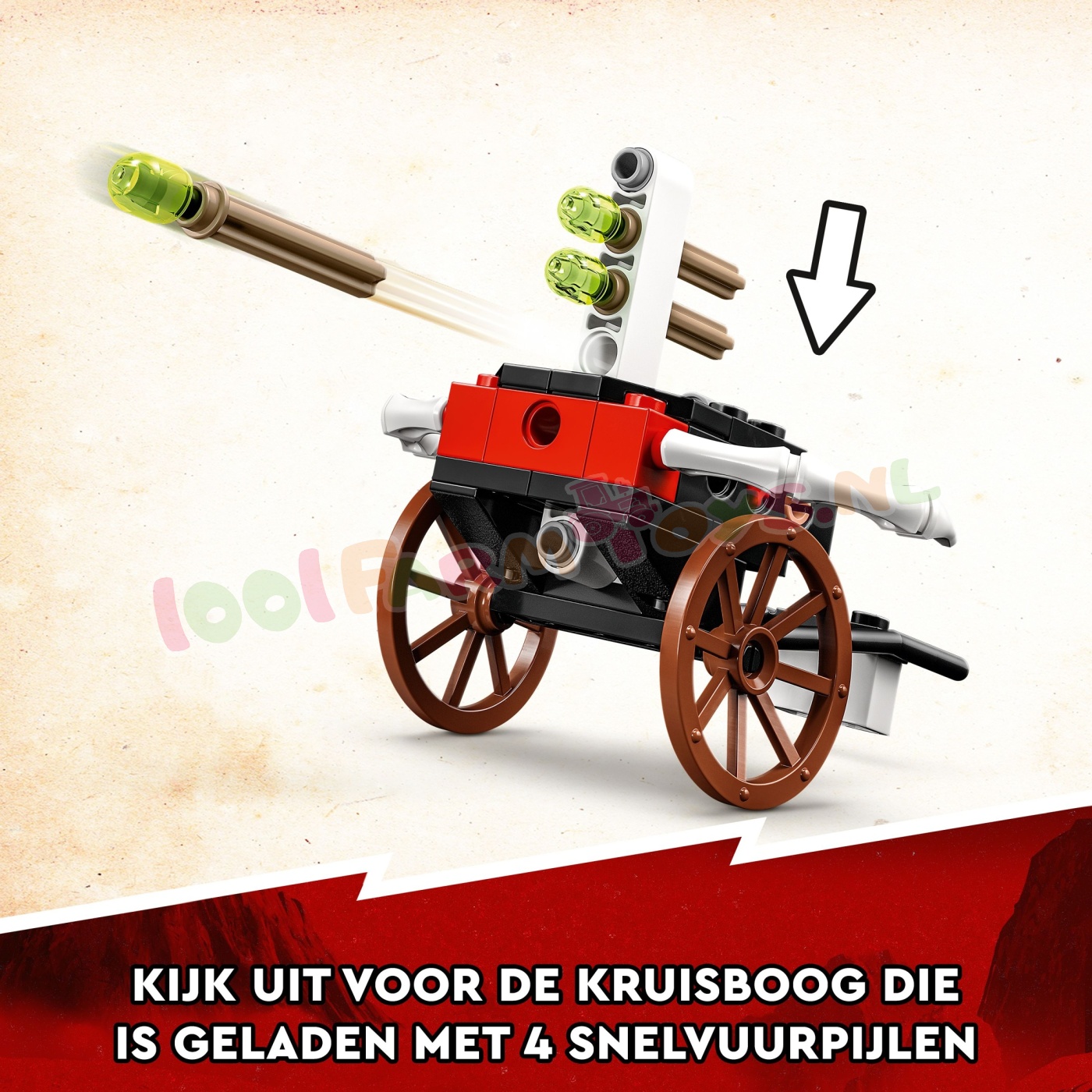 Deze coole speelgoedset voor kinderen bevat 5 minifiguren: ninjastrijders Jay en Nya. beiden bewapend met een zwaard. en groene bottenstrijders Bottenkoning. Bottenridder en Bottenjager met hun eigen groene bottenstrijderwapens. plus een dubbele kruisboog op een kar die is geladen met 4 snelvuurpijlen. Er is ook een Pixal Bot.