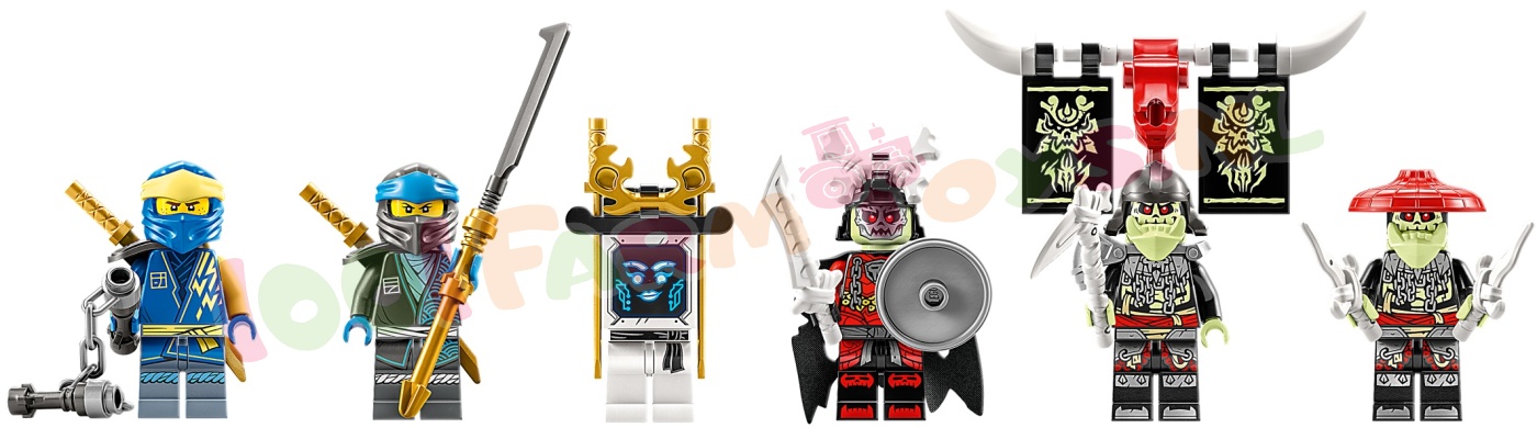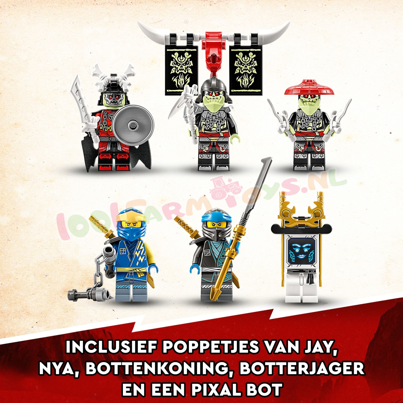 5 minifiguren – deze ninjaspeelset bevat ninjastrijders Jay en Nya waarmee kinderen confrontaties kunnen naspelen tegen Bottenkoning. Bottenridder en Bottenjager. Er is ook een Pixal Bot