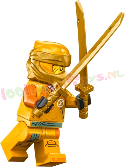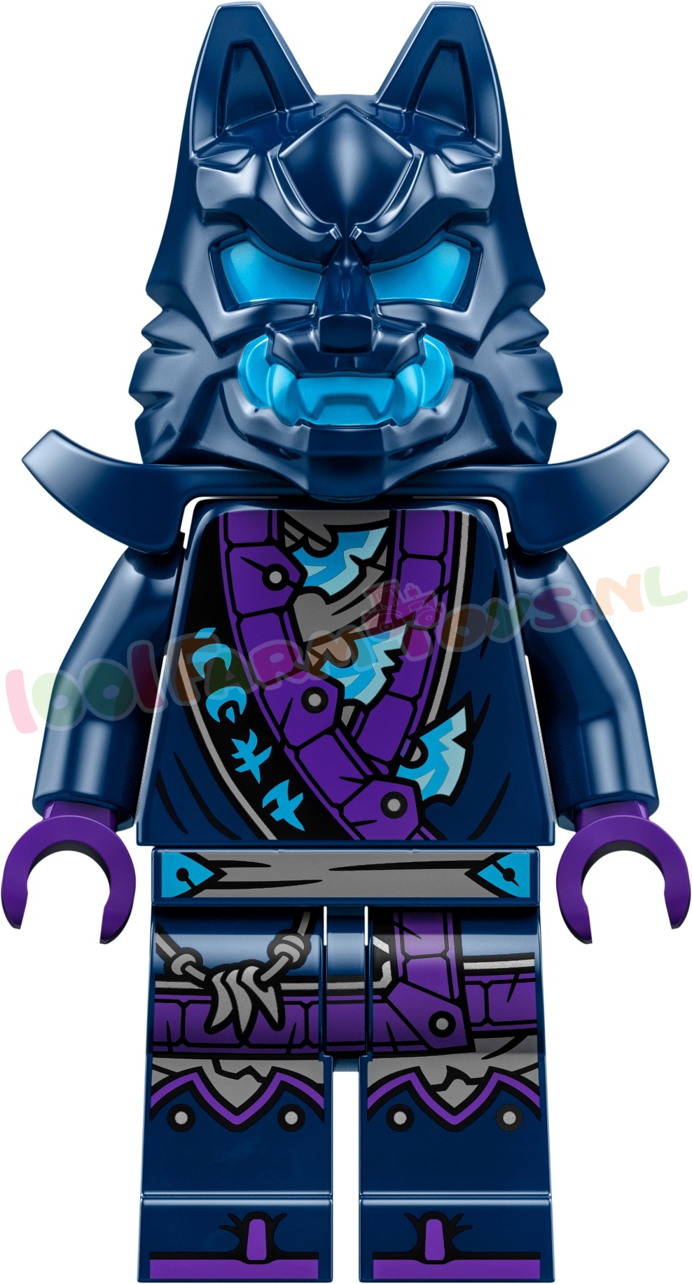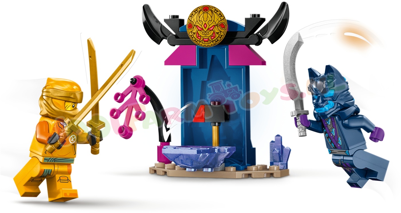 Deze LEGO® set is inclusief 2 minifiguren: Arin met een katana en een Wolvenmasker strijder met een zwaard. Arin past in de verstelbare mechafiguur die een groot zwaard en een draaiend mes vasthoudt. terwijl de Wolvenmasker strijder kan vliegen in een zweefvliegtuig met verstelbare vleugels. een schijfschieter en 2 speren. Er is ook een bouwbare kristallen grot met daarin de Hamer van Verbrijzeling en een wapenrek met 2 gouden katana's.