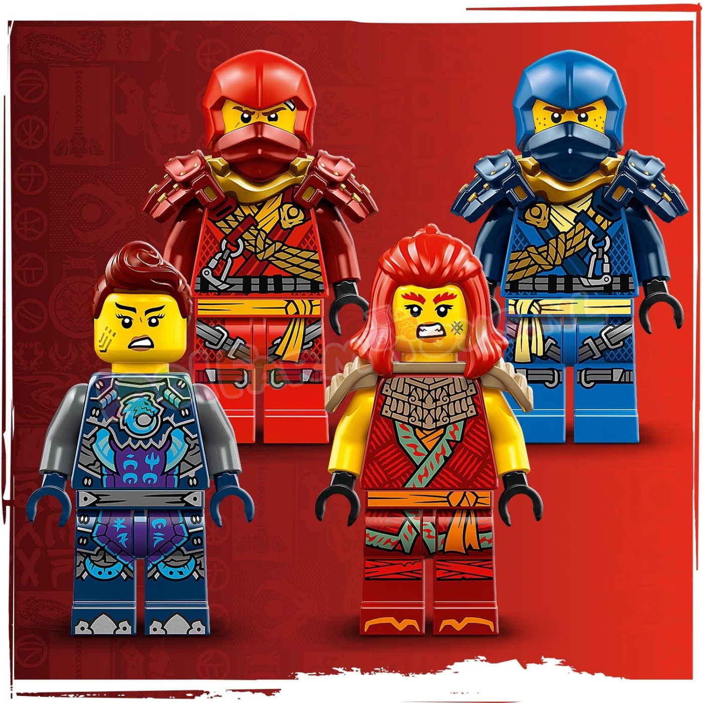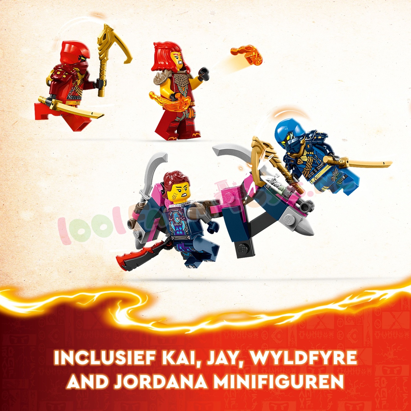 4 NINJAGO® minifiguren – dit ninjaspeelgoed wordt geleverd met Klimmer Kai en Klimmer Jay. elk met een katana. Wyldfyre met 2 brandbare vuisten en Jordana met een zweefvliegtuig