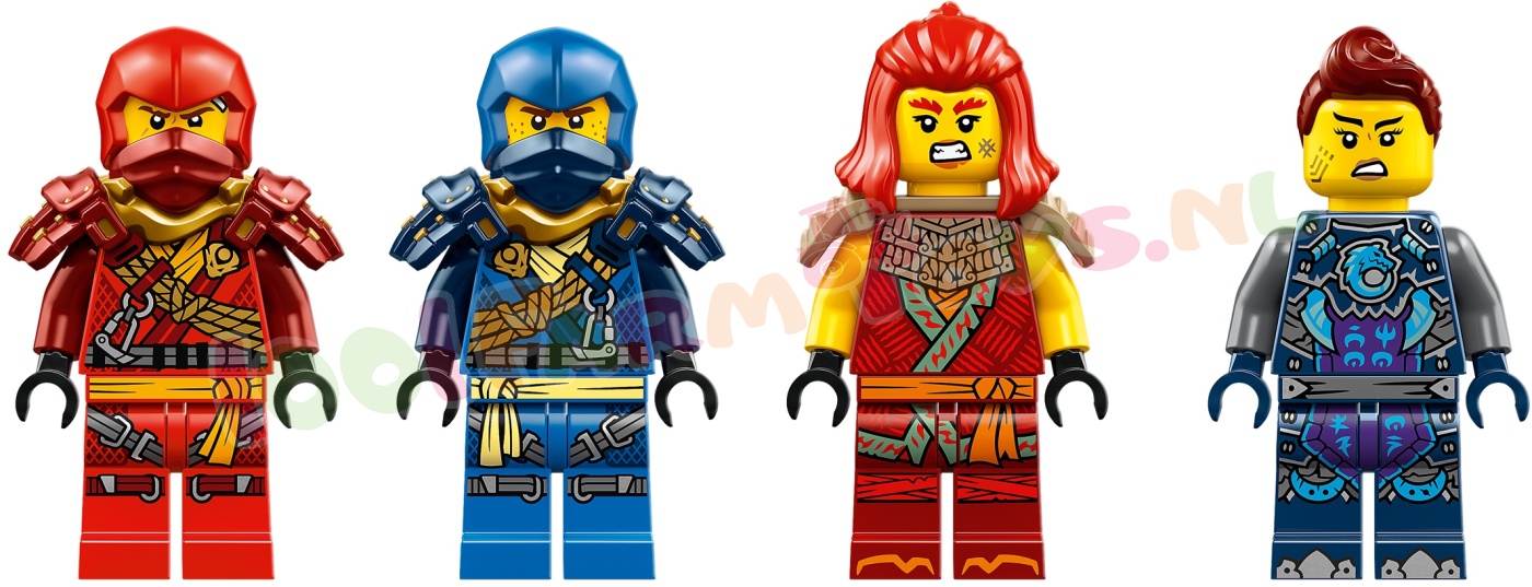 Het ninjaspeelgoed wordt geleverd met 4 NINJAGO minifiguren: Klimmer Kai en Klimmer Jay. elk met een katana. Wyldfyre met 2 brandbare vuisten. en de gemene Jordana met een zweefvliegtuig.