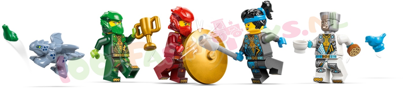 Deze LEGO set bevat 4 NINJAGO minifiguren: Zane. Nya. Kai en Lloyd. plus een drakenfiguur van baby Riyu waarmee kinderen ninja-actie kunnen naspelen. De minifiguren kunnen op 2 draaiplateaus worden geplaatst voor geweldige duels. Voor extra speelwaarde zijn diverse accessoires inbegrepen: 2 zwaarden en 3 staven. een hamer. vogel. kikker. trofee. koekje en een brief.