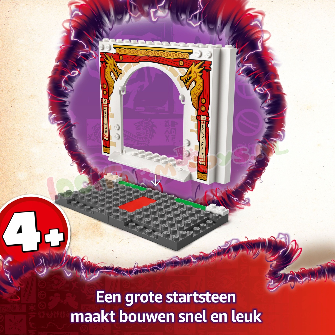Dit ninjaspeelgoed is ontworpen om kinderen vanaf 4 jaar het plezier van bouwen met LEGO stenen te laten ervaren. Het avonturenspeelgoed bevat een startsteen: een gedeeltelijk gebouwde basis waarmee kinderen snel en vol vertrouwen kunnen bouwen.