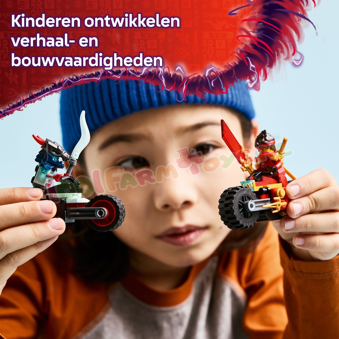 De ninjavoertuigset bevat 2 NINJAGO minifiguren voor op de motoren: Kai. gewapend met een doorschijnend onthullingszwaard en 2 gouden katana's. en een Draconische geestverkenner met een zwaard. zodat kinderen in hun eentje of met hun vrienden kunnen genieten van fantasierijk spel waarin ze confrontaties tussen goed en kwaad naspelen.