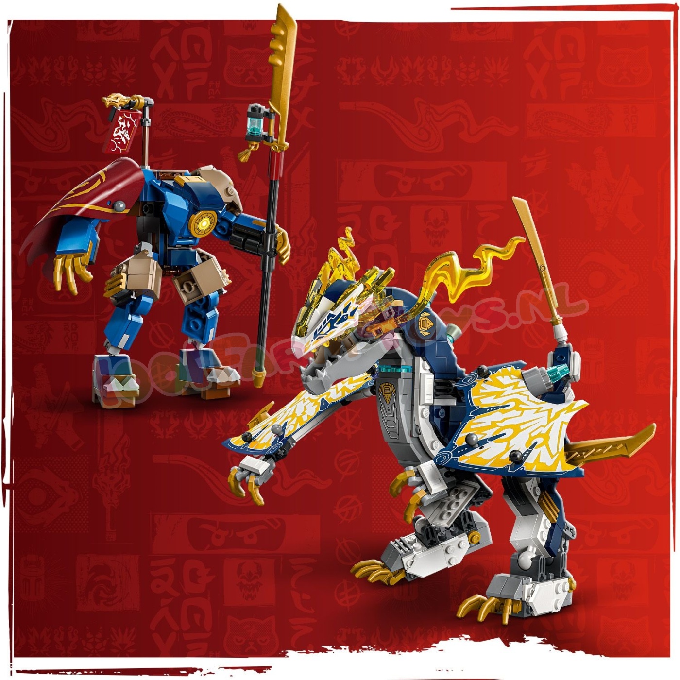 Verstelbare figuren – de mecha heeft beweegbare armen en benen. een borstkas die open kan om een minifiguur in te plaatsen en een zwaard. De speelgoeddraak heeft beweegbare vleugels. kop. kaak. benen en staart. plus een zwaard