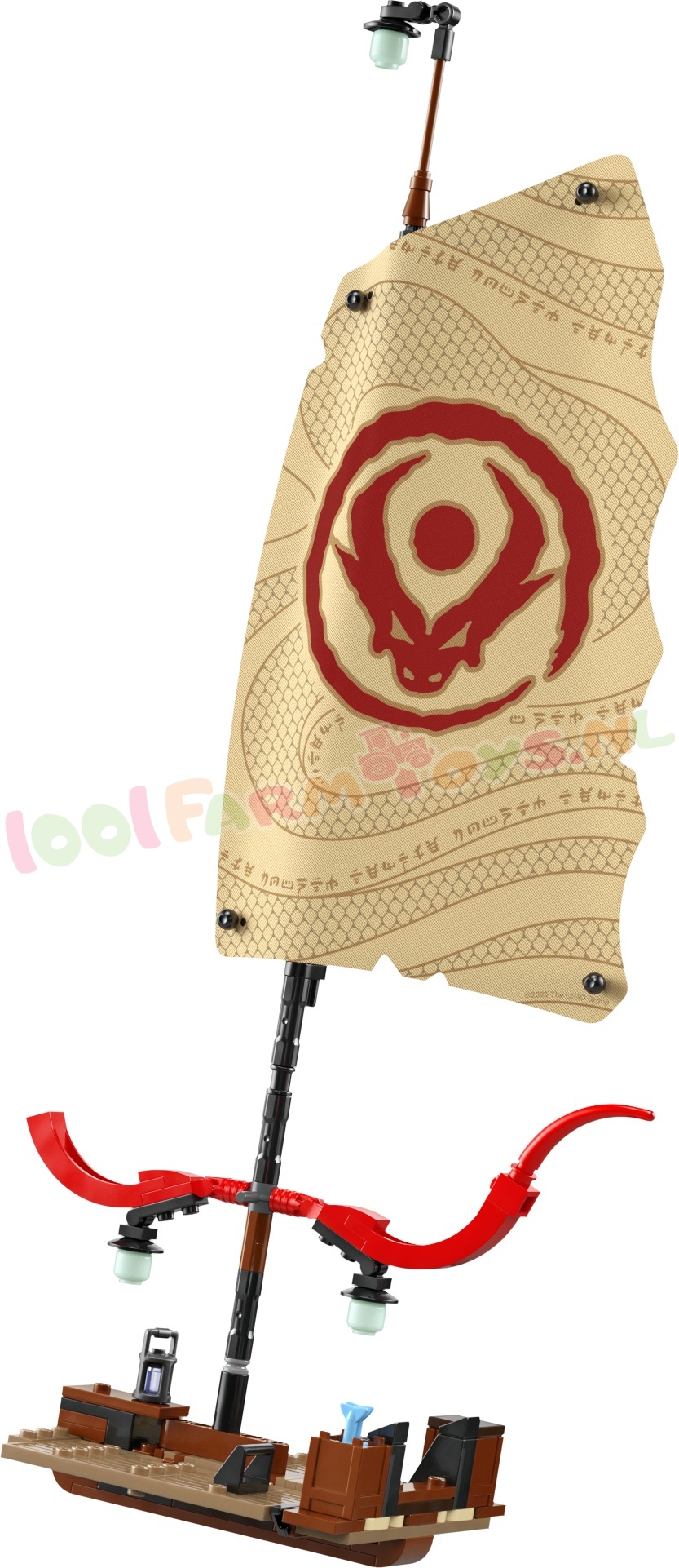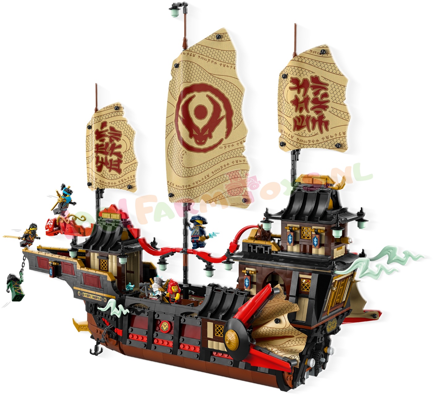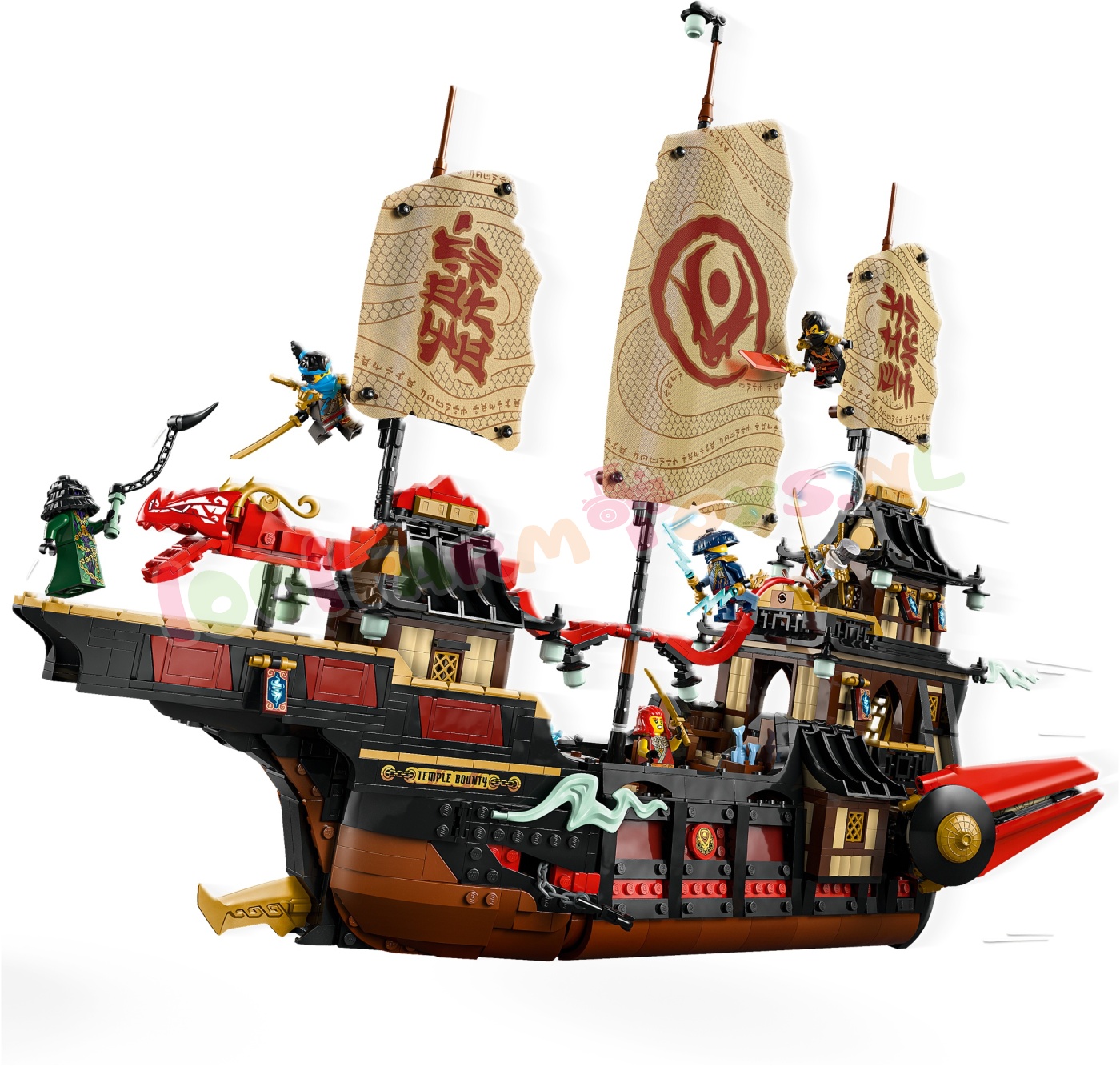 Afmetingen – als het 2387-delige LEGO® NINJAGO® De Tempel Bounty schip wordt neergezet op de standaard. is het model ca. 49 cm hoog. 58 cm lang en 26 cm breed.