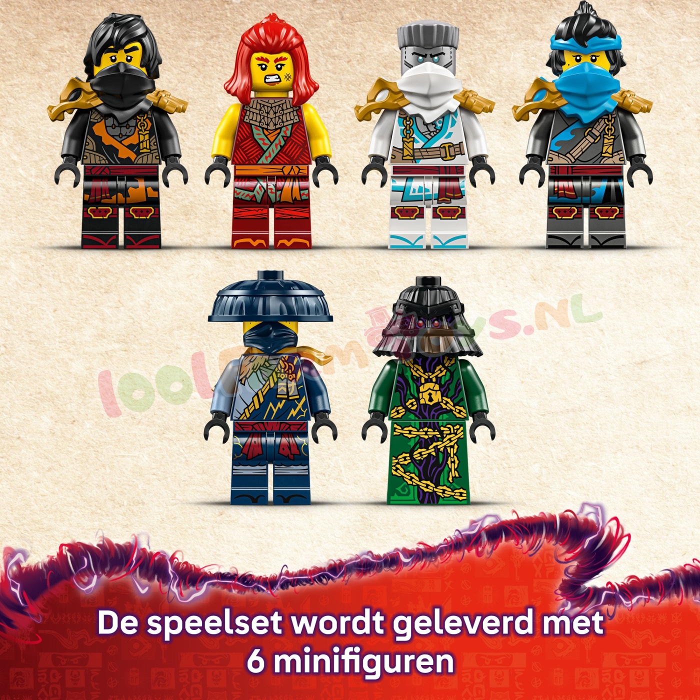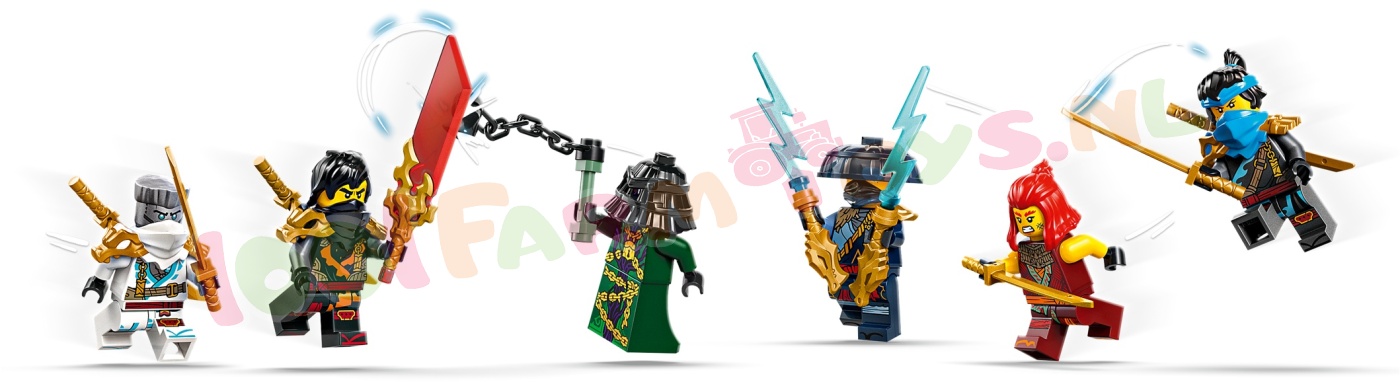 6 minifiguren – de speelset is inclusief Zane. Cole. Wyldfyre. Nya. Rogue en Zarkt met wapenaccessoires en een doorschijnend onthullingszwaard waarmee je een geheime kaart op de tafel van de kapitein kunt laten verschijnen