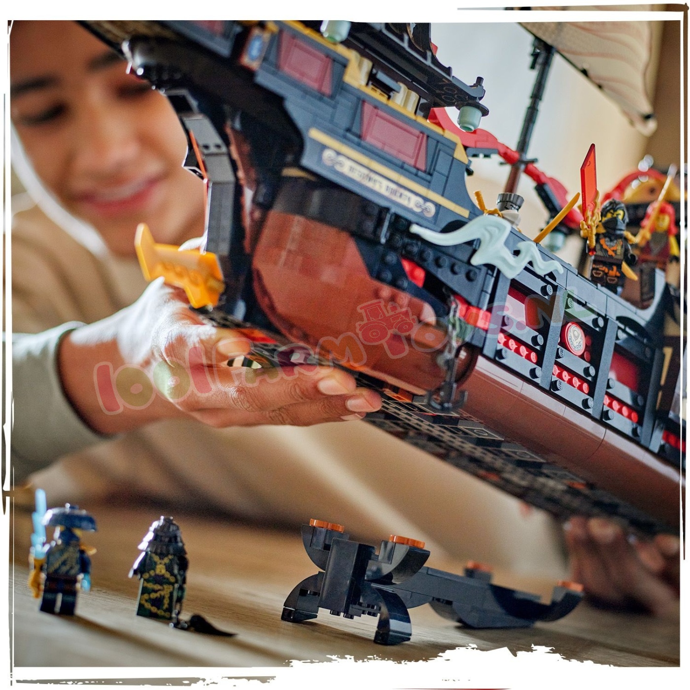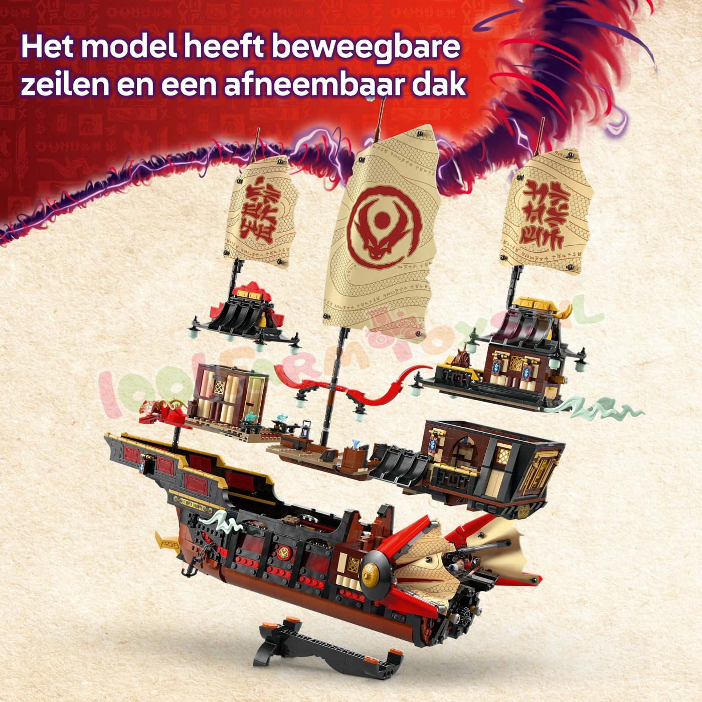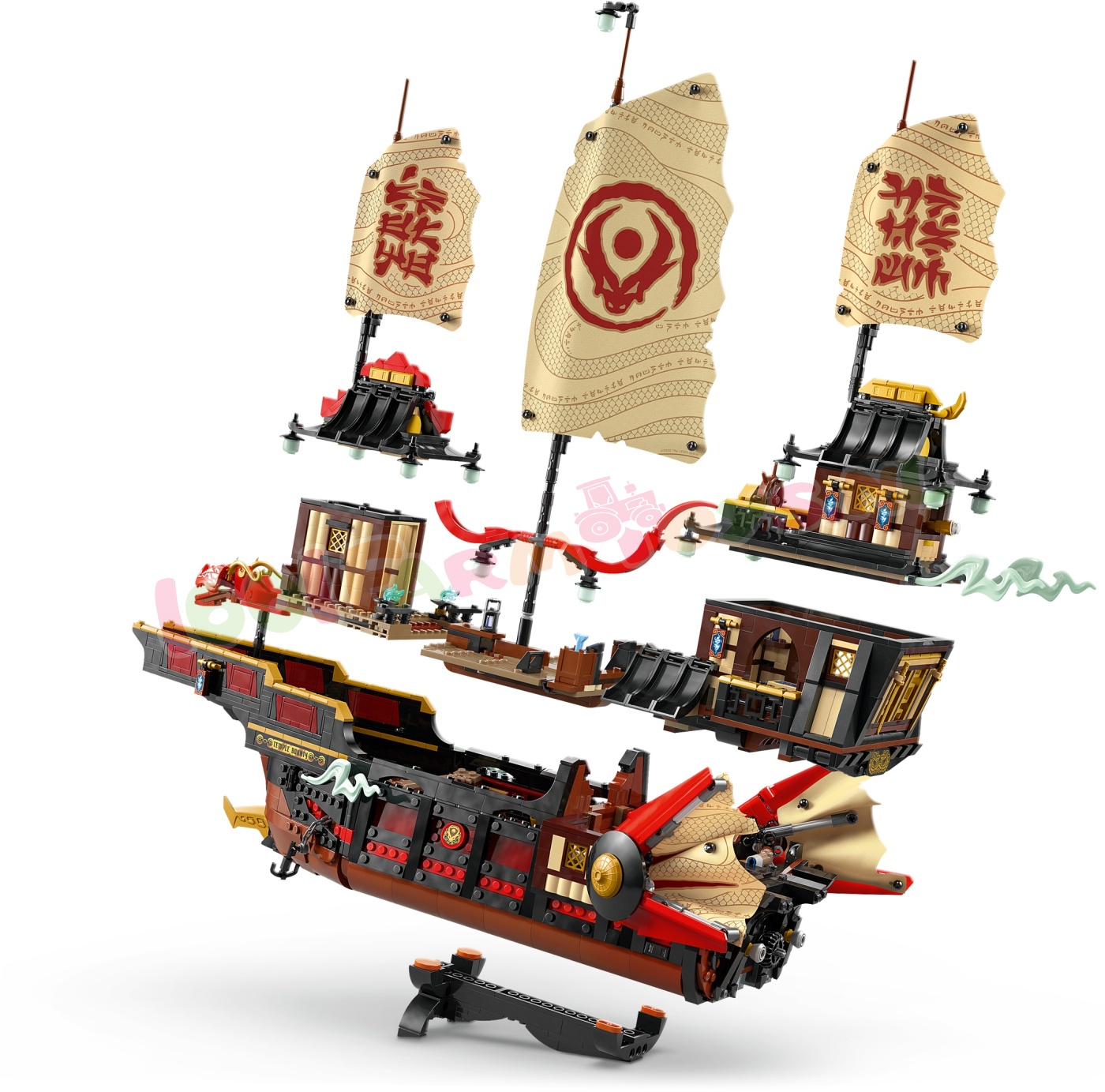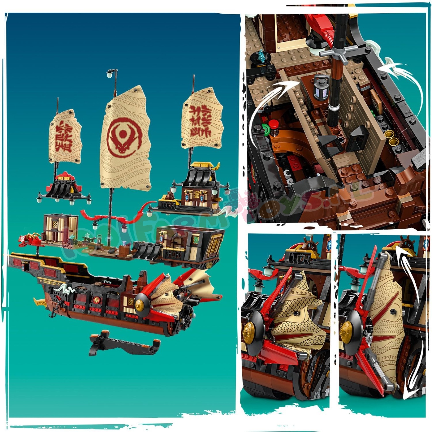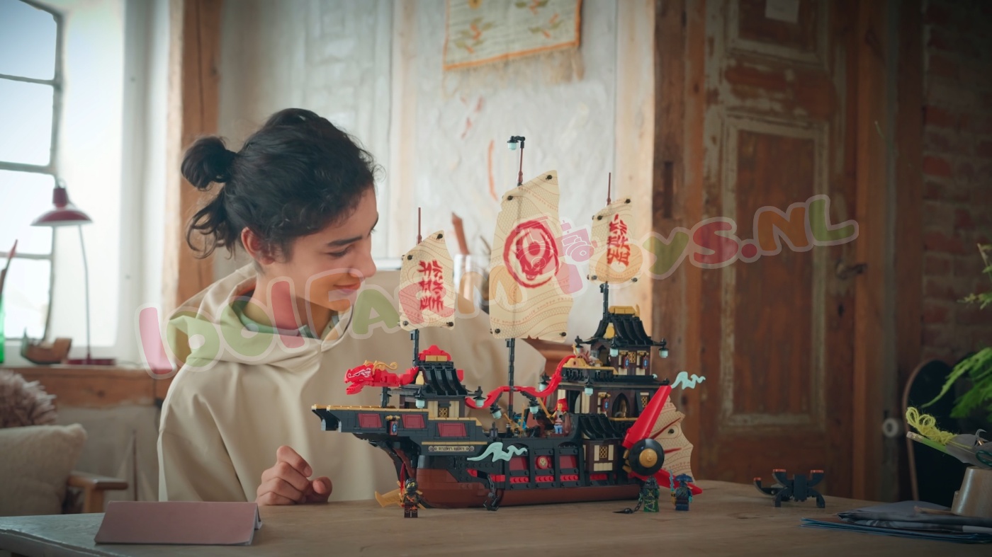 Deze set bevat alles wat ninjafans nodig hebben om verhalen uit seizoen 3 van de tv-serie NINJAGO De Drakenstrijd na te spelen: een tandwiel om de zeilen te openen en te sluiten. afneembare daken en vloeren om toegang te krijgen tot het interieur van het schip. Er is zelfs een sushibar en een tafel in de hoofdcabine die kan worden opgeklapt om een geheime computer te ontdekken.