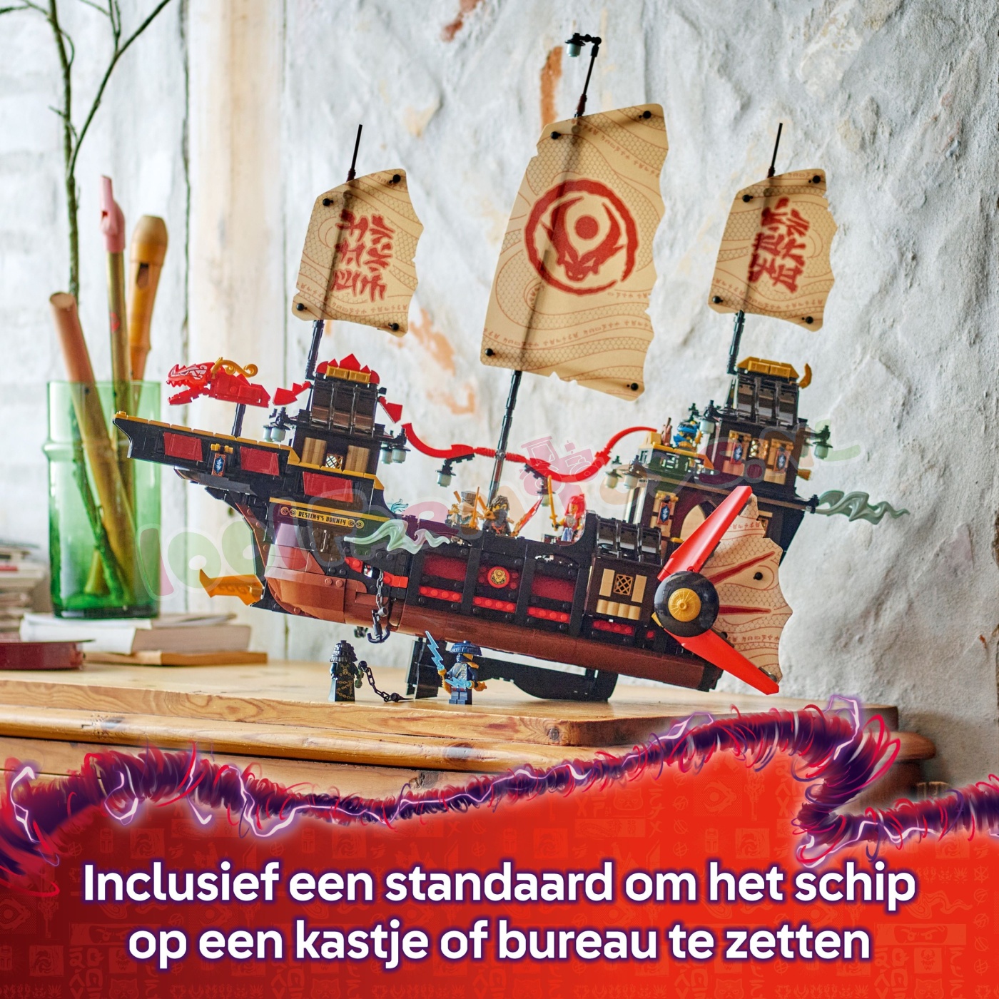 Bootmodel met displaystandaard – na urenlang verhalen vertellen kunnen ninjafans de standaard van het actiespeelgoed gebruiken om dit gedetailleerde speelgoedschip op een plank of nachtkastje neer te zetten