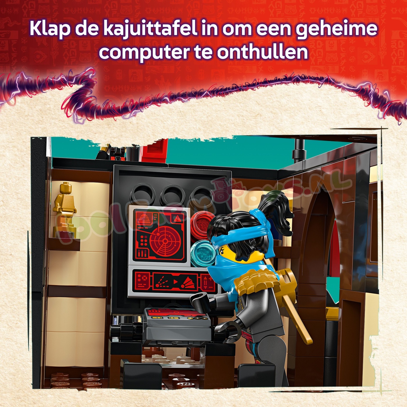 Interactieve speelset met schip – NINJAGO® fans draaien aan een tandwiel om de zeilen te bewegen. verwijderen daken en vloeren om toegang te krijgen tot het interieur en een sushibar en klappen een tafel op om een geheime computer te ontdekken