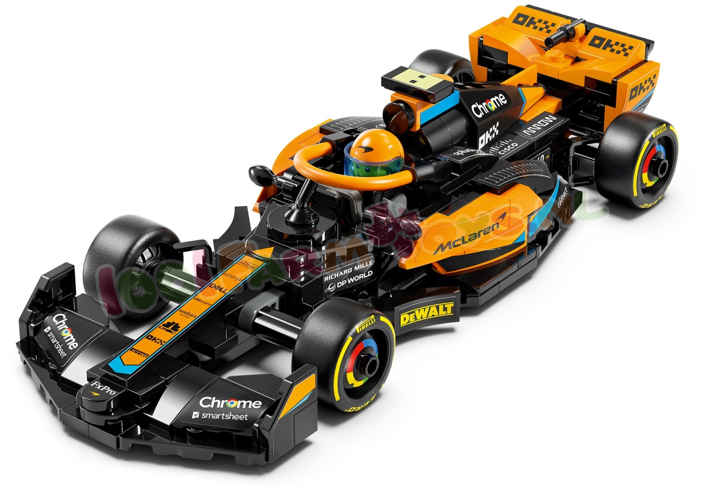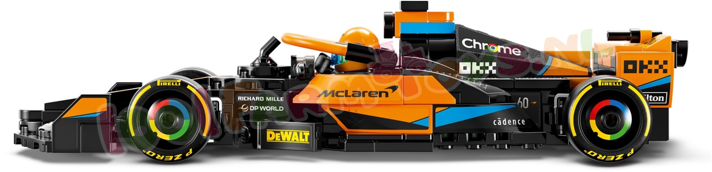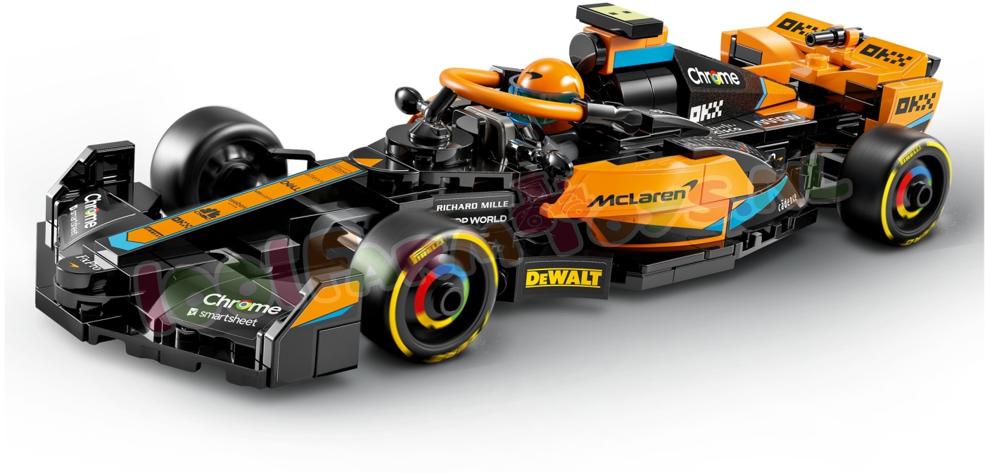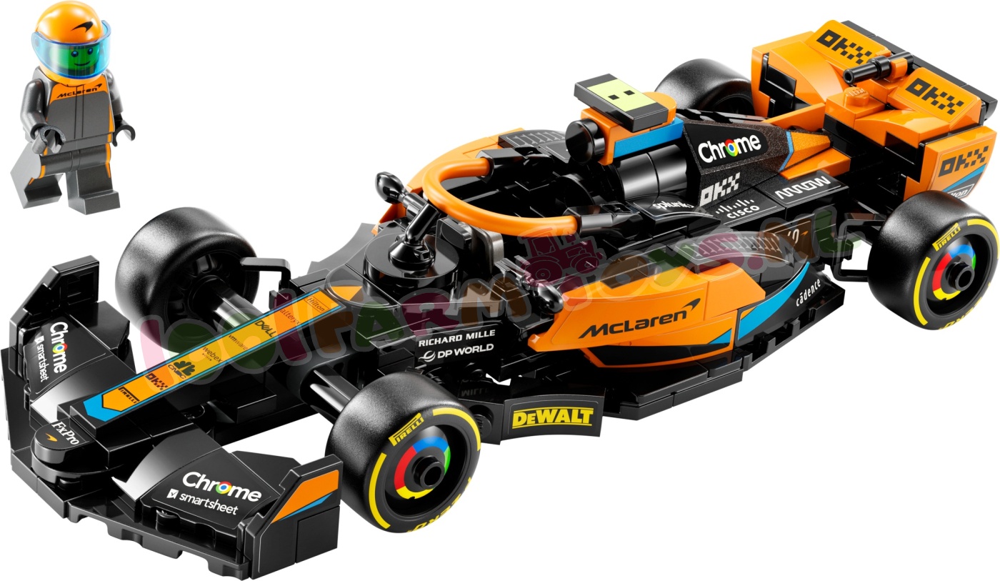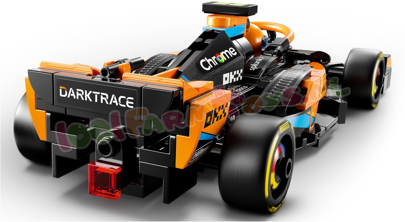 Het McLaren voertuig bevat veel realistische details: de uitvoering in zwart en papaja. sponsorlogo's. wielen met Pirelli opdruk en papajakleurige halo. Inclusief een minifiguur van een coureur die kinderen achter het stuur kunnen plaatsen voor spannende races.