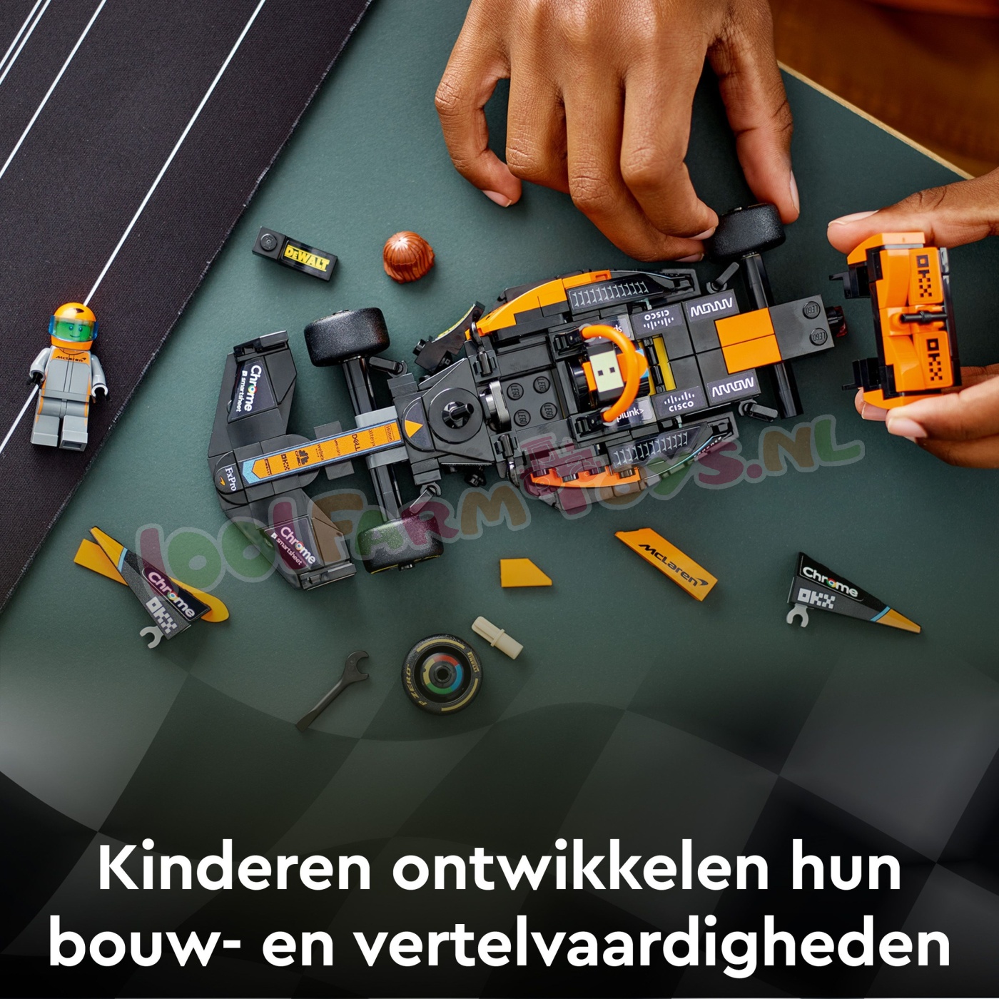 1 minifiguur – de bouwbare McLaren auto wordt geleverd met een minifiguur van een coureur met een helm. pruik en moersleutel die kinderen achter het stuur kunnen plaatsen om supersnelle F1 races op het circuit na te spelen