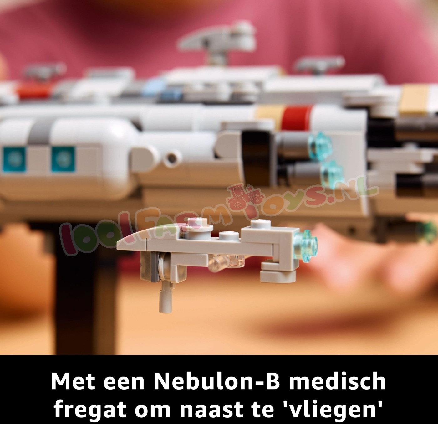 Roep nostalgische herinneringen op aan Star Wars: Return of the Jedi™ met het allereerste LEGO® Star Wars™ model van de Home One Starcruiser (75405). die onder bevel stond van admiraal Ackbar tijdens de Slag om Endor. Deze bouwset van een ruimteschip is een leuk Star Wars cadeau voor volwassenen en biedt een complexe. boeiende ervaring. Bouw authentieke kenmerken van het vlaggenschipfregat van de Rebellenalliantie na en zet het neer op de bouwbare standaard met naamplaatje. De zijkant kan worden losgemaakt om het interieur te bekijken en de set bevat ook een klein Nebulon-B medisch fregat dat naast Home One kan 'vliegen'.