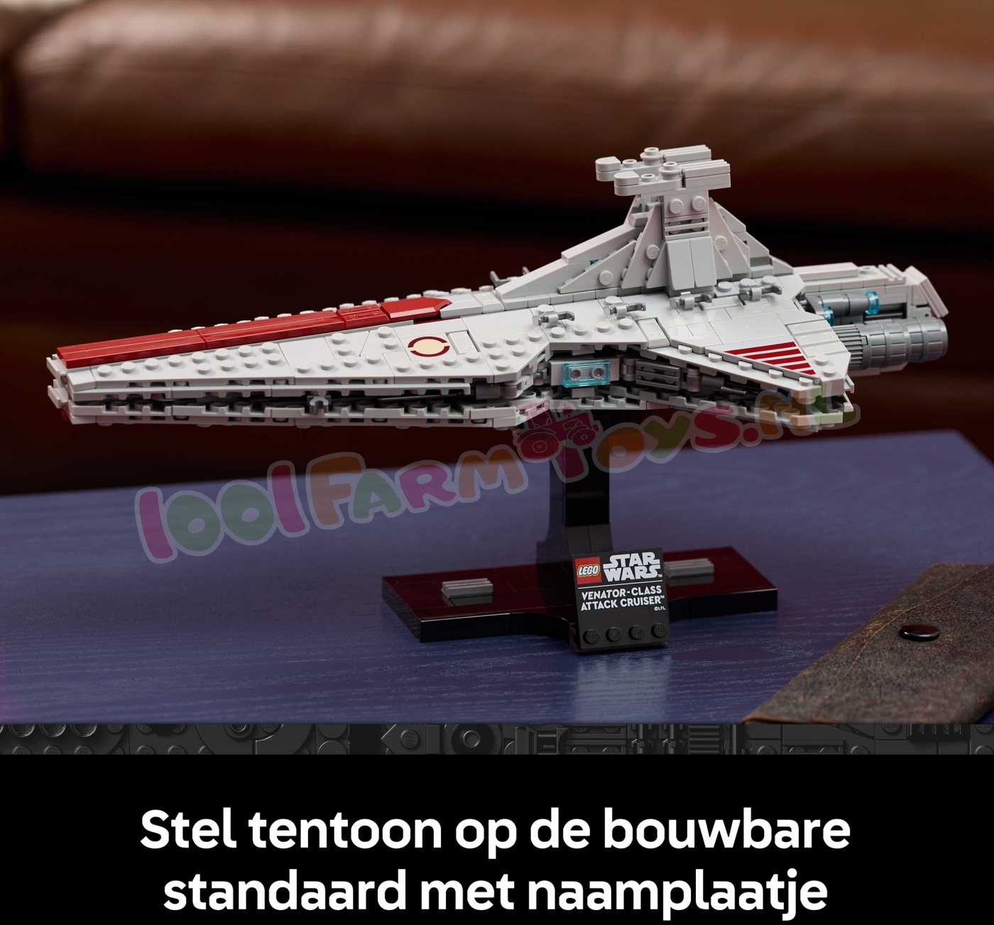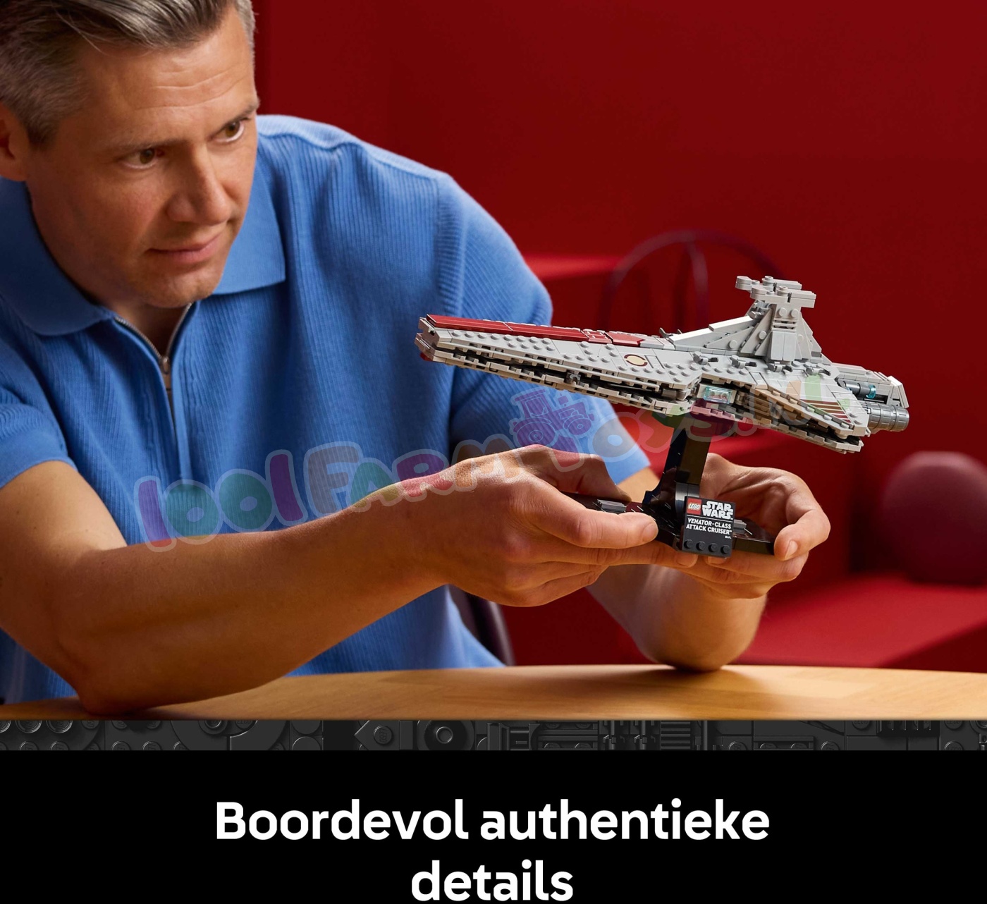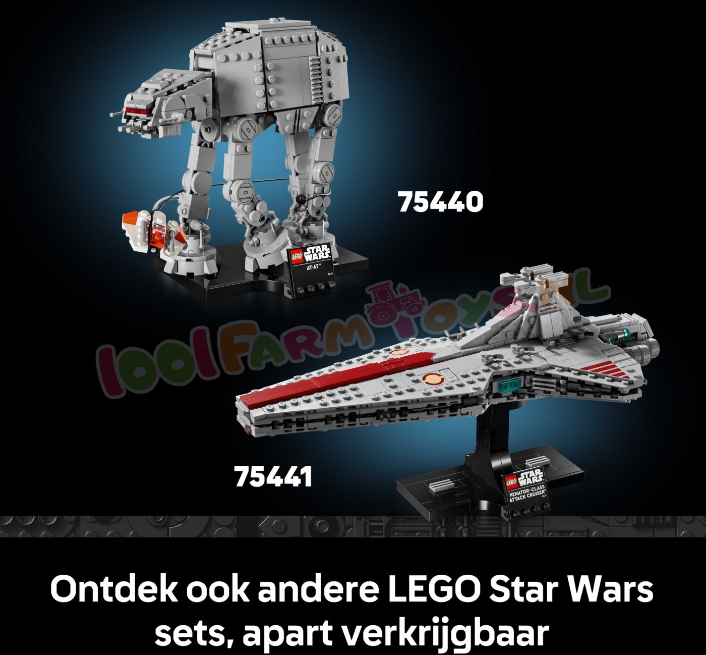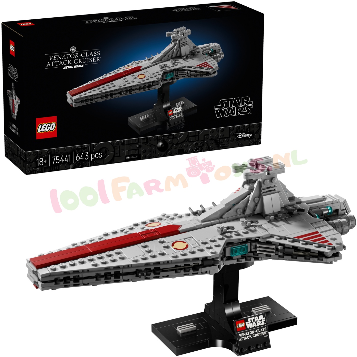 Creëer het gestroomlijnde ontwerp van een Venator-Class Attack Cruiser met deze modelbouwset van een ruimteschip (75441). Gebruik LEGO® stenen om het kenmerkende silhouet en de authentieke details van een van de meest veelzijdige ruimteschepen uit de vloot van het Keizerrijk na te bouwen. Beleef scènes uit Star Wars: Revenge of the Sith™ opnieuw terwijl je geniet van dit ingewikkelde en boeiende bouwprocies. Zet de Attack Cruiser op de bouwbare standaard met een naamplaatje om het indrukwekkende display helemaal af te maken.Deze set maakt deel uit van de LEGO Star Wars™ ruimteschipcollectie op middelgrote schaal en is een geweldig cadeau voor jezelf of een andere volwassen fan van de prequeltrilogie.Geniet van nog meer bouwplezier met de LEGO Builder app. Bouw met 3D-instructies. zoom in op je model en draai het terwijl je je voortgang bijhoudt – allemaal vanuit de app. De set bevat 643 onderdelen. MODELBOUWSET VAN EEN RUIMTESCHIP – bouw een LEGO® displaymodel op middelgrote schaal van een Venator-Class Attack Cruiser (75441) uit Star Wars: Revenge of the Sith™ AUTHENTIEKE DETAILS – leg het gestroomlijnde silhouet en de kenmerkende details van het bekende Venator-Class Attack Cruiser ruimteschip vast met LEGO® stenen GEMAAKT OM NEER TE ZETTEN – zet je creatie op de bouwbare standaard met naamplaatje en haal het bovenste gedeelte eraf om de hangar te onthullen BOUW JE VERZAMELING UIT – deze set maakt deel uit van een serie bouwbare verzamelmodellen op middelgrote schaal van bekende Star Wars™ ruimteschepen CADEAU VOOR VOLWASSENEN – verwen jezelf of geef deze LEGO® bouwset cadeau aan een andere fan van de Star Wars™ prequel-trilogie of een verzamelaar van LEGO Star Wars sets 3D-BOUWINSTRUCTIES – met de LEGO® Builder app kun je je modellen bouwen met behulp van 3D-instructies. je voortgang bijhouden en al je sets opslaan in de app VAN EEN STERRENSTELSEL HIER VER. VER VANDAAN TOT IN JOUW HUISKAMER – LEGO® Star Wars™ verzamelsets voor volwassenen zijn ontworpen voor mensen die zich graag ontspannen met praktische en creatieve activiteiten AFMETINGEN – dit 643-delige bouwmodel van een Star Destroyer is ca. 15 cm hoog. 31 cm lang en 16 cm breed en vormt een opvallend stuk decoratie voor elke kamer.