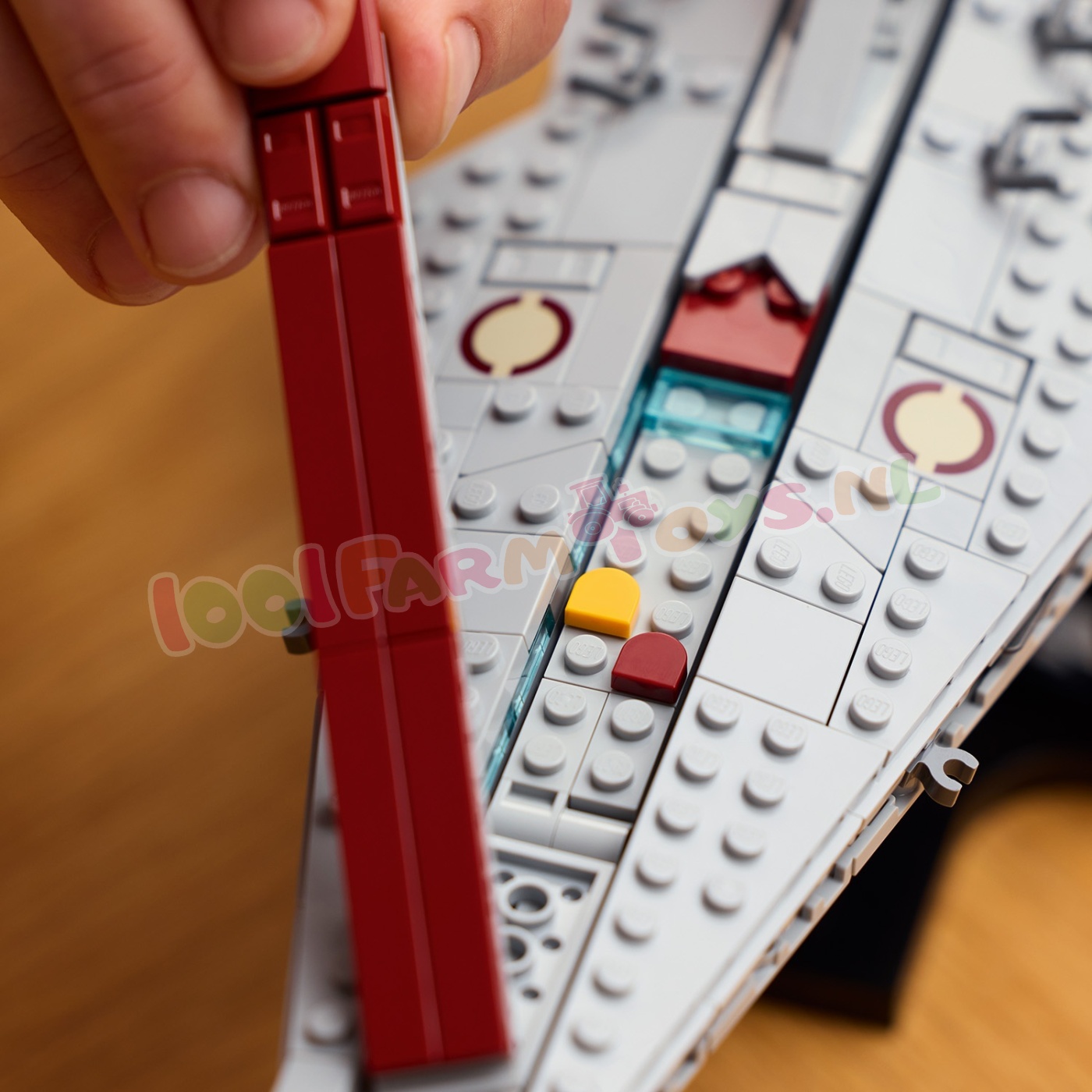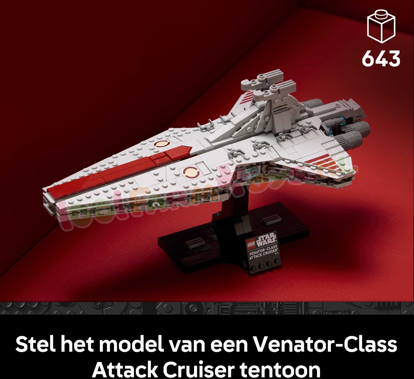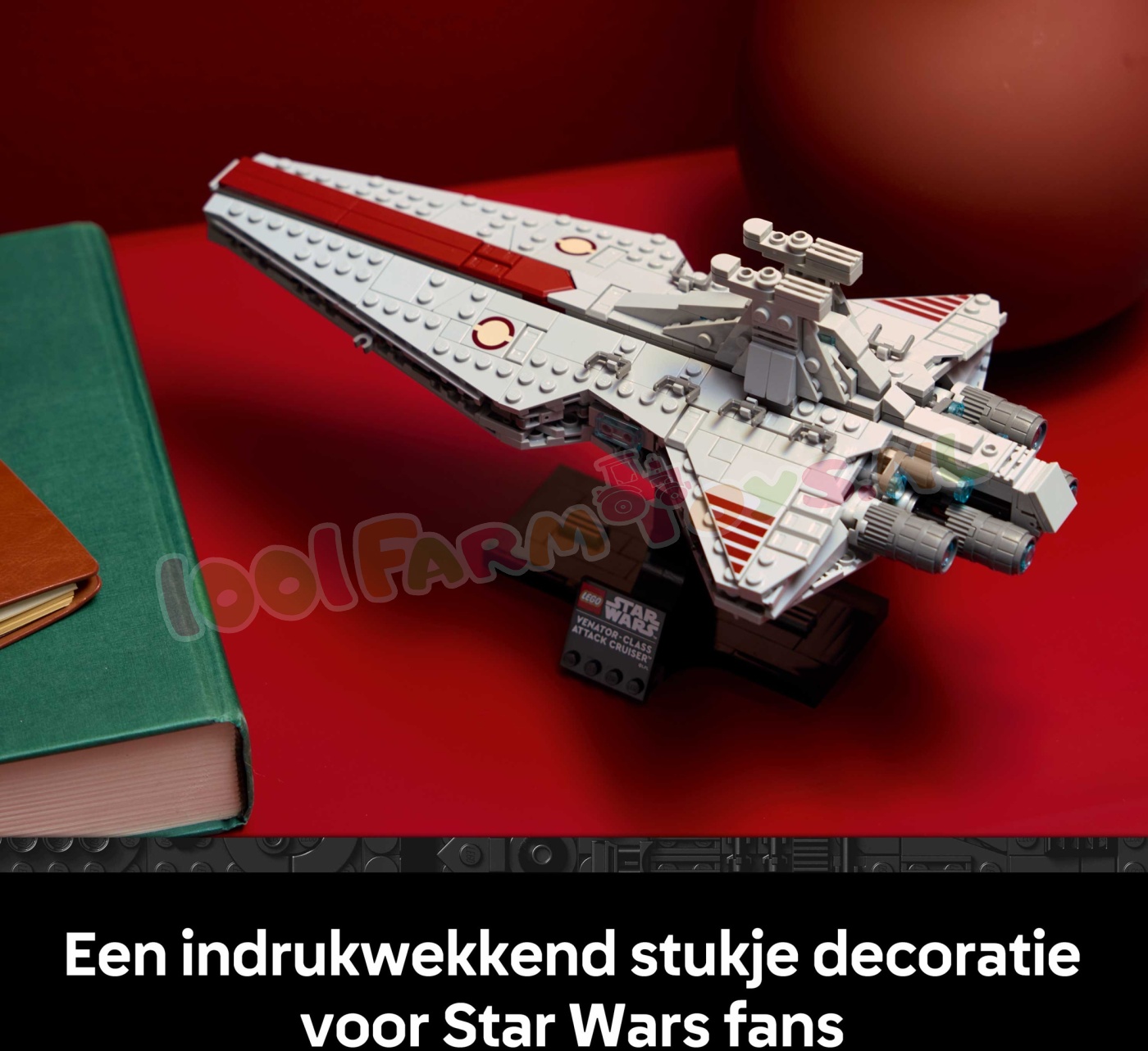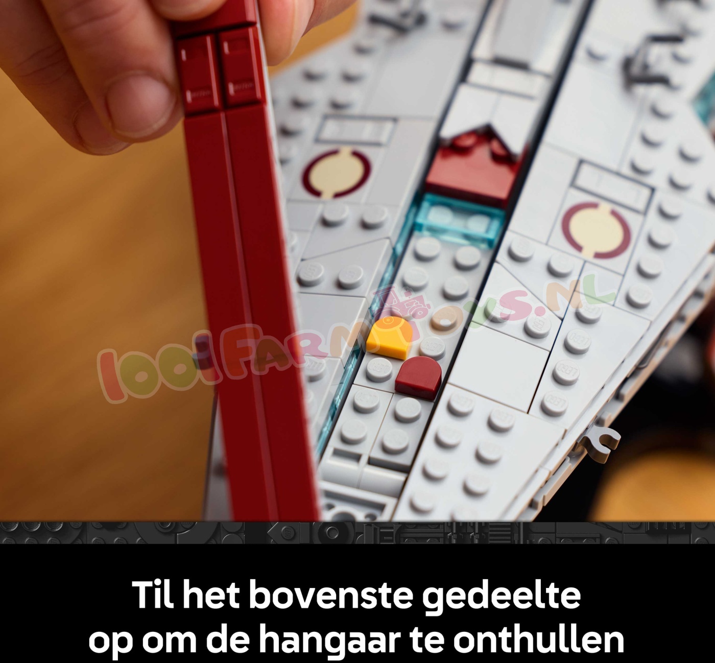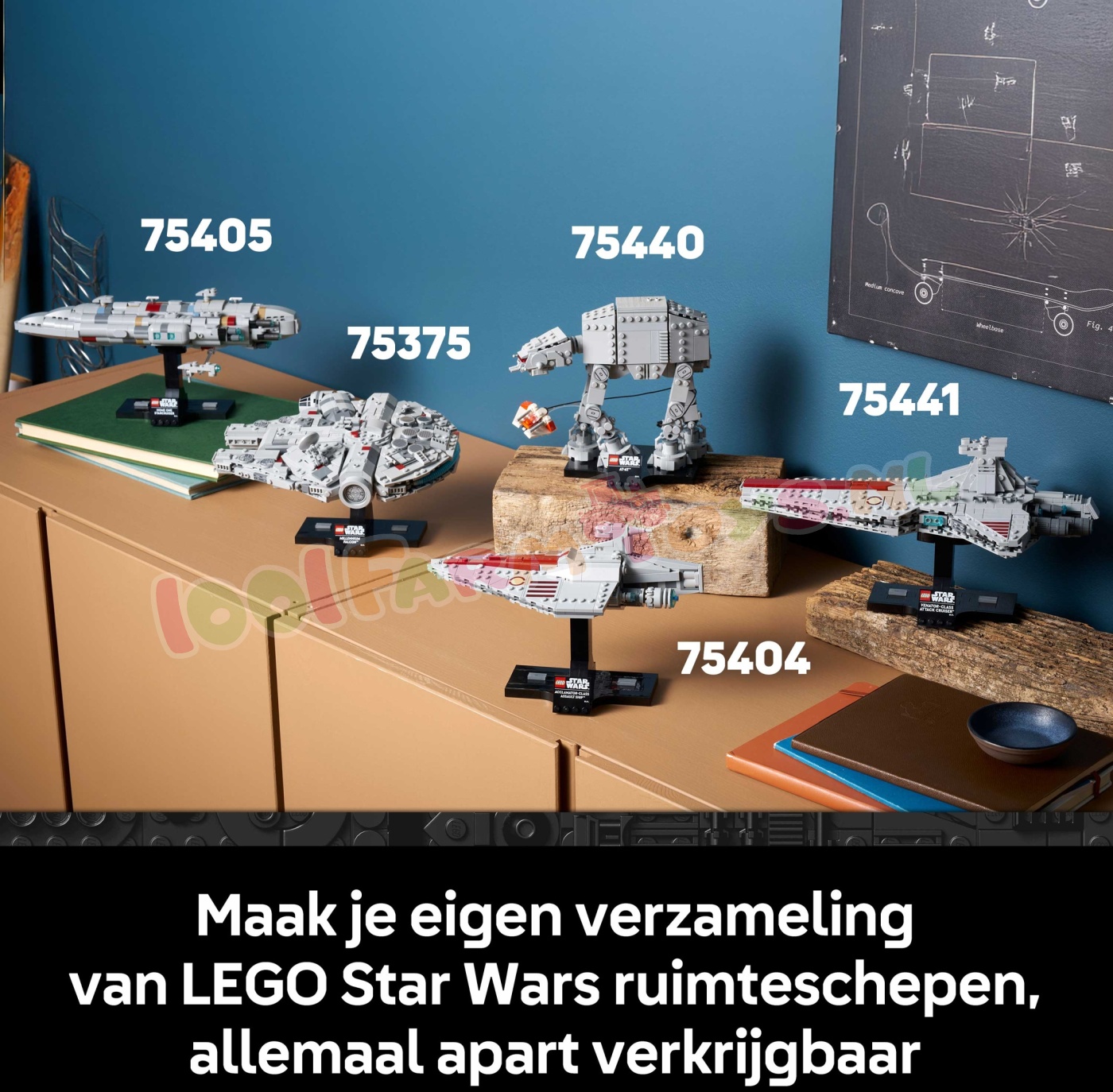 Creëer het gestroomlijnde ontwerp van een Venator-Class Attack Cruiser met deze modelbouwset van een ruimteschip (75441). Gebruik LEGO® stenen om het kenmerkende silhouet en de authentieke details van een van de meest veelzijdige ruimteschepen uit de vloot van het Keizerrijk na te bouwen. Beleef scènes uit Star Wars: Revenge of the Sith™ opnieuw terwijl je geniet van dit ingewikkelde en boeiende bouwprocies. Zet de Attack Cruiser op de bouwbare standaard met een naamplaatje om het indrukwekkende display helemaal af te maken.Deze set maakt deel uit van de LEGO Star Wars™ ruimteschipcollectie op middelgrote schaal en is een geweldig cadeau voor jezelf of een andere volwassen fan van de prequeltrilogie.Geniet van nog meer bouwplezier met de LEGO Builder app. Bouw met 3D-instructies. zoom in op je model en draai het terwijl je je voortgang bijhoudt – allemaal vanuit de app. De set bevat 643 onderdelen. MODELBOUWSET VAN EEN RUIMTESCHIP – bouw een LEGO® displaymodel op middelgrote schaal van een Venator-Class Attack Cruiser (75441) uit Star Wars: Revenge of the Sith™ AUTHENTIEKE DETAILS – leg het gestroomlijnde silhouet en de kenmerkende details van het bekende Venator-Class Attack Cruiser ruimteschip vast met LEGO® stenen GEMAAKT OM NEER TE ZETTEN – zet je creatie op de bouwbare standaard met naamplaatje en haal het bovenste gedeelte eraf om de hangar te onthullen BOUW JE VERZAMELING UIT – deze set maakt deel uit van een serie bouwbare verzamelmodellen op middelgrote schaal van bekende Star Wars™ ruimteschepen CADEAU VOOR VOLWASSENEN – verwen jezelf of geef deze LEGO® bouwset cadeau aan een andere fan van de Star Wars™ prequel-trilogie of een verzamelaar van LEGO Star Wars sets 3D-BOUWINSTRUCTIES – met de LEGO® Builder app kun je je modellen bouwen met behulp van 3D-instructies. je voortgang bijhouden en al je sets opslaan in de app VAN EEN STERRENSTELSEL HIER VER. VER VANDAAN TOT IN JOUW HUISKAMER – LEGO® Star Wars™ verzamelsets voor volwassenen zijn ontworpen voor mensen die zich graag ontspannen met praktische en creatieve activiteiten AFMETINGEN – dit 643-delige bouwmodel van een Star Destroyer is ca. 15 cm hoog. 31 cm lang en 16 cm breed en vormt een opvallend stuk decoratie voor elke kamer.