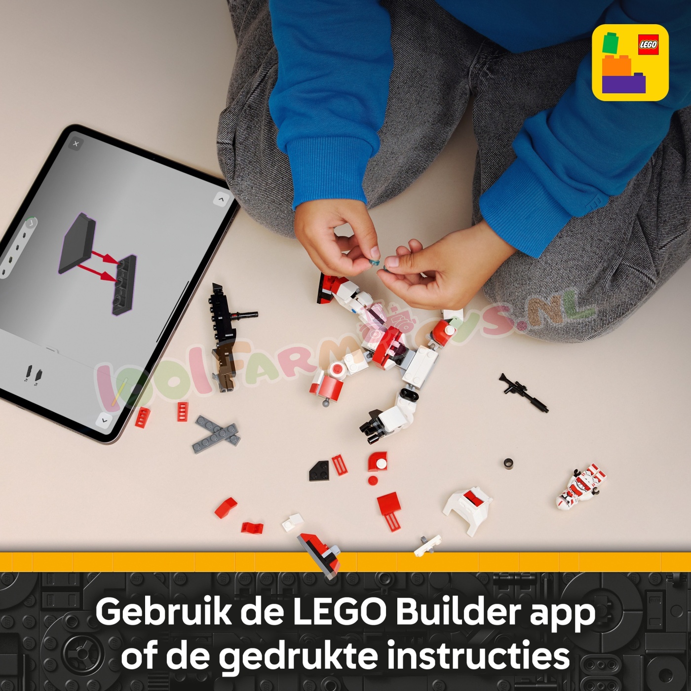 Laat jonge kinderen kennismaken met het LEGO® Star Wars™ universum met de Clone Shock Trooper mecha (75448). Deze verstelbare mecha is een geweldig cadeau voor kinderen en Star Wars fans van 6 jaar en ouder en is ontworpen om gemakkelijk in elkaarte zetten. zodat het speelplezier snel kan beginnen. Plaats de LEGO minifiguur van de Clone Shock Trooper in de cockpit van de mecha en bevestig zijn blastergeweer aan de achterkant. Zet de armen. benen en voeten van de mecha in allerlei gevechtspositi es. Plaats het grote blastergeweer in zijn handen en activeer de noppenschieter. Met zijn pantser in het kenmerkende rood en wit van de Clone Shock Troopers ziet de mechea er ook cool uit in de kinderkamer tussen de missies door. Deze bouwset met een speelgoedmecha maakt deel uit van een collectie LEGO Star Wars mecha om te verzamelen (apart verkrijgbaar). En kinderen kunnen vol zelfvertrouwen bouwen met de LEGO Builder app die ze kunnen gebruiken om in te zoomen. hun model in 3D te draaien en hun voortgang bij te houden met de eenvoudig te volgen digitale instructies. De set bevat 151 onderdelen. MECHA BOUW- EN SPEELSET – laat kinderen kennismaken met het LEGO® Star Wars™ universum boordevol actie met deze snel te bouwen. verstelbare Clone Shock Trooper mecha (75448) figuur LEGO® STAR WARS™ MINIFIGUUR – plaats de Clone Shock Trooper LEGO minifiguur in de cockpit van de gepantserde mecha en bevestig zijn blastergeweer aan de achterkant van de mecha SPELEN EN NEERZETTEN – verstel de handen. armen. benen en voeten van de mecha. richt het grote noppenschietende blastergeweer op vijandenen zet de mecha na het spelen op een mooi plekje VERZAMELSET – deze bouwbare mecha maakt deel uit van een collectie LEGO® Star Wars™ mecha. apart verkrijgbaar CADEAU VOOR KINDEREN – deze bouwbare mecha van LEGO® stenen is een cool Star Wars™ cadeau voor creatieve jongens. meisjes en fans van 6 jaar en ouder ONTDEK HET ASSORTIMENT – met LEGO® Star Wars™ sets (apart verkrijgbaar) kunnen kinderen en volwassen fans klassieke scènes herbeleven. fantasierijke avonturen verzinnen of het bouwspeelgoed op een mooi plekje neerzetten EEN LEUKE BOUWERVARING – de LEGO® Builder app begeleidt kinderen op een intuïtief bouwavontuur. Ze kunnen hun voortgang bijhouden. op modellen inzoomen en ze draaien met 3D-instructies tijdens het bouwen en meer AFMETINGEN – de Clone Shock Trooper mecha in deze 151-delige set is ca. 13 cm hoog.