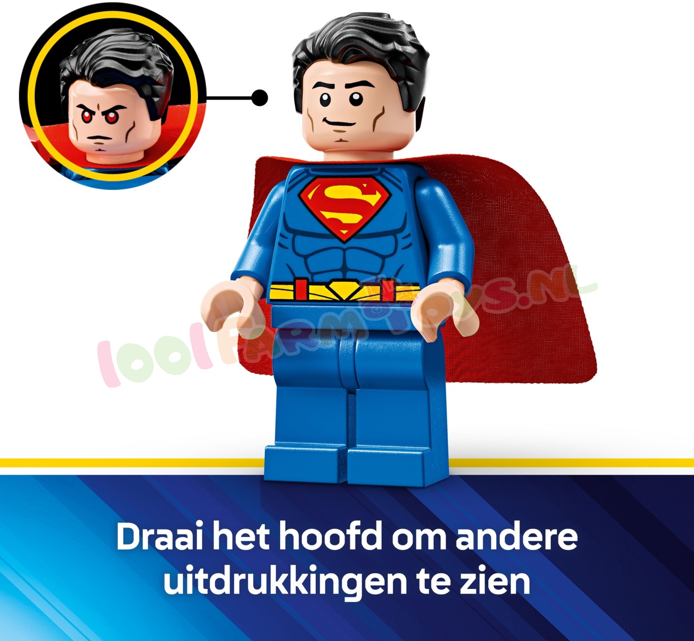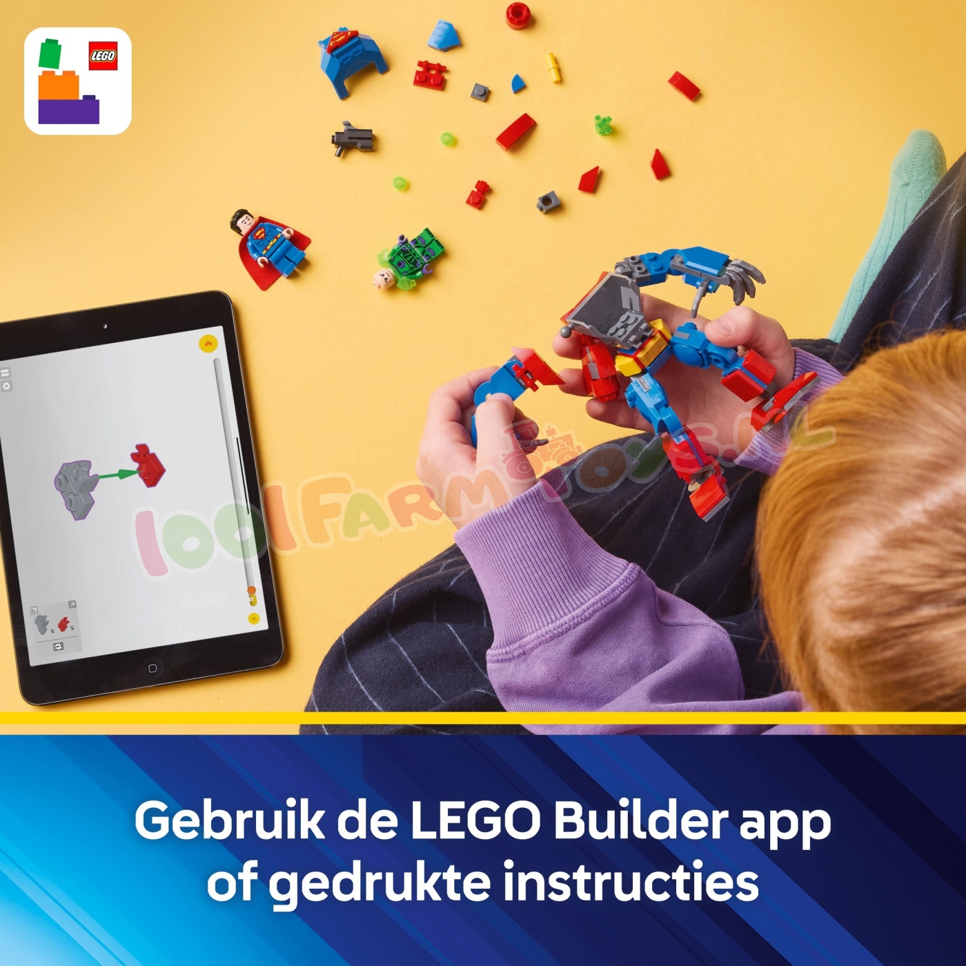 Deze LEGO DC Superman speelset wordt geleverd met 2 minifiguren: Superman met een stoffen cape en omkeerbaar hoofd met verschillende uitdrukkingen en Lex Luthor met een noppenschieter en een kryptonietkristal. De bouwbare mecha heeft beweegbare armen. benen en vingers. De romp kan open en bevat een cockpit waar de Superman minifiguur inkan zitten. Aan de achterkant van de mecha zitten 2 verstelbare boosters die de mecha laten 'vliegen'. Voor nog meer digitaal plezier kunnen bouwers inzoomen. modellen in 3D draaien en hun voortgang bijhouden met de leuke. intuïtieve LEGO Builder app.