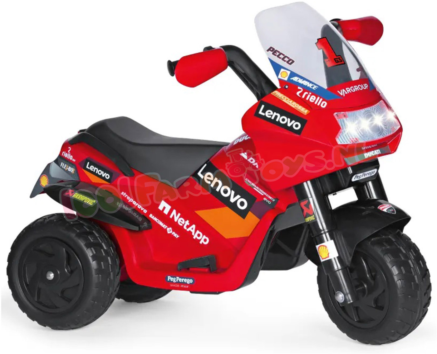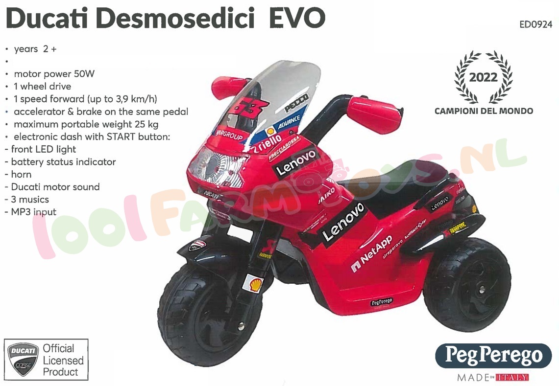 De legendarische Ducati Desmosedici Evo - voor Ducati motorrijders van de toekomst. Dit volledig Italiaanse juweeltje toont zijn buitengewone "EVOlution" met zijn nog beter presterende eigenschappen. Lichtjes. geluiden en een claxon voor veel speelplezier vanaf 2 jaar.