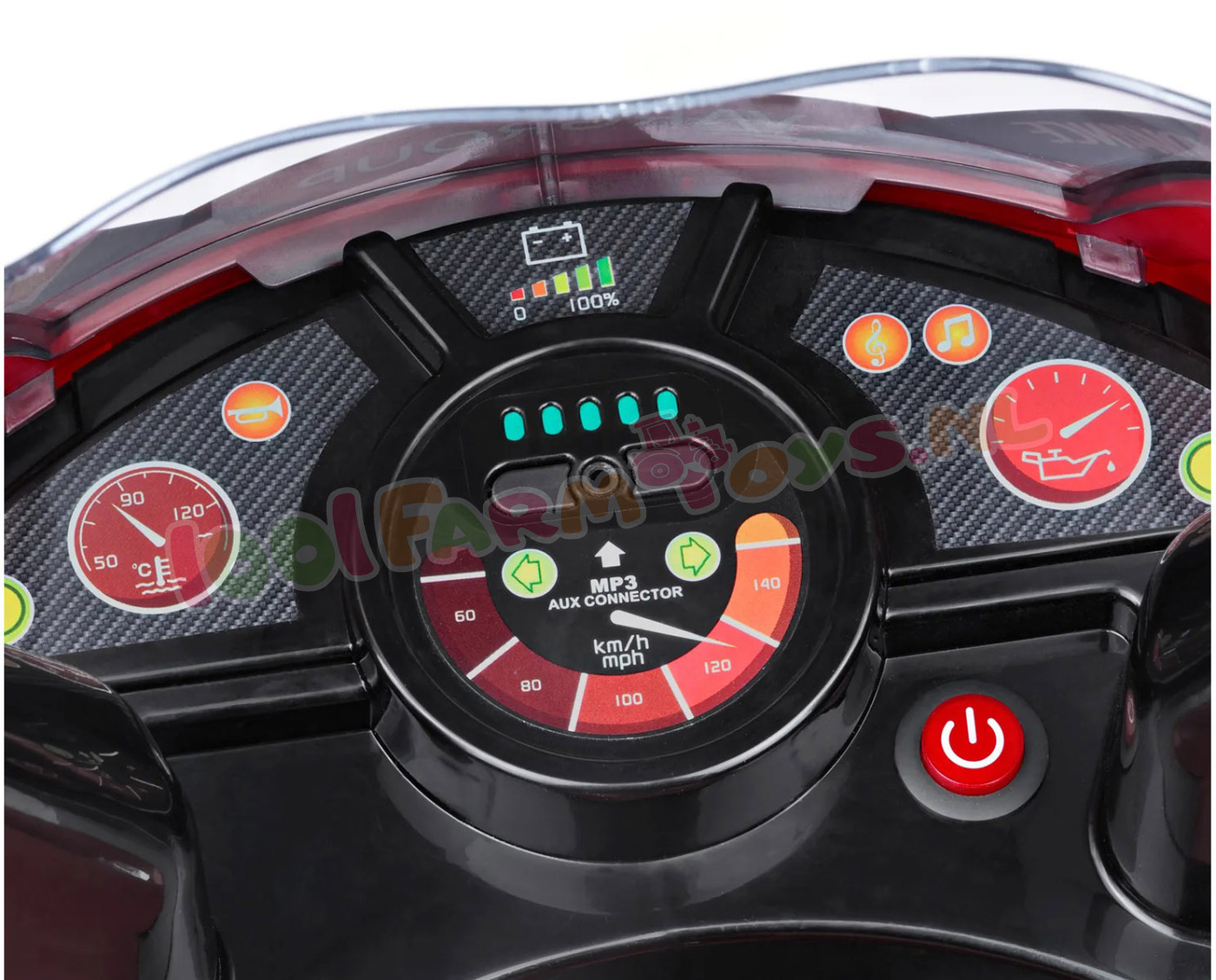 Zet het elektrische dashboard aan door de START-knop te gebruiken of het gaspedaal in te trappen. en je zult versteld staan!! Naast het inschakelen van het LED-lampje op de voorlamp. kan uw kind ook de motor horen brullen. de claxon bedienen en luisteren naar vooraf opgenomen deuntjes. Bovendien kan hij of zij naar zijn favoriete muziek luisteren via een poort voor mp3-spelers (battarijen niet inbegrepen)