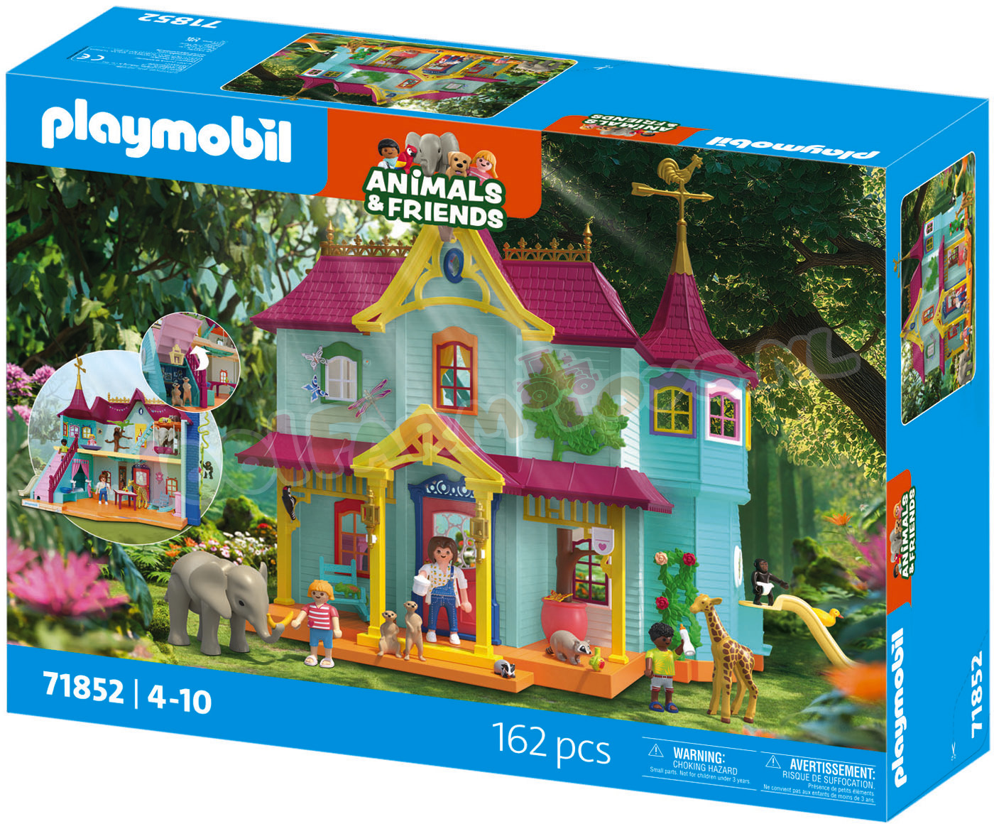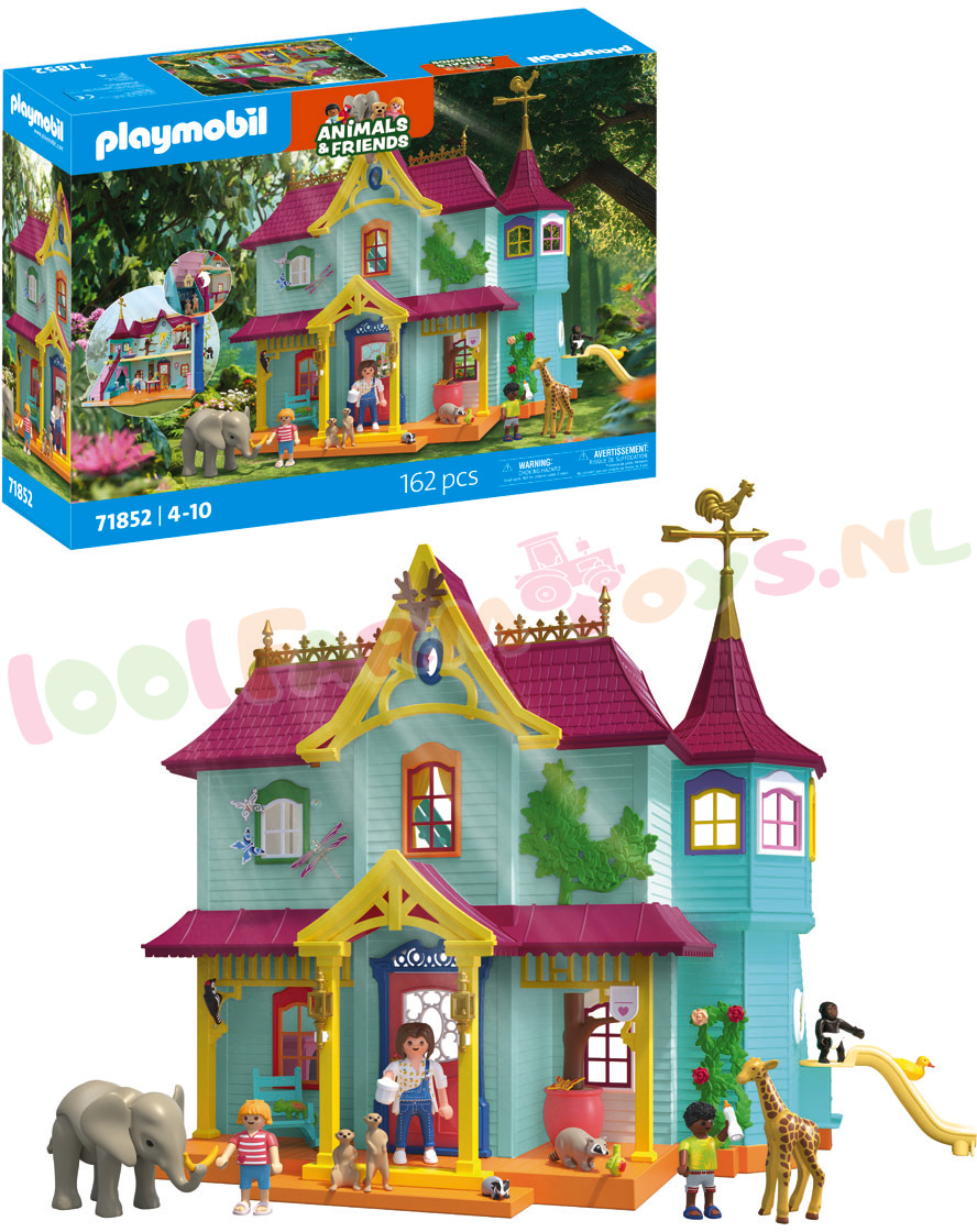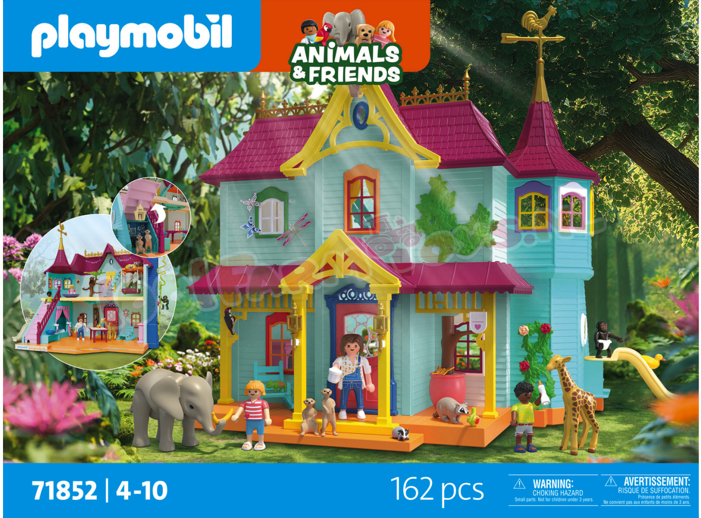 Welkom in de kleurrijke wereld van Animals & Friends – waar het wonderbaarlijke tot het dagelijks leven behoort en de fantasie geen grenzen kent. De kleurrijke. vrolijke villa is het middelpunt van het leven van de dierenvriendin met haar twee kinderen en de lieve dieren die bij hen wonen. Hier heeft iedereen veel plezier en kan iedereen altijd op elkaar rekenen. De kleine olifant helpt ijverig met het dekken van de tafel. terwijl de babygiraffe stiekem lekkernijen uit het hele huis jat. De wasberen ravotten op zolder. de babycheetah vindt schommelen geweldig en het aapje klimt en relaxen het liefst in de boom die vanuit de veranda het huis is ingegroeid. Zoek je het kleine eendje? Dat vermaakt zich prima in de vijver in de kamer. terwijl de stokstaartjes hun favoriete plekje hebben gevonden in hun geheime schuilplaats onder de indrukwekkende trap aan de voorkant. De meest gewilde plek in het hele huis is echter de knusse grot met bed achteraan onder de trap.